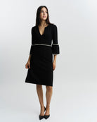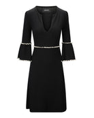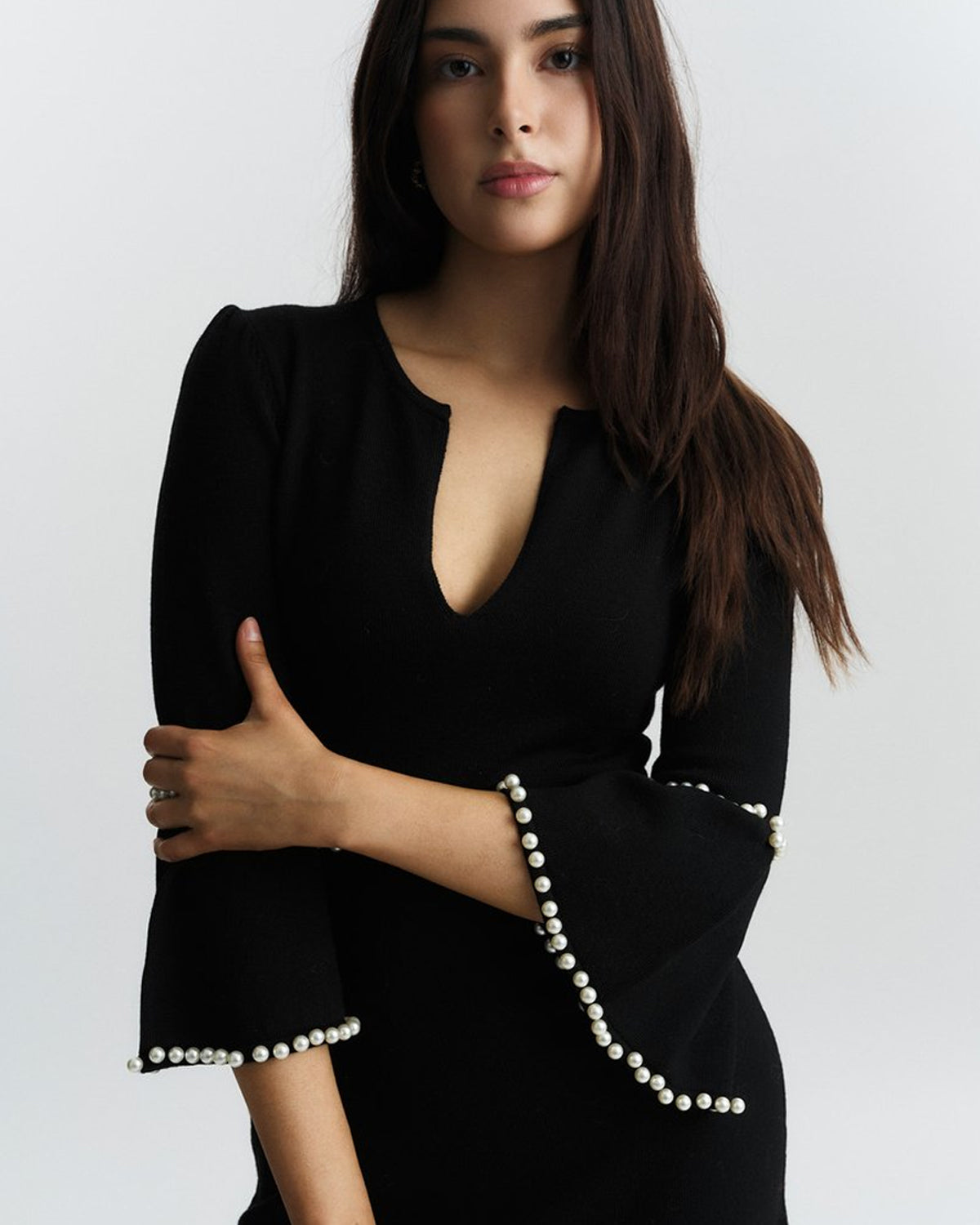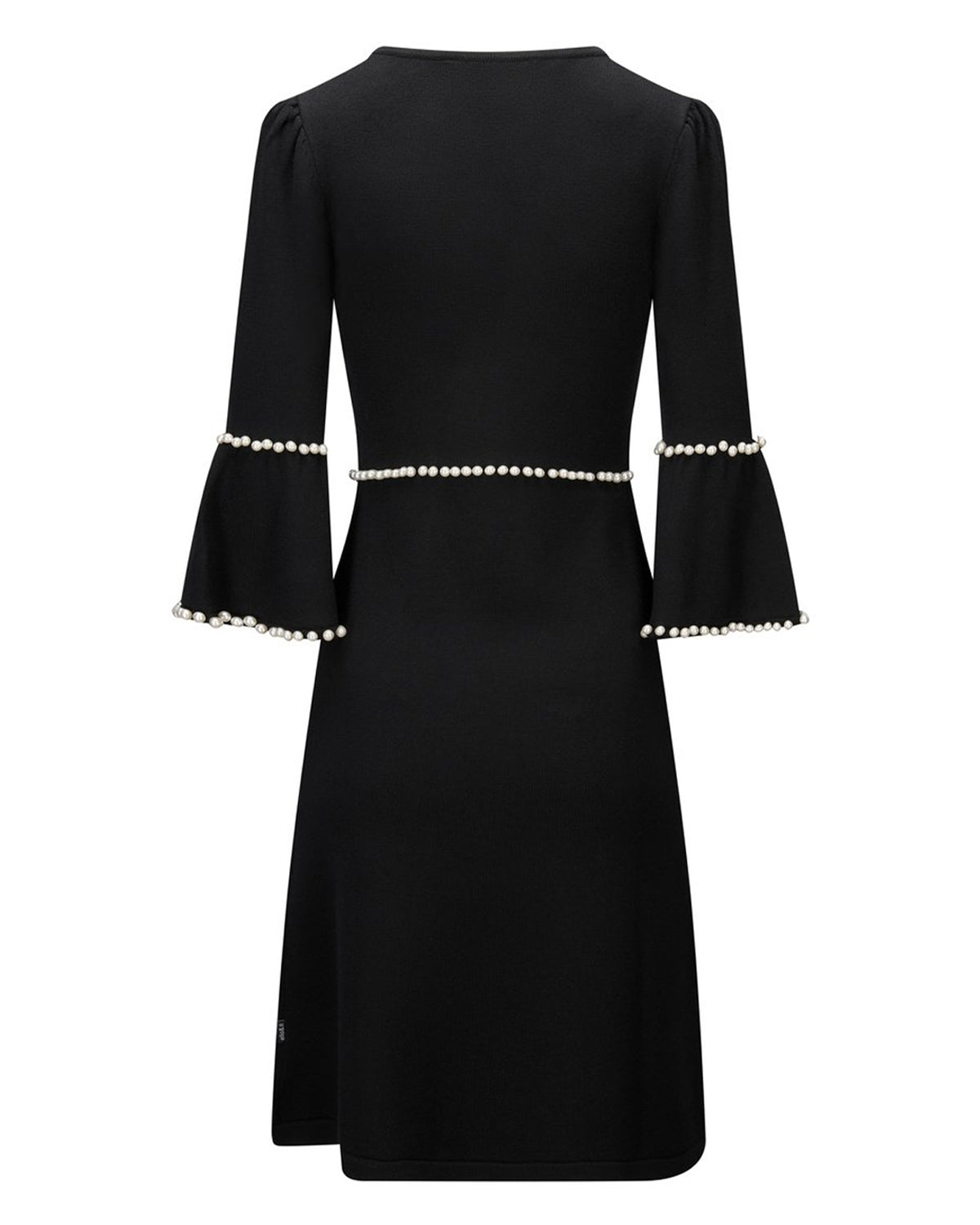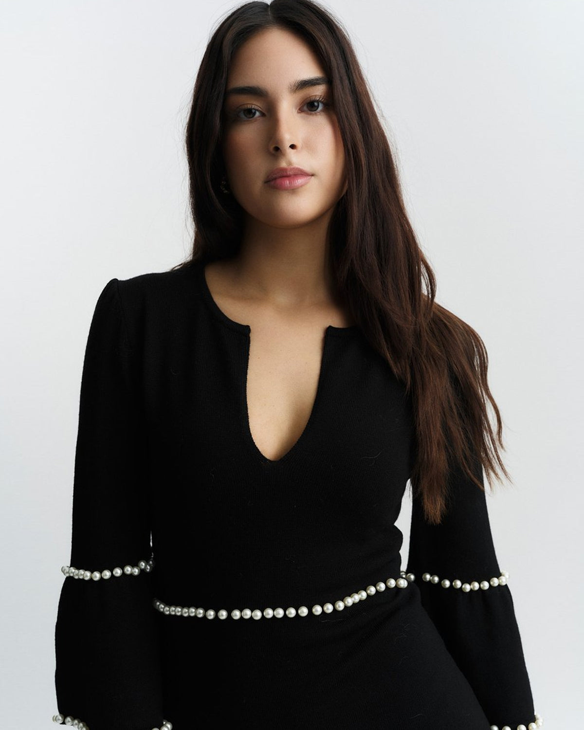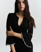 Anna Merino Dress er et tidløst plagg laget av 100 % merinoull, som tilbyr både varme og eleganse. Kjolen har en flatterende A-linjeform, og går rett over kneet for en feminin silhuett. Den har en delikat V-hals og ¾-lange ermer utsmykket med subtile perledetaljer, som gir et raffinert og sofistikert preg. Perfekt for både hverdagsbruk og spesielle anledninger.