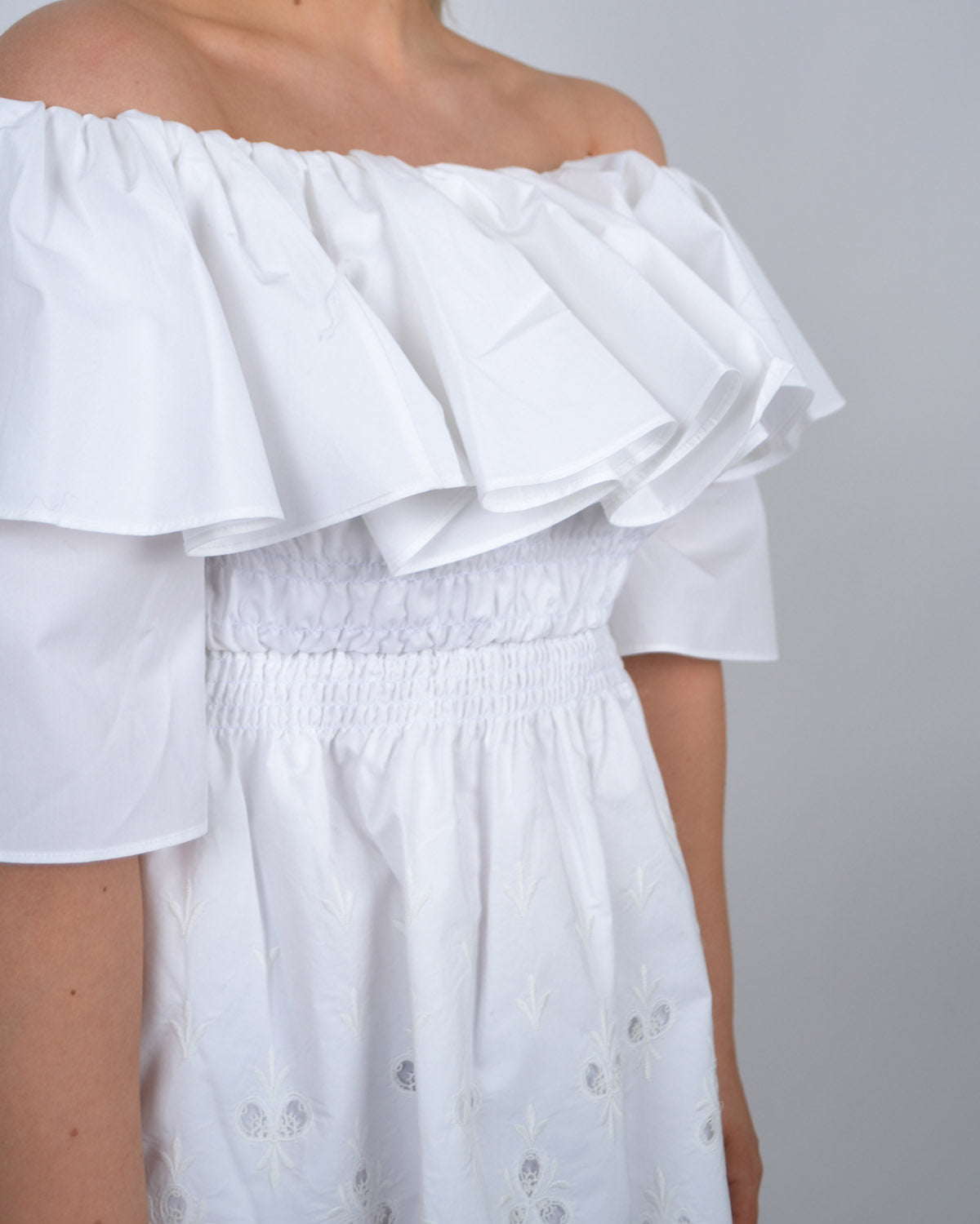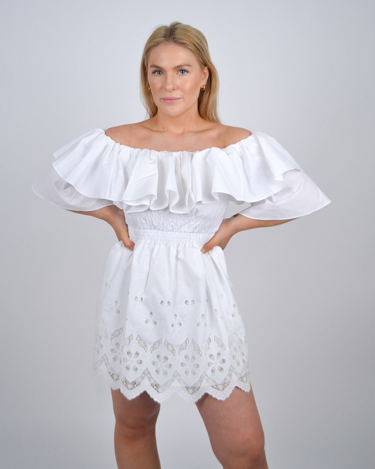 Hvit tunika med blondedetaljer fra Self-Portrait! Off Shoulder Cotton Broderie Tunic kan også brukes som en kort kjole, men kan bli for kort for noen. Tunikaen har nydelige sømdetaljer som skaper en voluminøs overdel, innsvinget midje og løst skjørt. Superfin å style over en lys jeans på de varme dagene!
