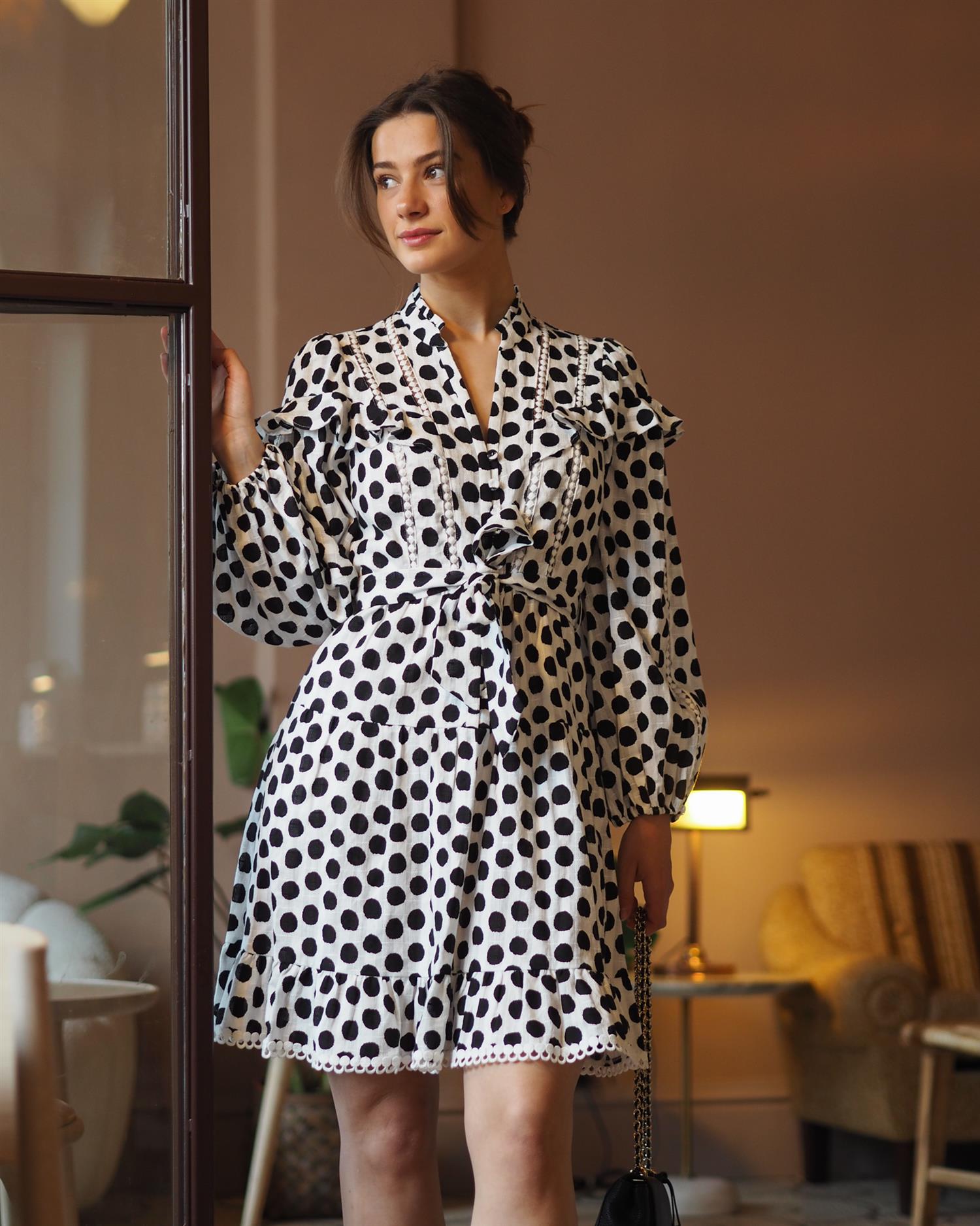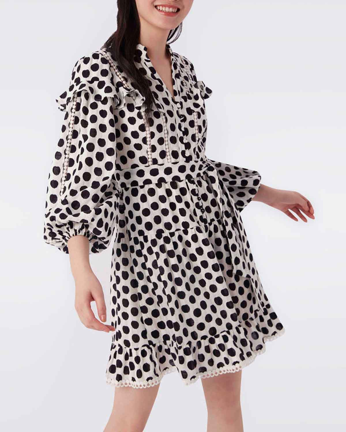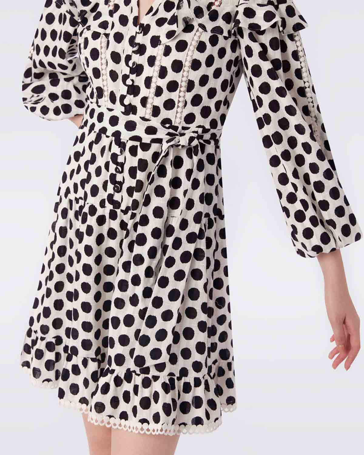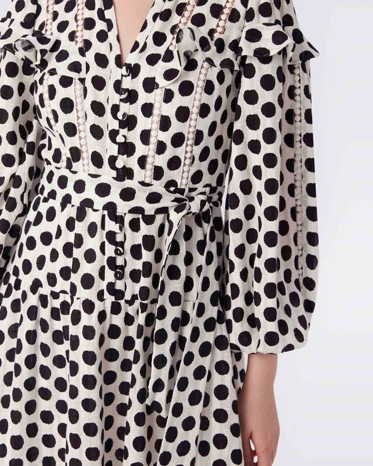 Prikkete kjole i nydelig snitt fra Diane von Furstenberg. Chicago Cotton Dobby Tiered Midi Dress i mønsteret "Abstract Dot Small Ivory" er en hvit kjole med store, sorte prikker. Kolen har flatterende v-utringning, trendy pufferm, innsvinget midje og forseggjorte detaljer med blonder og volanger. Kjolen er perfekt til sommerens festligheter så vel som hverdager med sandaler og sneakers!