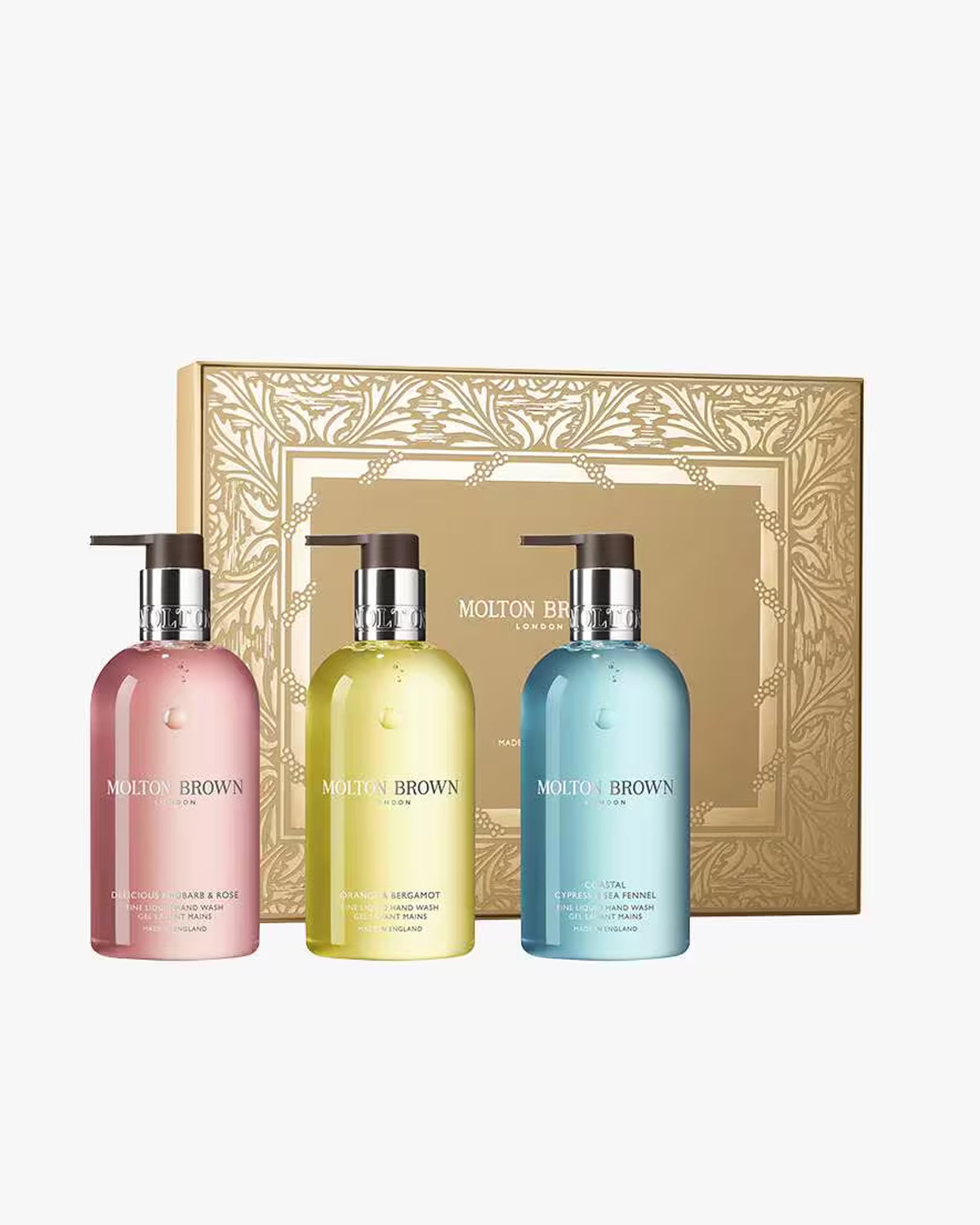 Avdekk en trio av dyptrensende og utsøkt duftende håndsåper som er perfekte for gavesesongen, komplett med tre signaturdufter av gledelig sitrus, rørende treaktige og forfriskende marinenoter. Juleemballasjen vår er utsmykket med et gyllent rottingmønster; håndtegnet som en lett nikk til materialet vi brukte i vår originale salong på South Molton Street fra 1970-tallet.