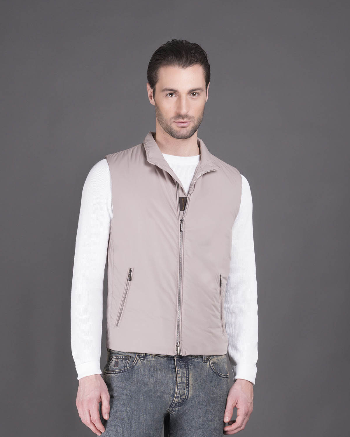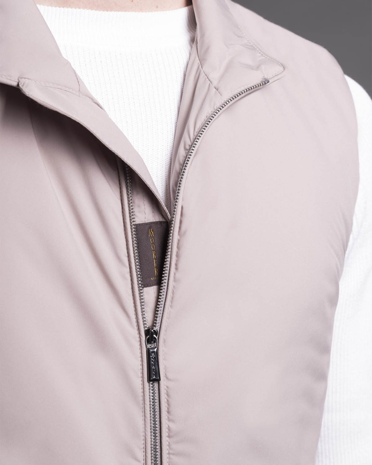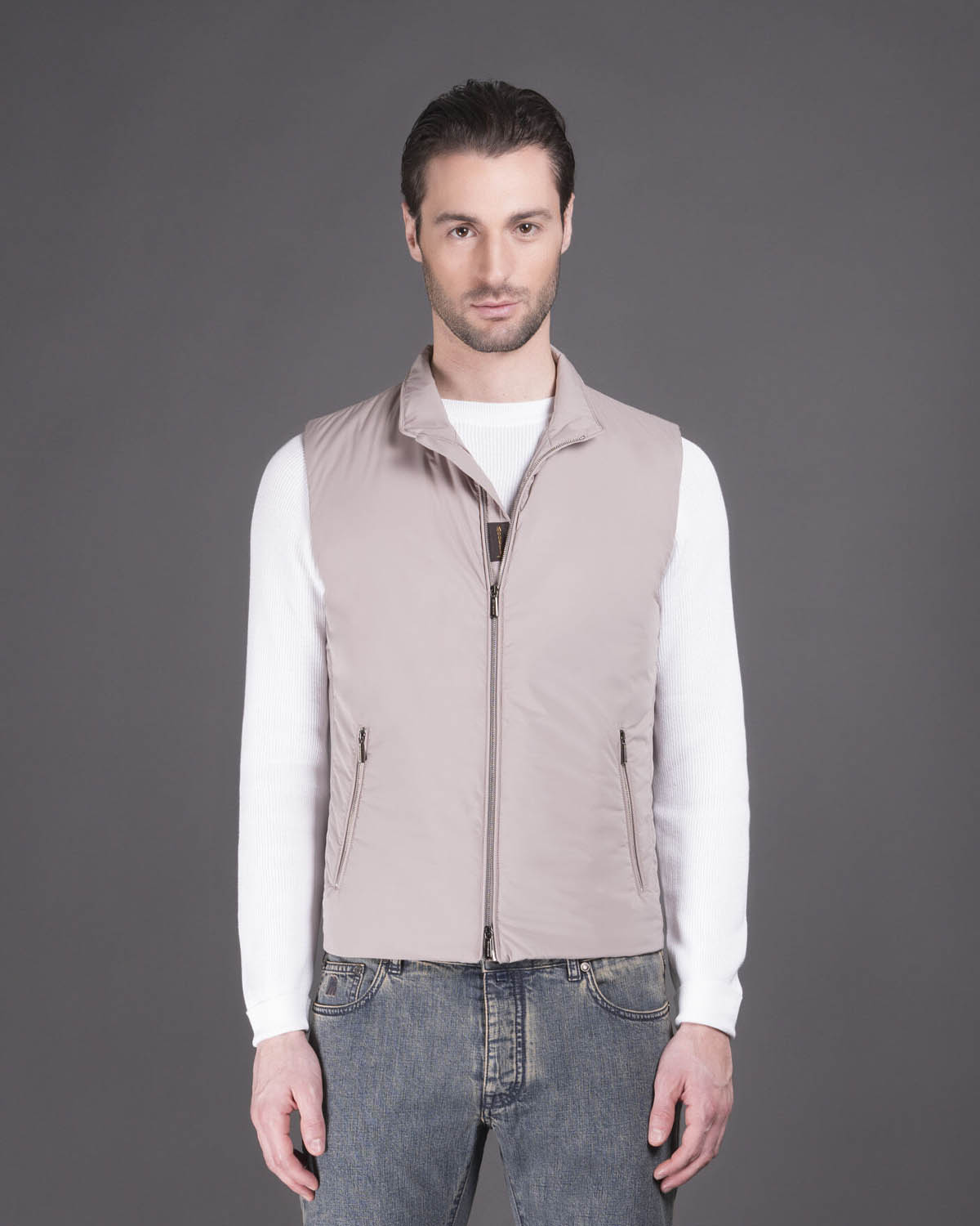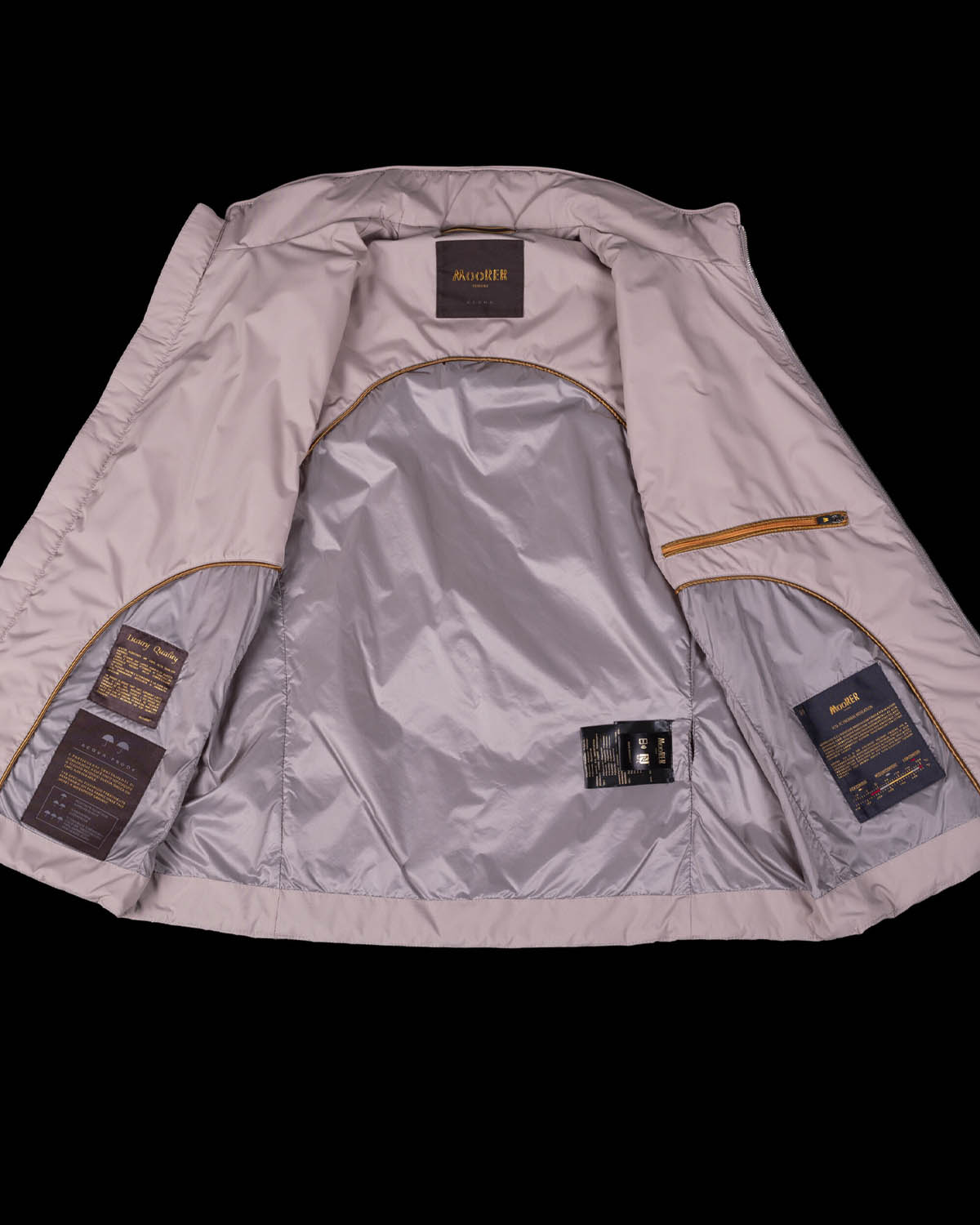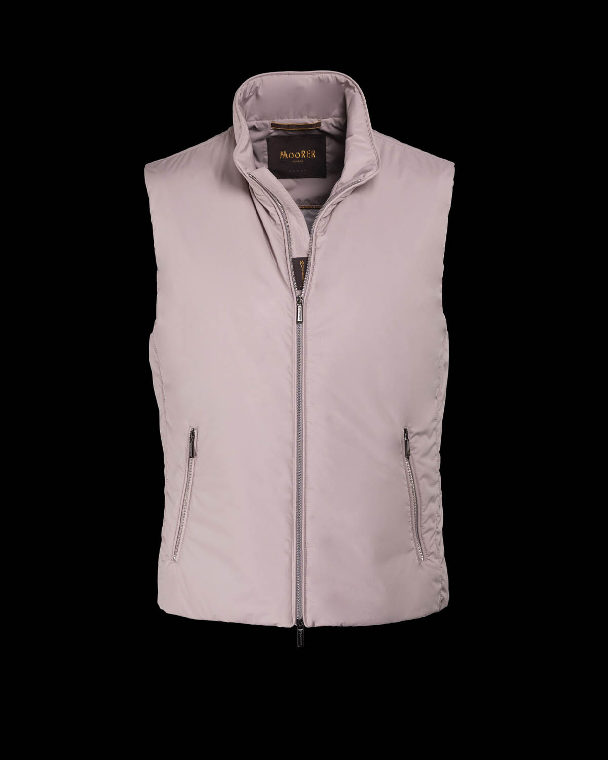 Glatt vest fra Moorer. Aqua Line (2 paraplyer) laget i superlett matt harpiksbelagt vannavstøtende stoff. Foret med syntetisk fjær-effekt polstring.