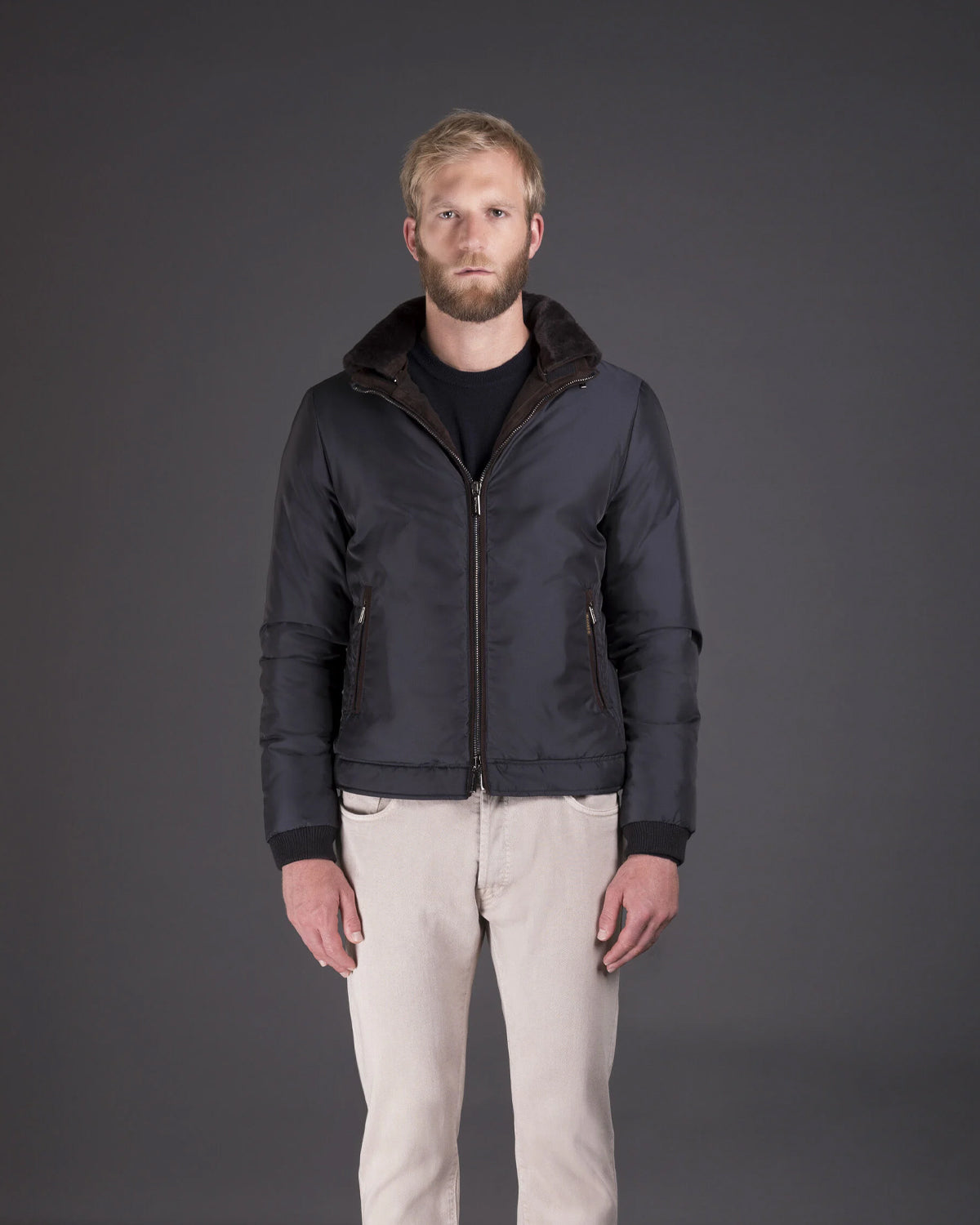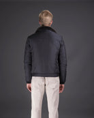 Bomberjakke vattert med gåsedun og laget av formminnende teknisk stoff med en lett harpiks for å gi plagget moderat vannavstøting. Den spesielle behandlingen gir stoffet en lett glans, spesielt fremhevet i mørkere nyanser.
