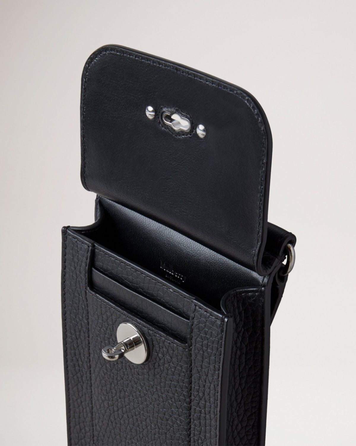 Liten, sort skinnveske fra Mulberry! Mini Antony Black Heavy Grain er den minste modellen i Antony-familien. Vesken er liten og rommer kun det nødvendigste, perfekt for deg som kun trenger mobil, gloss og kort. Mini Antony har en cross body skinnreim, sølvfargede detaljer og lukkes med signaturlåsen Postman's Lock.