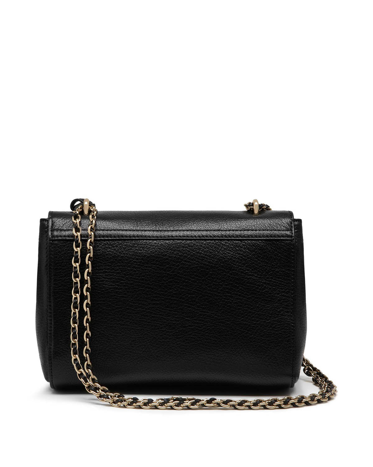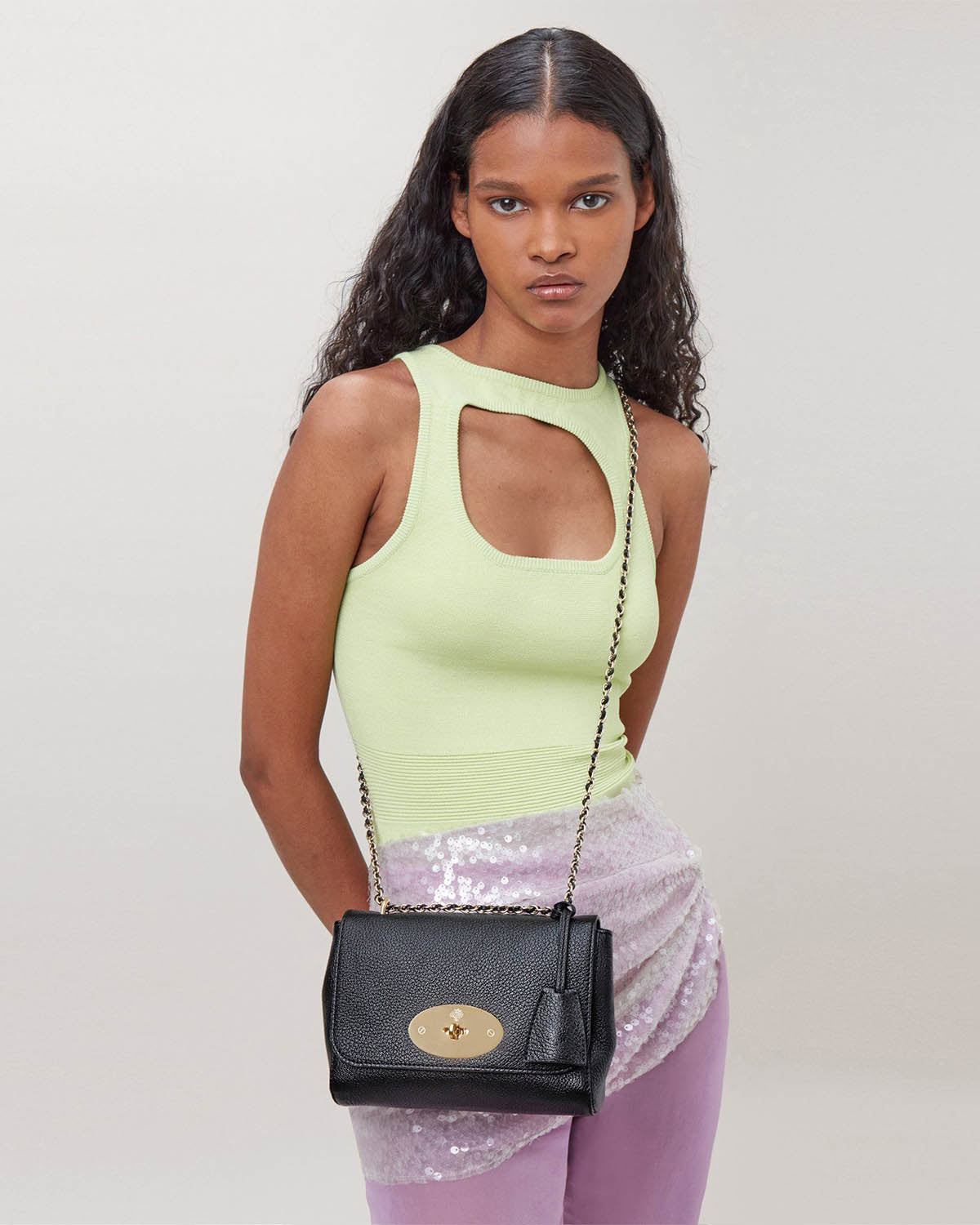 Sort ikonisk veske med gull detaljer fra Mulberry. Lily Glossy Goat black, har et uanstrengt og elegant design. Vesken blir ofte brukt som selskapsveske på grunn av sin størrelsen, men kan fint brukes til hverdags. Lily har en dekorativ lenke som kan bæres cross body, eller dobbelt dersom du vil ha den kortere over skulderen. Lily har den ikoniske låsen Postman's Lock.