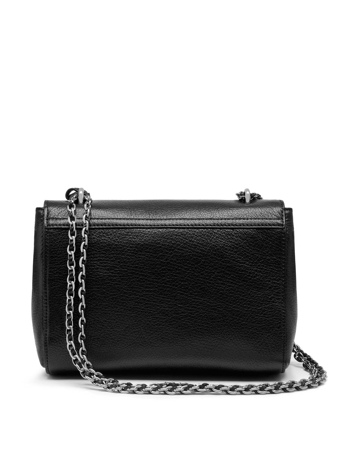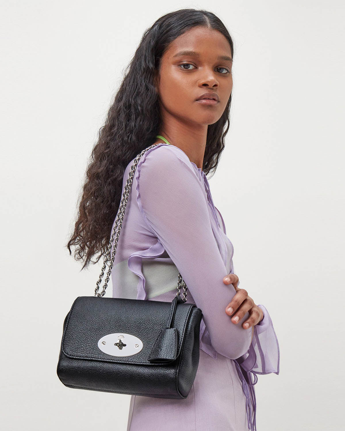 Lily Black Glossy Goat Leather har et uanstrengt og elegant design, og blir ofte brukt som en selskapsveske på grunn av sin praktiske størrelse.