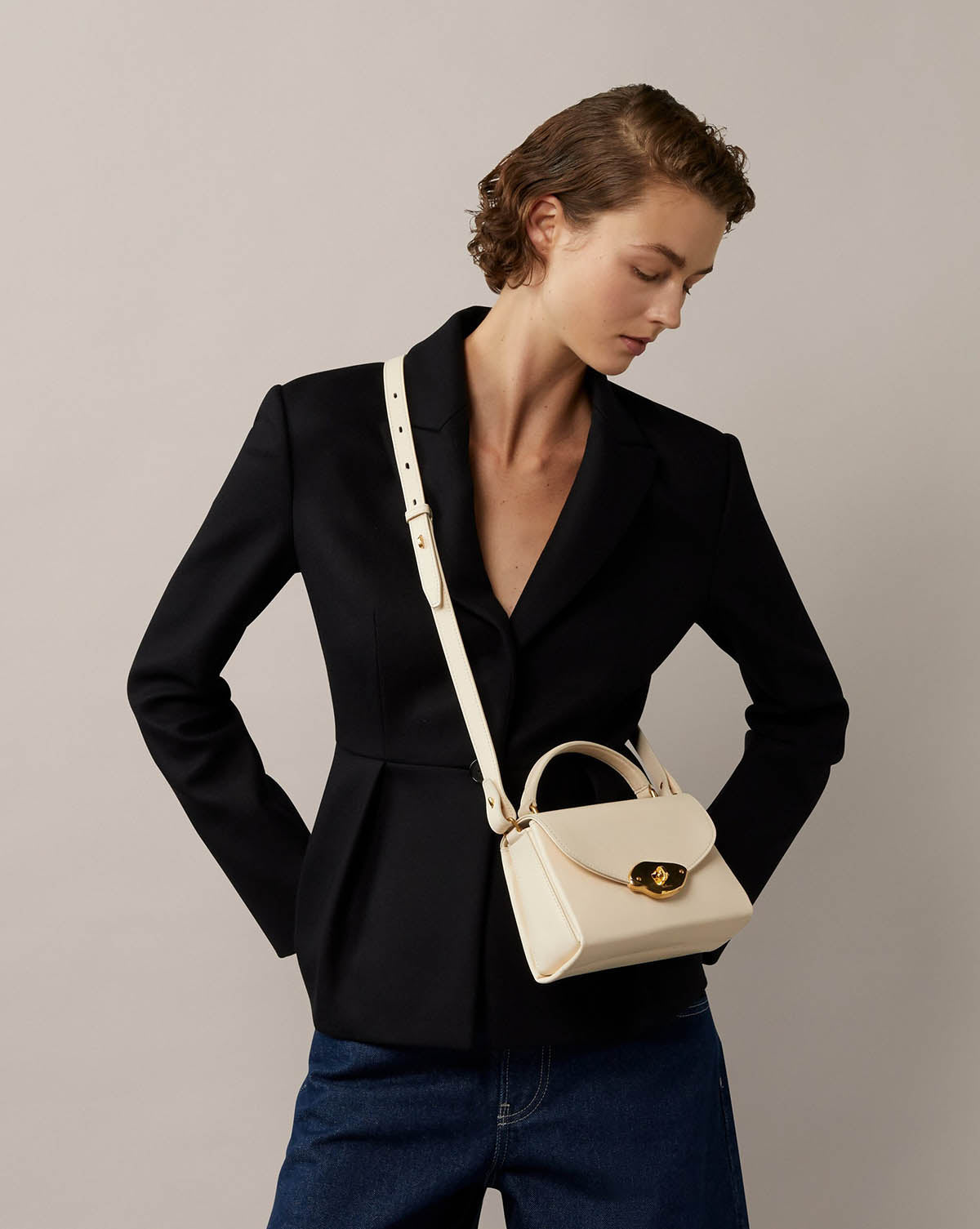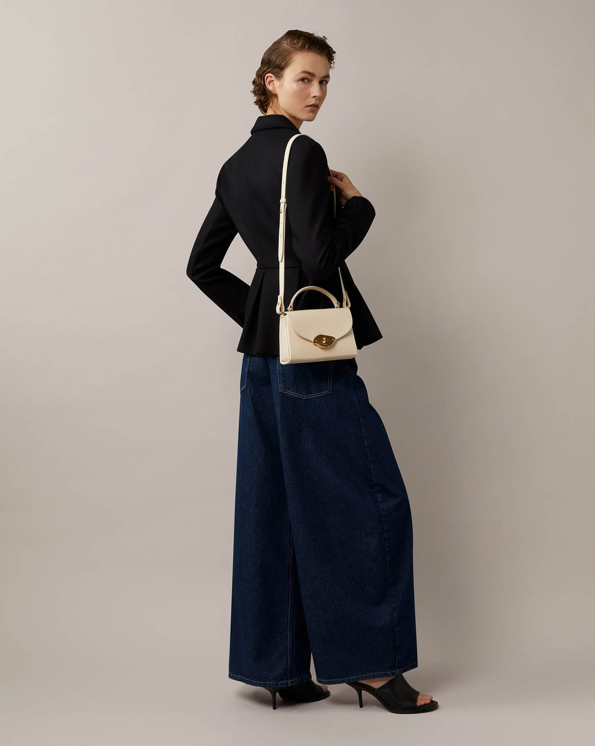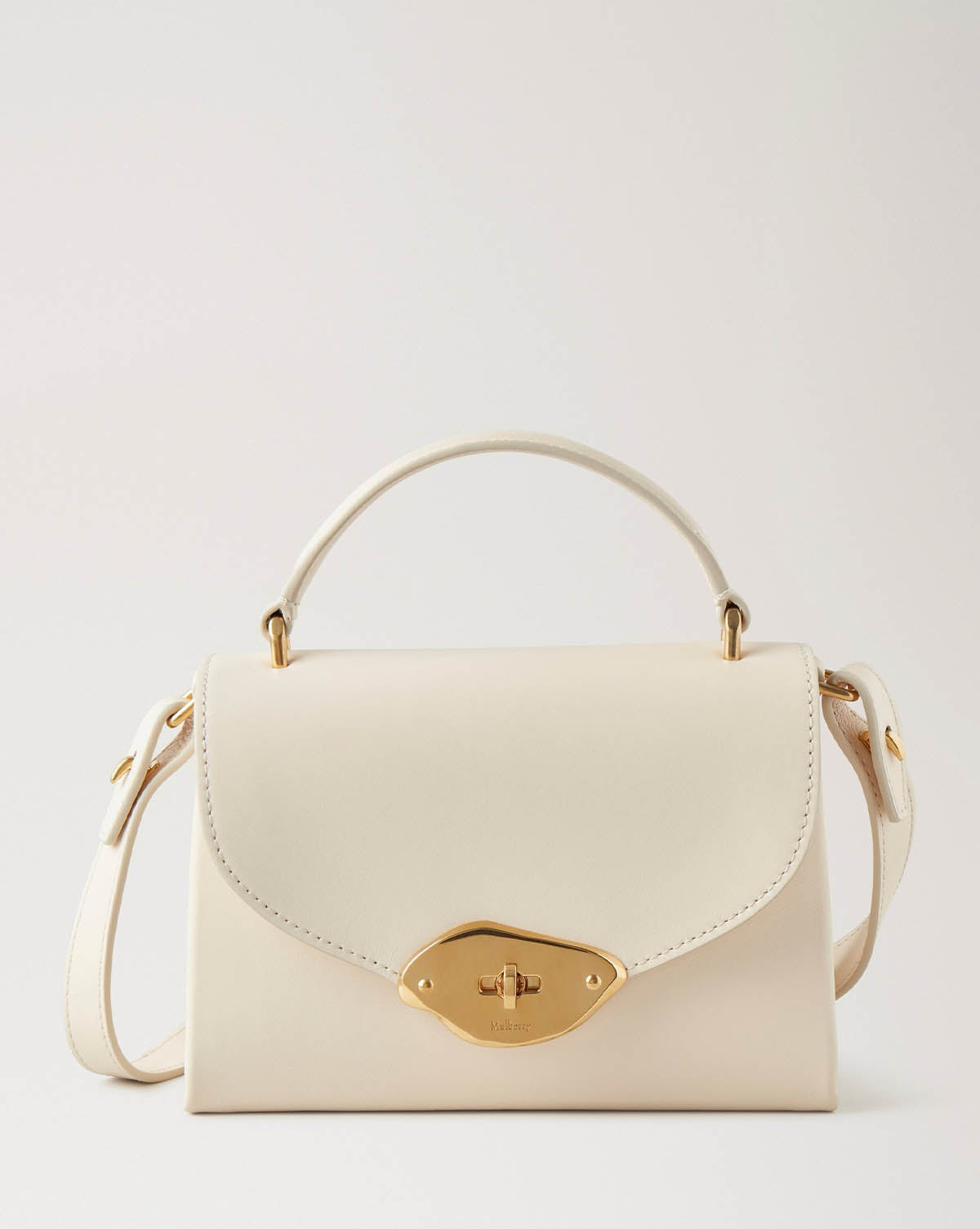 Small Lana Top Handle i fargen Eggshell er det ultimate tilbehøret for dag-til-natt antrekk, kjennetegnet ved sin slanke silhuett og strukturerte, stående håndtak. Denne elegante vesken fremhever deres nye statement-detalj, Foundry Lock – en moderne, surrealistisk vri på den ikoniske Postman's Lock.