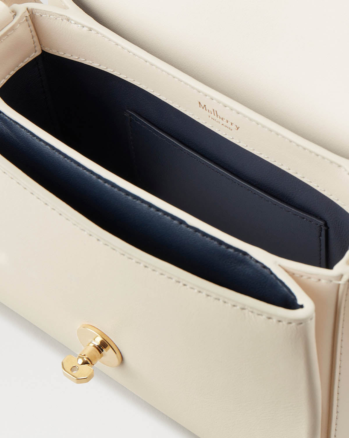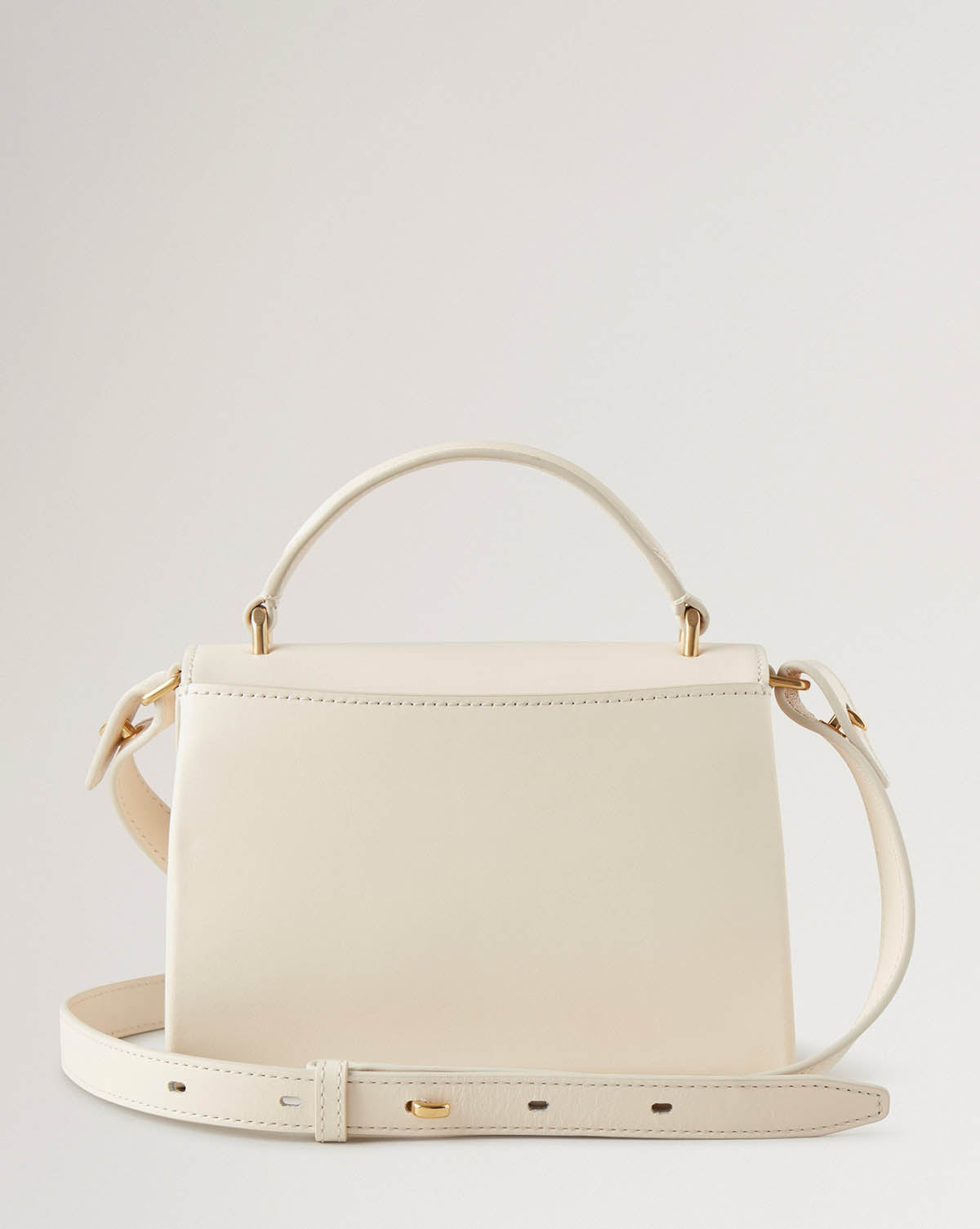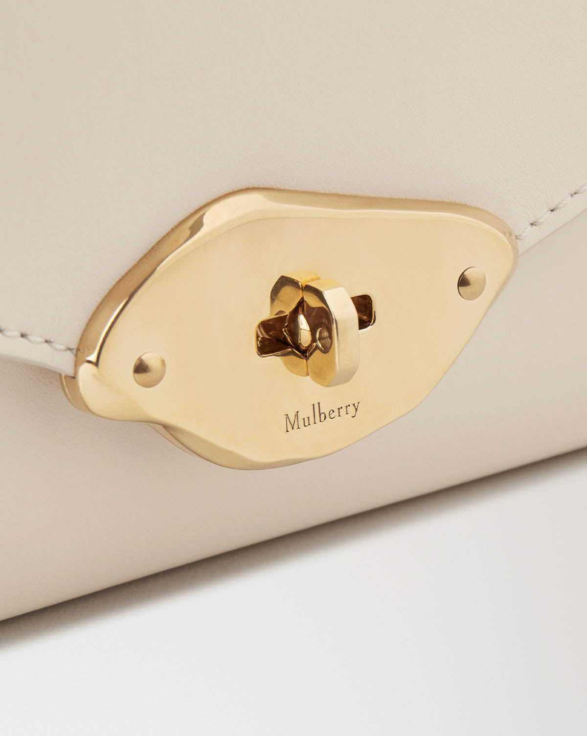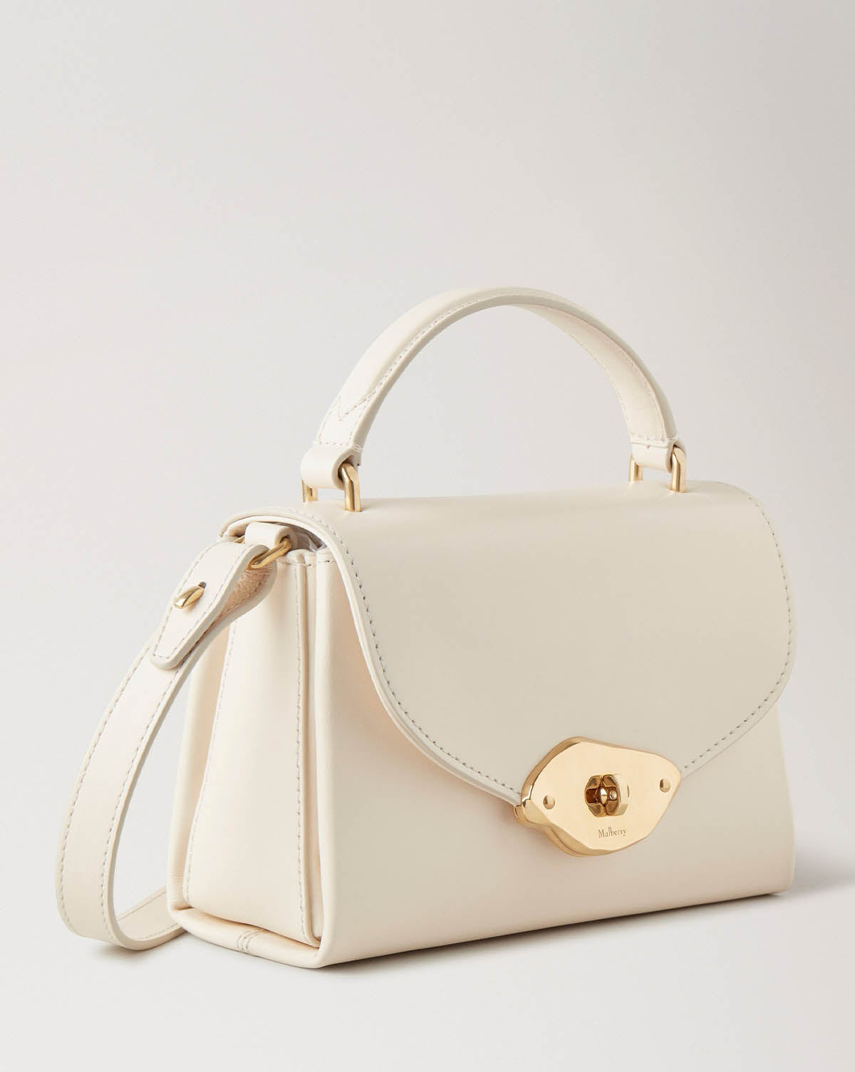 Small Lana Top Handle i fargen Eggshell er det ultimate tilbehøret for dag-til-natt antrekk, kjennetegnet ved sin slanke silhuett og strukturerte, stående håndtak. Denne elegante vesken fremhever deres nye statement-detalj, Foundry Lock – en moderne, surrealistisk vri på den ikoniske Postman's Lock.
