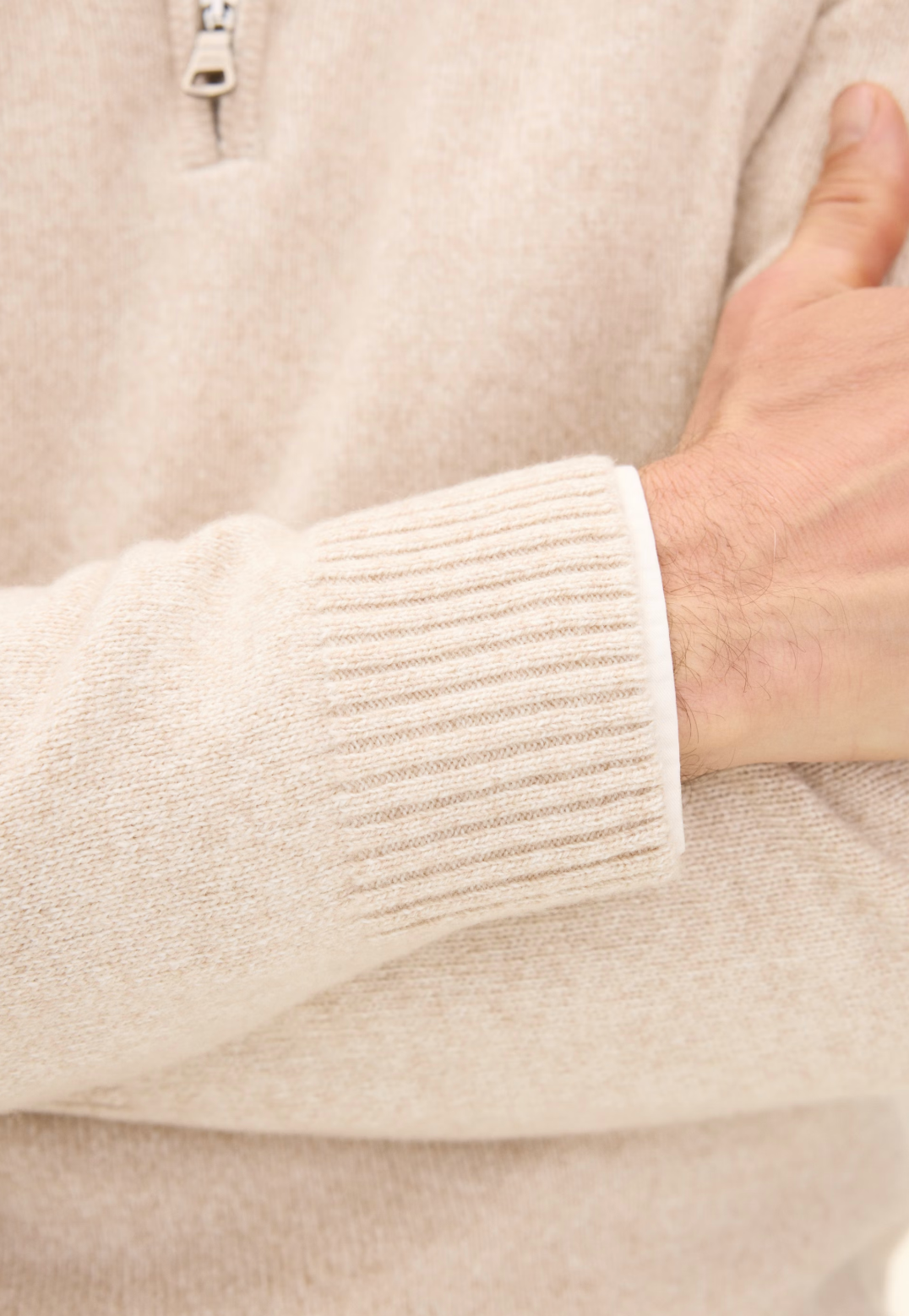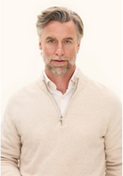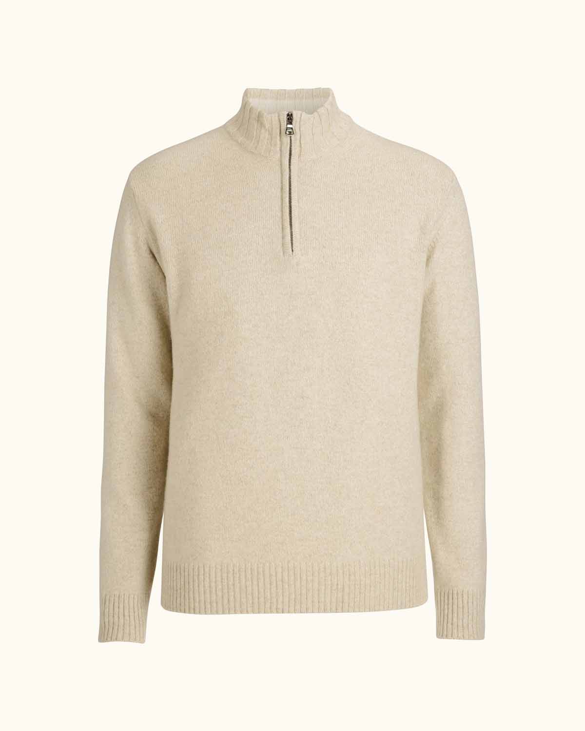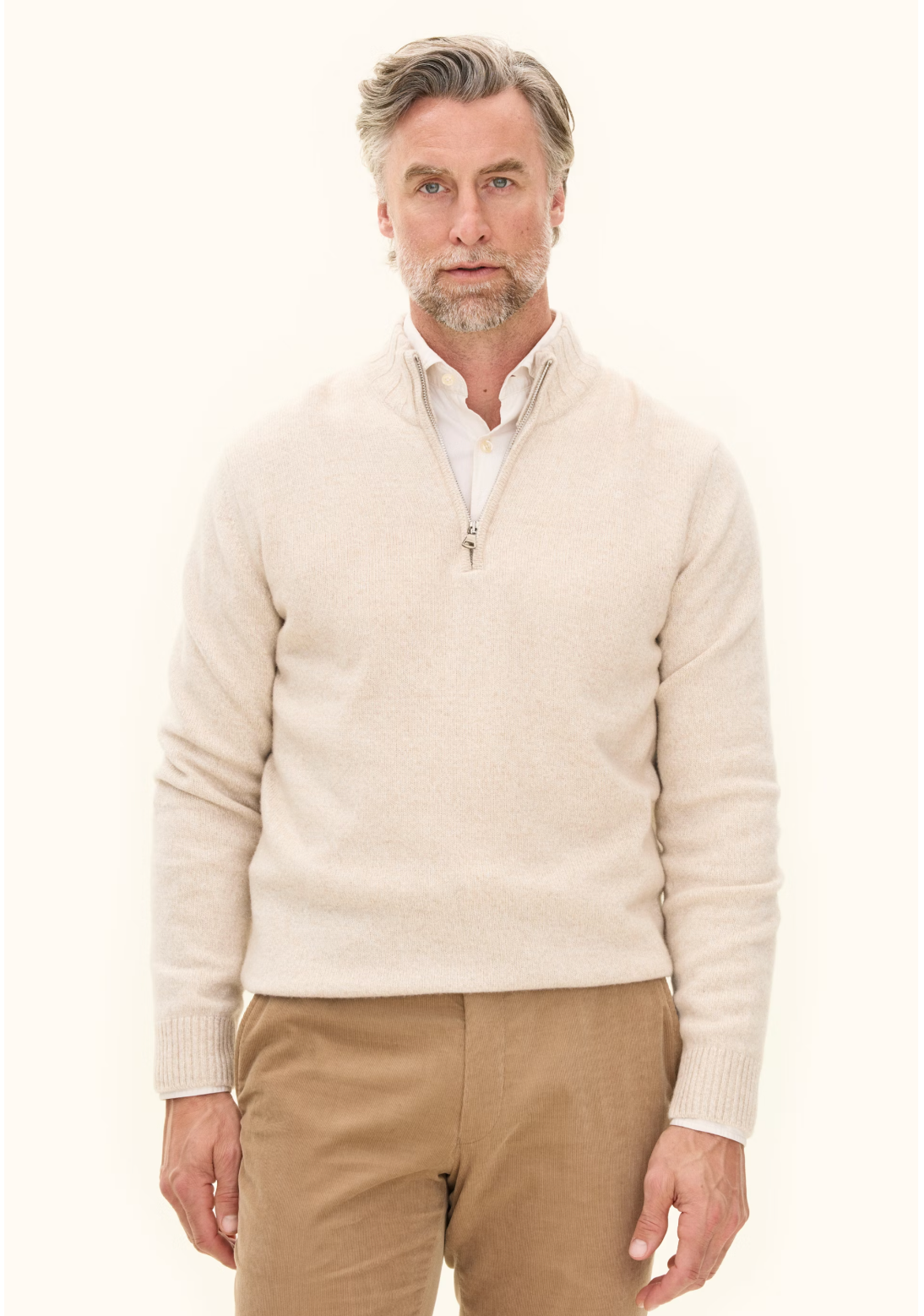 Half zip-genser i fint melert garn, hvor to forskjellige fargede tråder er tvunnet for å skape denne effekten. Innsiden av kragen har ensfarget garn som gir en fin kontrast. Myk og behagelig kvalitet i en blanding av ull, kasjmir og viskose. Strikket i 7gg med 2-lags for en ekstra varmende følelse på kalde dager.