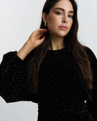 Jamal Stud Velour Dress er laget av elastisk velour med små nagledetaljer for et stilig preg. Den har rund halsutringning, lange puffermer og en tettsittende midje med rynker i sidene for en flatterende passform. Det avstivede plisserte panelet nederst gir bevegelse, mens en glidelås midt bak gjør den enkel å bruke. En moderne kjole med lekne og elegante detaljer.