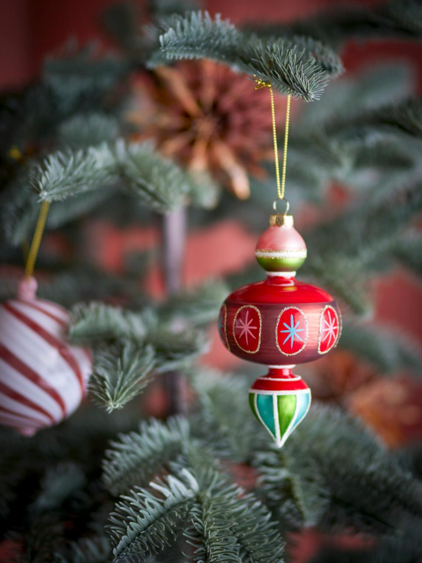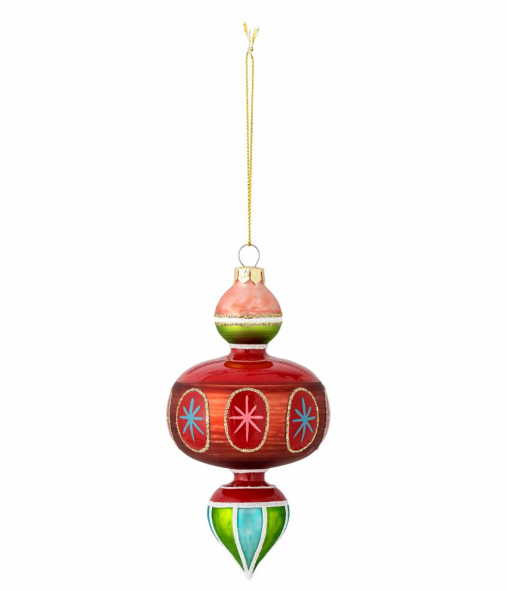 Kota Ornament fra Bloomingville er laget av glass og håndmalt i nyanser av rødt, blått og grønt. Heng julekulen på den gyldne snoren og la den pryde juletreet eller i vinduet. De håndmalte detaljene gjør hvert ornament unikt.