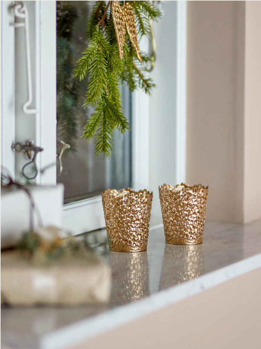 Mizou telysholdere fra Bloomingville er et sett med to stilige holdere, laget av metall med spraymalt gullfinish. Den perforerte overflaten lar lyset skinne vakkert gjennom når et telys tennes, og skaper en koselig og varm atmosfære. De er perfekte som dekorative elementer som setter et elegant preg på interiøret.