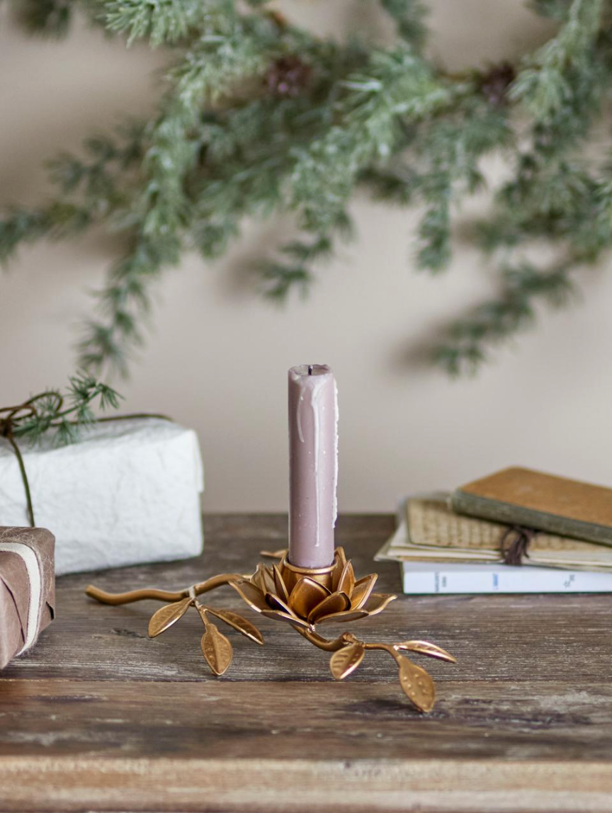 Gretchen-lysestaken fra Bloomingville viser en blomstrende rose, og er laget av metall med en vakker gullfinish. Perfekt som et dekorativt element på middagsbordet, en hylle eller i vinduskarmen, hvor det gir varme og eleganse til innredningen din. Perfekt som en del av julepynten eller som et stilig tillegg til dekoren hele året.