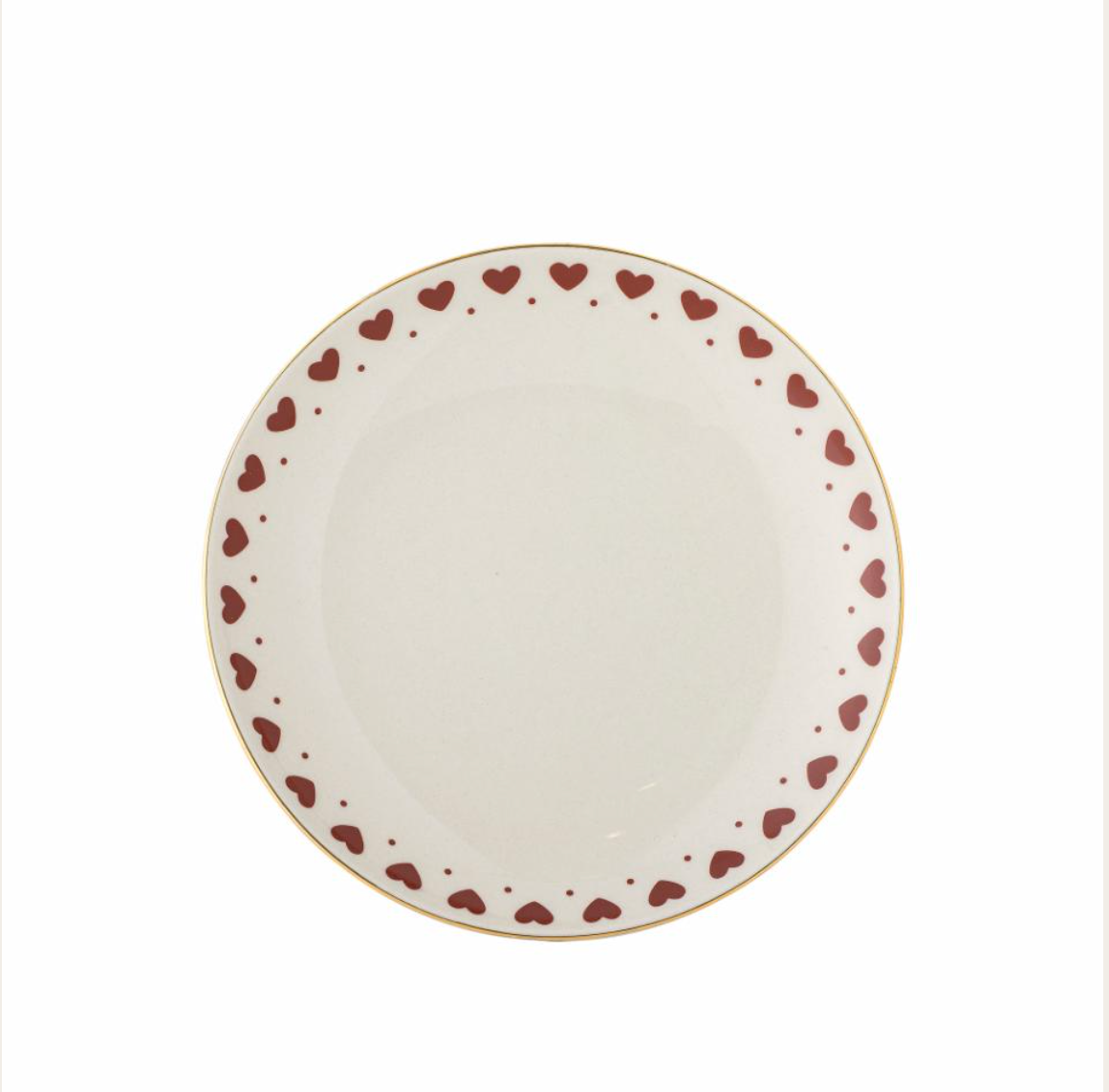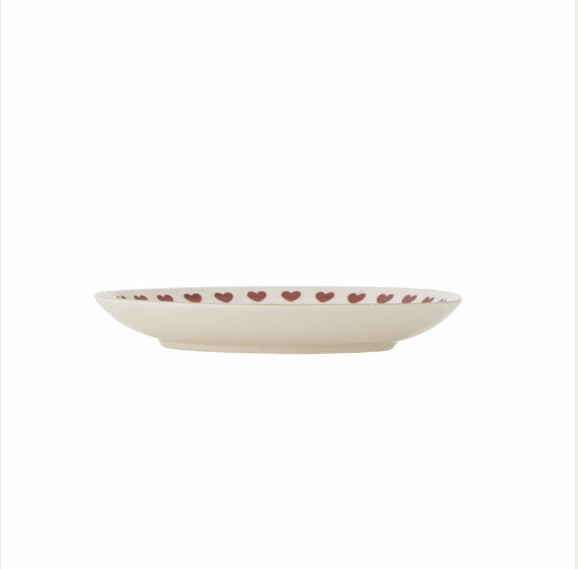 Jolly Plate fra Bloomingville er en elegant desserttallerken med trykt hjertemotiv. Den gylne, håndmalte kanten gir et sjarmerende uttrykk til borddekkingen og sørger for at hver tallerken er unik. Platen er perfekt for både hverdags og festlige anledninger, og skaper en varm og innbydende atmosfære.