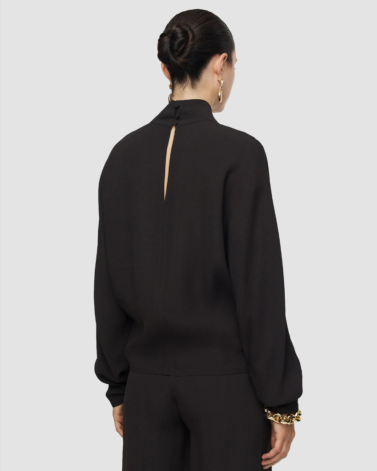 Buick Crepe Blouse er en bluse med avslappet passform, laget av en ansvarlig viskoseblanding for en luksuriøs følelse og et mykt fall. Traktutringningen og de lange dolman-ermene gir silhuetten en skulpturell mykhet og eleganse. Innsiden av denne toppen er ferdig med en glatt satengbakside som føles silkemyk og behagelig mot huden.