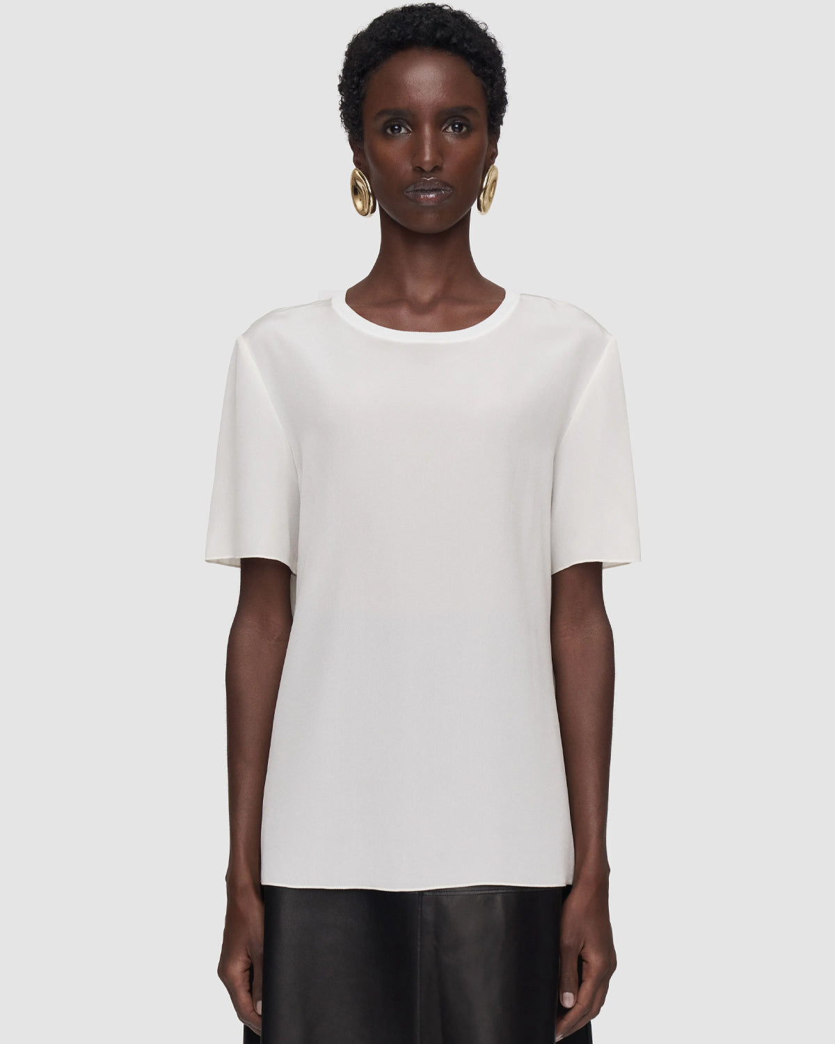Rubin Crepe de Soie silkebluse er en vanlig passform, rett topp, laget av en lett silkecrepe. Denne uunnværlige stilen er en forhøyet vri på hverdags-T-skjorten; minimalistisk og sprø finish med en ton-i-ton ribbet halsringning.