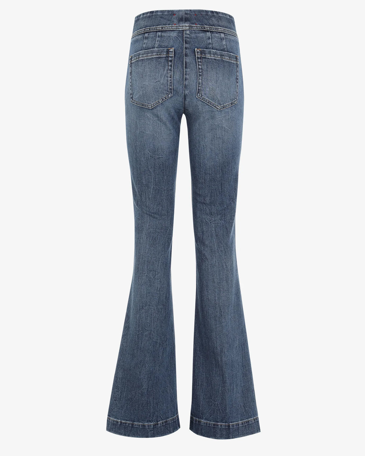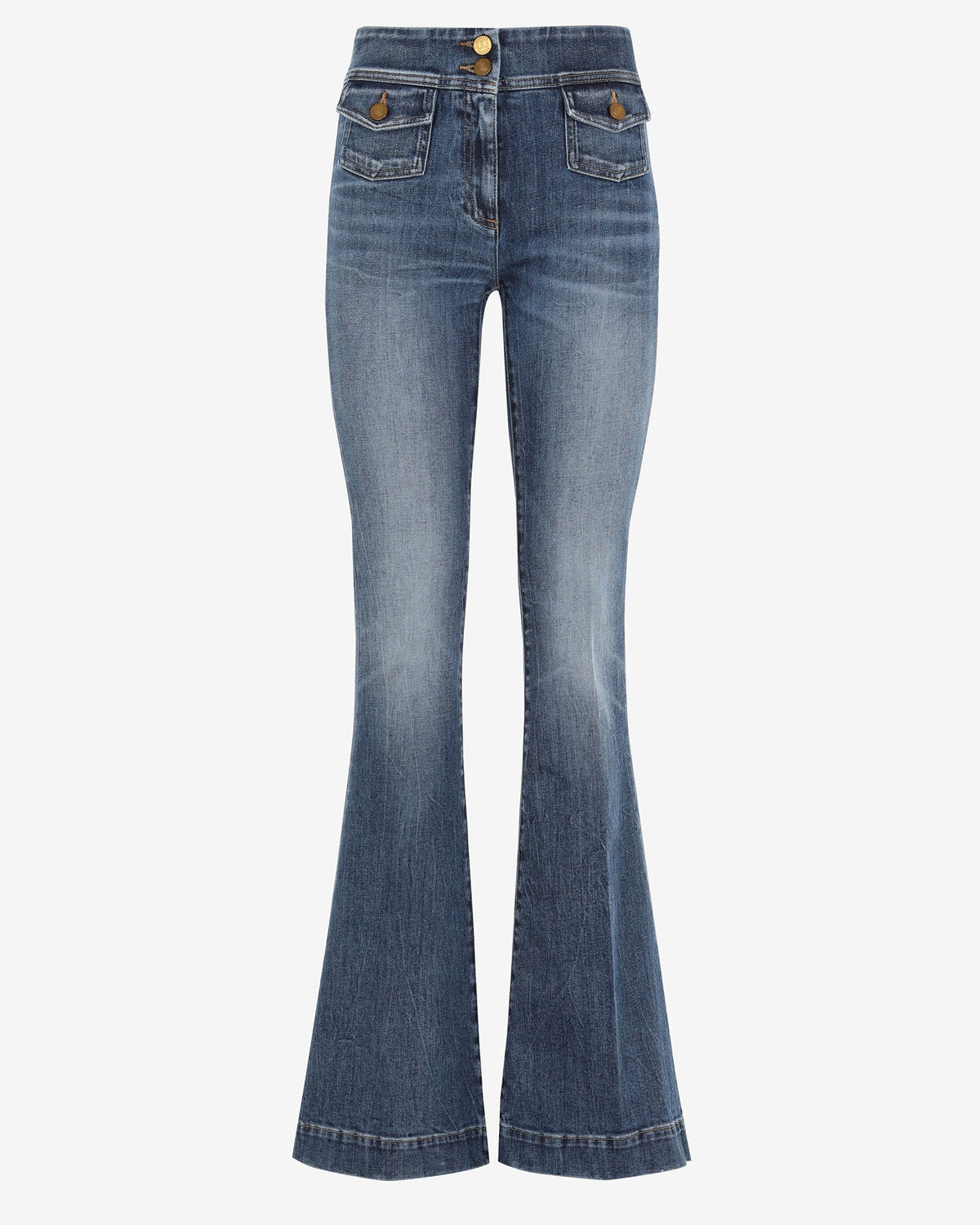 EMI er en utsvingt jeans med to baklommer og to klaffdetaljer foran (smykkelommer) med knapper.