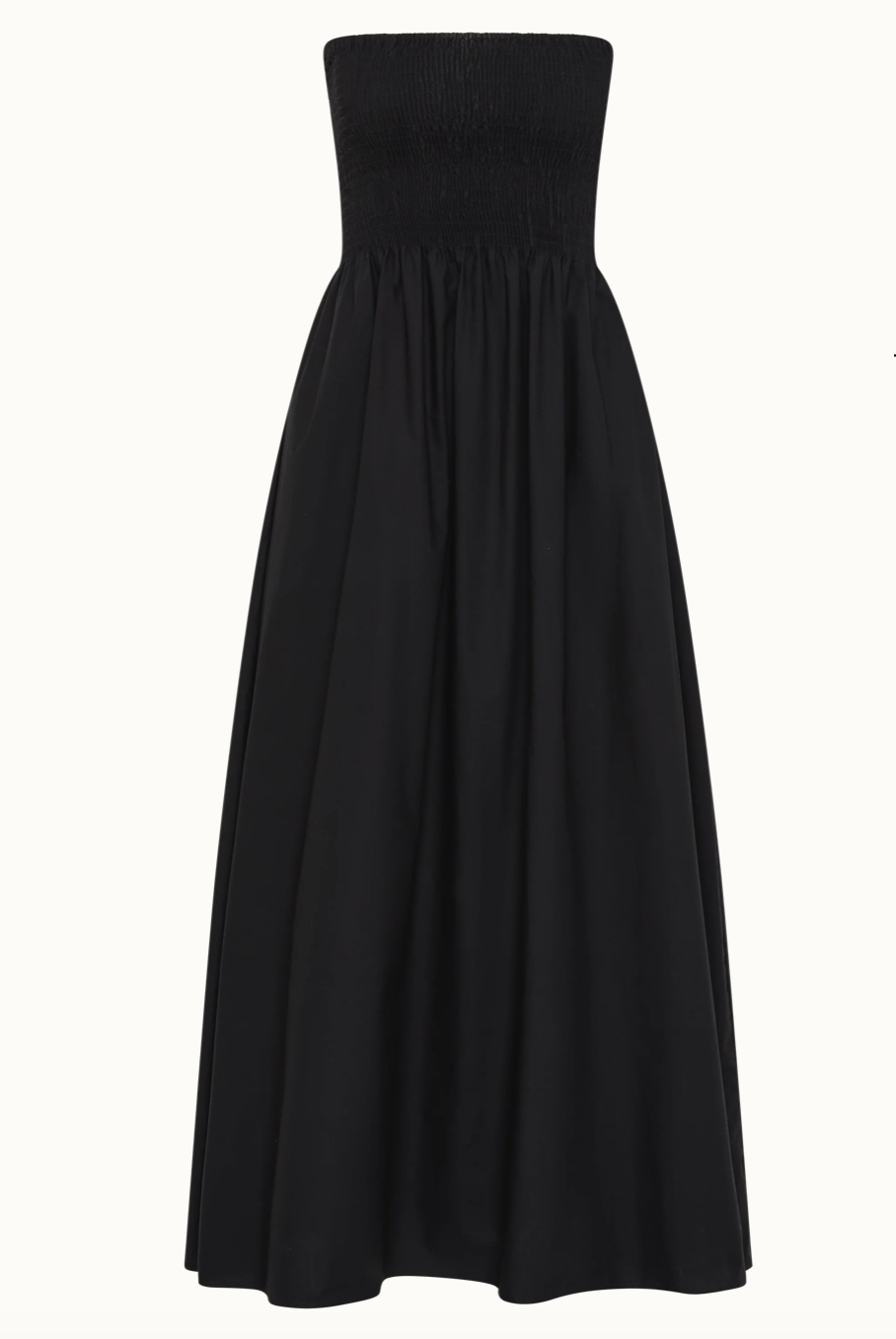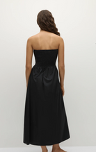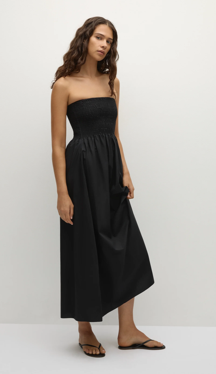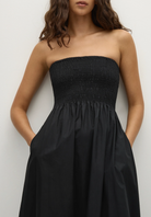 En signatur FAITHFULL-silhuett, gjenskapt med nye, forhøyede detaljer og designet av 100 % bomull. Det er en stroppeløs feriekjole i en klassisk svart fargekombinasjon for et elegant og avslappet uttrykk. Den er rynket gjennom livet, som fører til en samlet midje og et A-formet skjørt som går rett over anklene. Style med en enkel sandal for bruk på stranden eller baren.