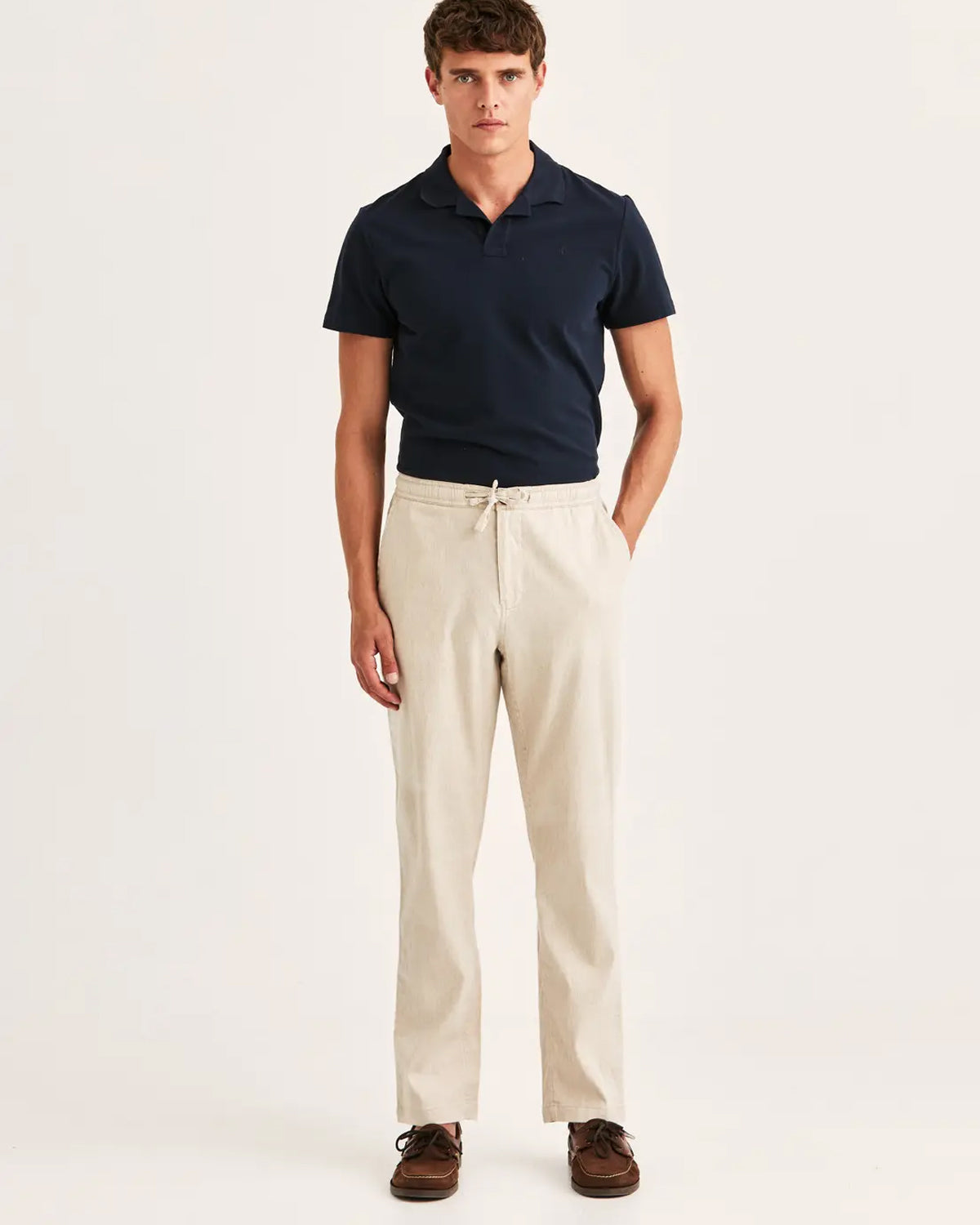 Fenix Linen-buksen er laget av en pustende blanding av bomull, lin og stretch for komfort som tåler varmt vær. Den er tilgjengelig i både ensfargede toner og en raffinert blå-hvit pinstripe, og fanger den avslappede essensen av sommerskreddelse. Den elastiske linningen med snøring sikrer en perfekt passform. Kombiner med en linskjorte eller piké for uanstrengt eleganse.