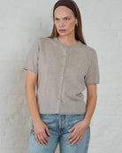 En cardigan med korte ermer og normal passform som holder seg gjennom hele dagen. Laget av 80% ull og 20% polyamid, noe som gir en myk følelse mot huden samtidig som den holder formen. Den runde halsen og knappelukking gjør den lett å ta av og på. Materialet er pustende og behagelig, perfekt når temperaturen varierer gjennom dagen.