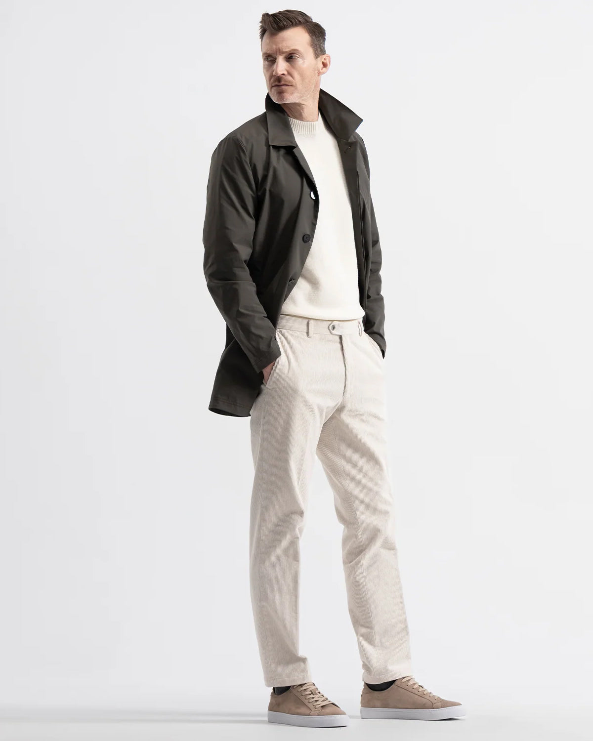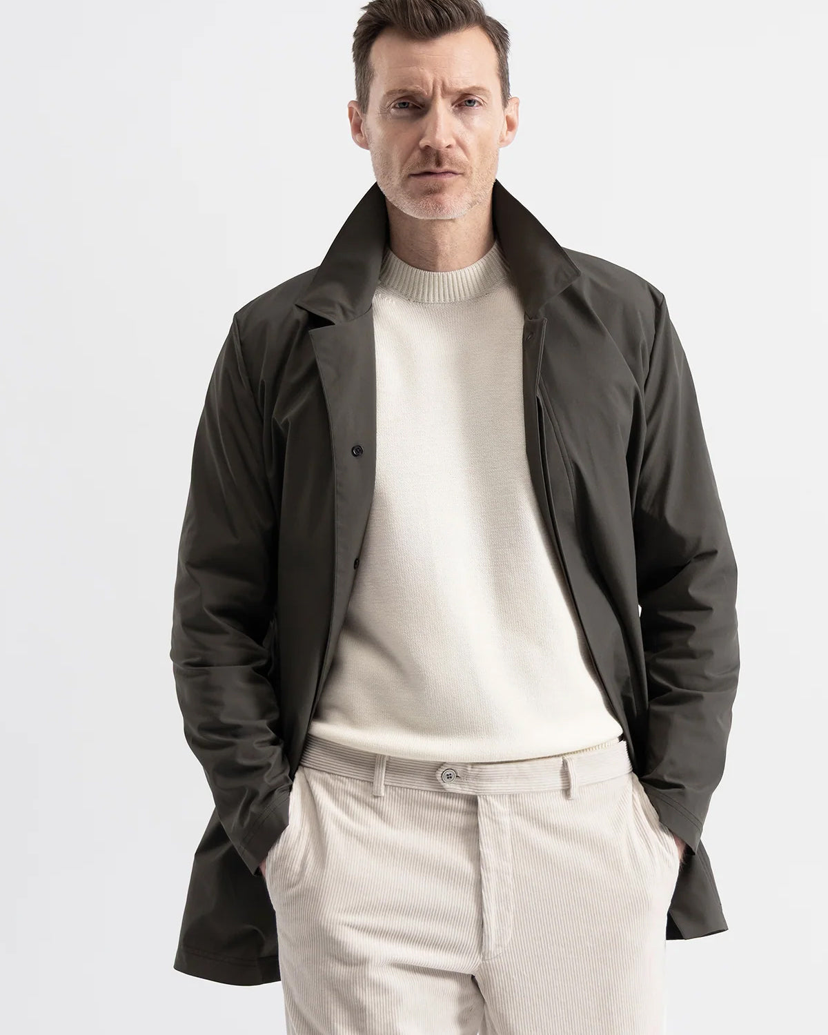 Raffinert, lett vårfrakk for profesjonelle på farten. Høyytelses stretchstoff holder den rynkefri og skarp. En skreddersydd passform og praktiske knapper gjør den til den perfekte reisefrakken.