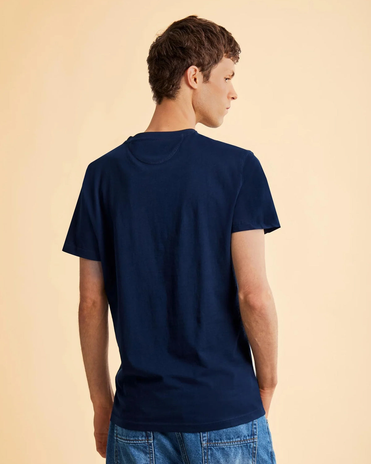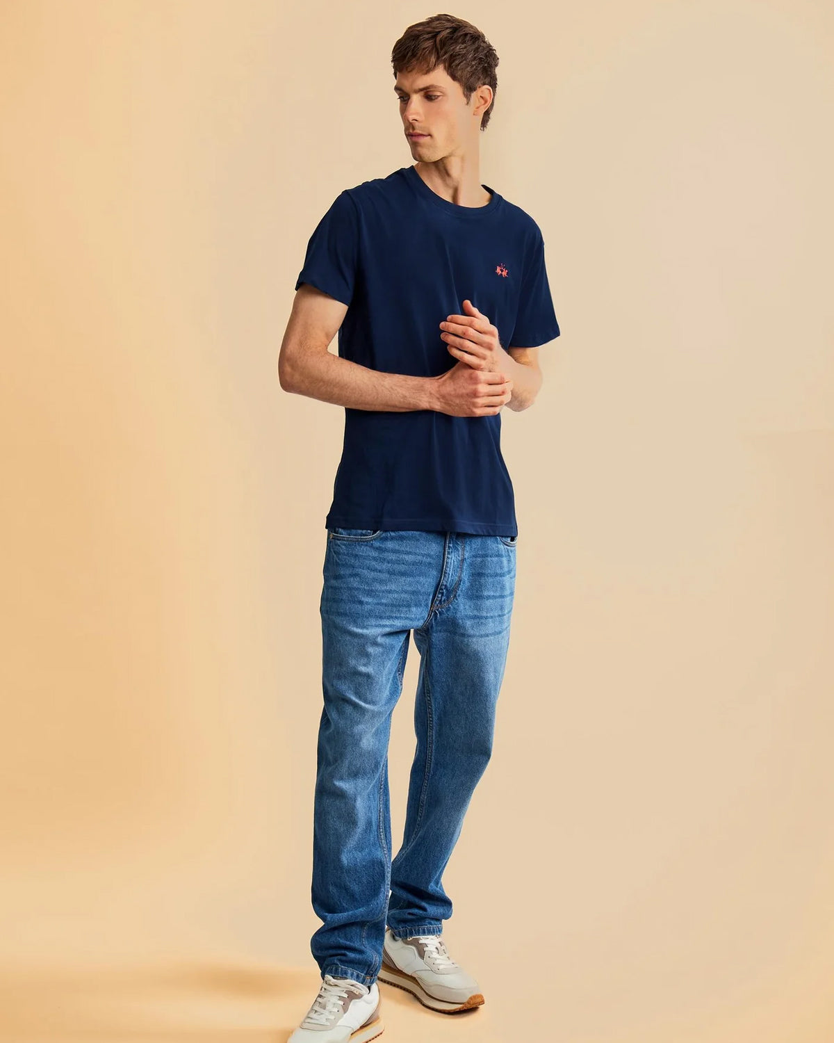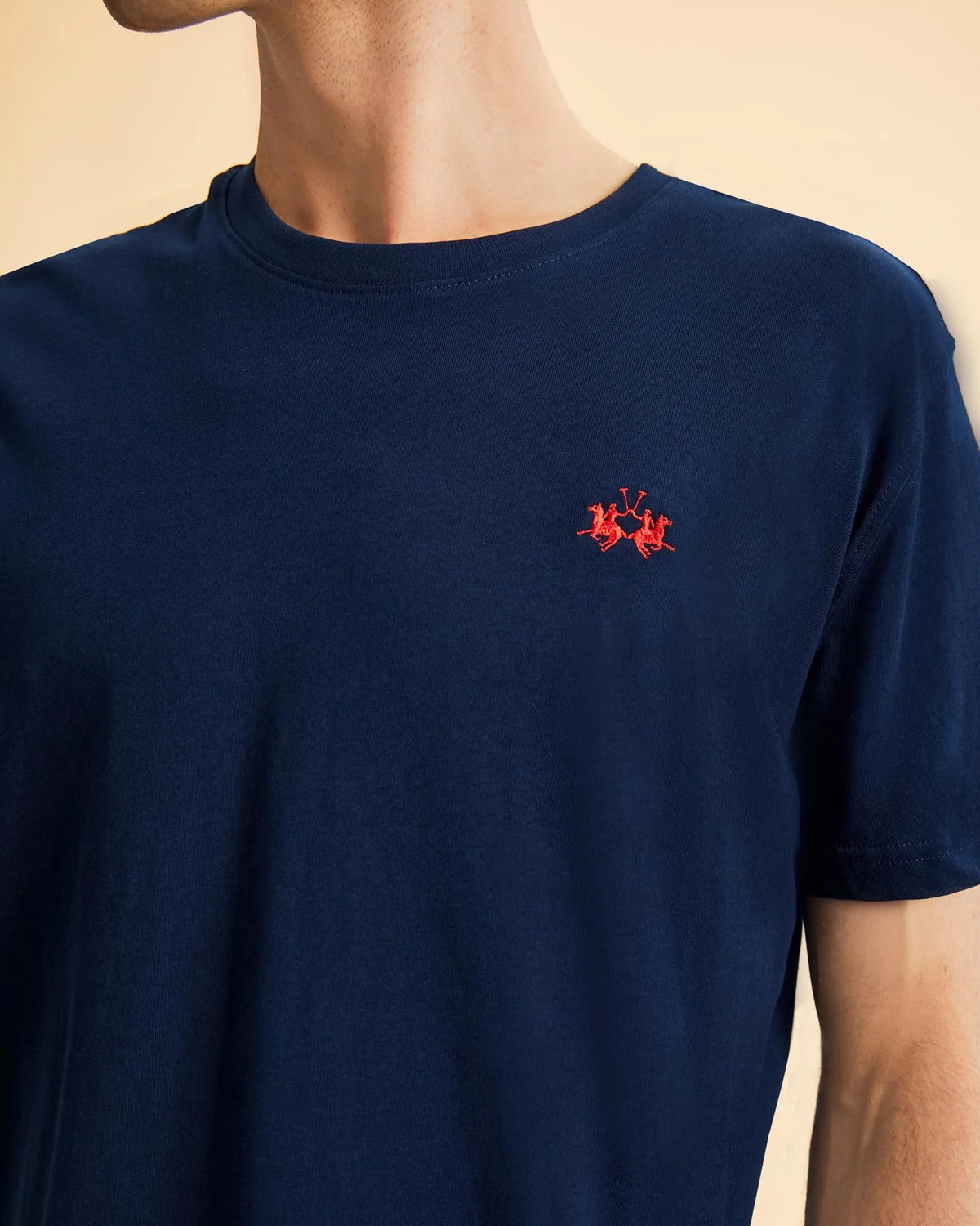 Kortermet herre-T-skjorte med rund hals i ensfarget farge med brodert logo i kontrastfarge på brystet. Laget av 100 % bomull med normal passform. Den passer perfekt med bermudashorts eller bukser for et avslappet og trendy utseende. Passer for fritid. Modellen er 187 cm høy og bruker størrelse L.