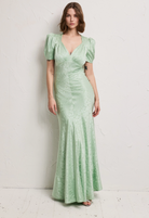 Leslie Jacquard er en lang silkekjole i jacquard i en frisk mintfarget farge. Den har korte puffermer, en flatterende hjerteformet halsutringning og en mykt tettsittende midje, og faller ned i et lett utsvingt skjørt som beveger seg elegant med kroppen. Feminin, tidløs og uanstrengt for sommerfeiringer og kveldsanledninger.