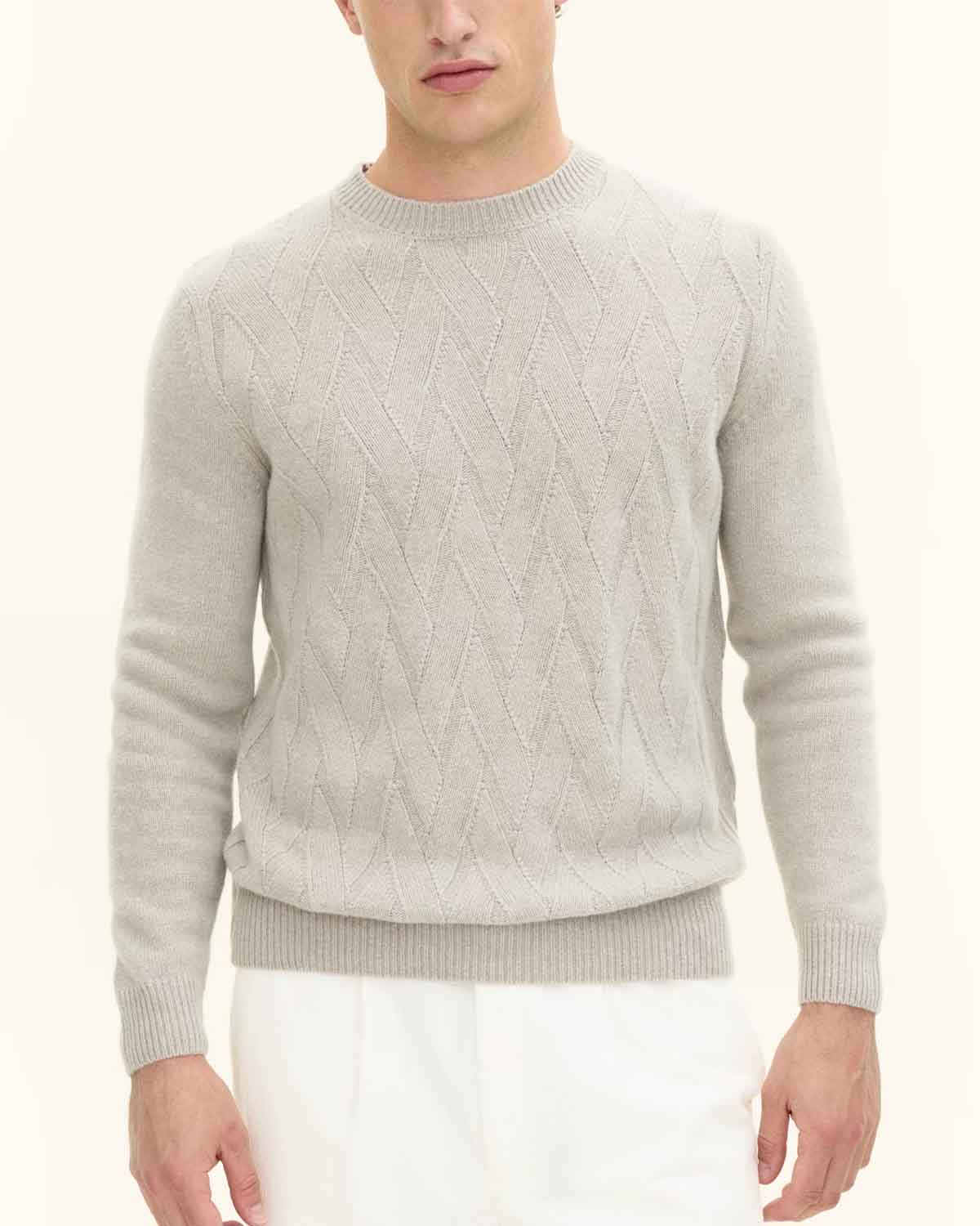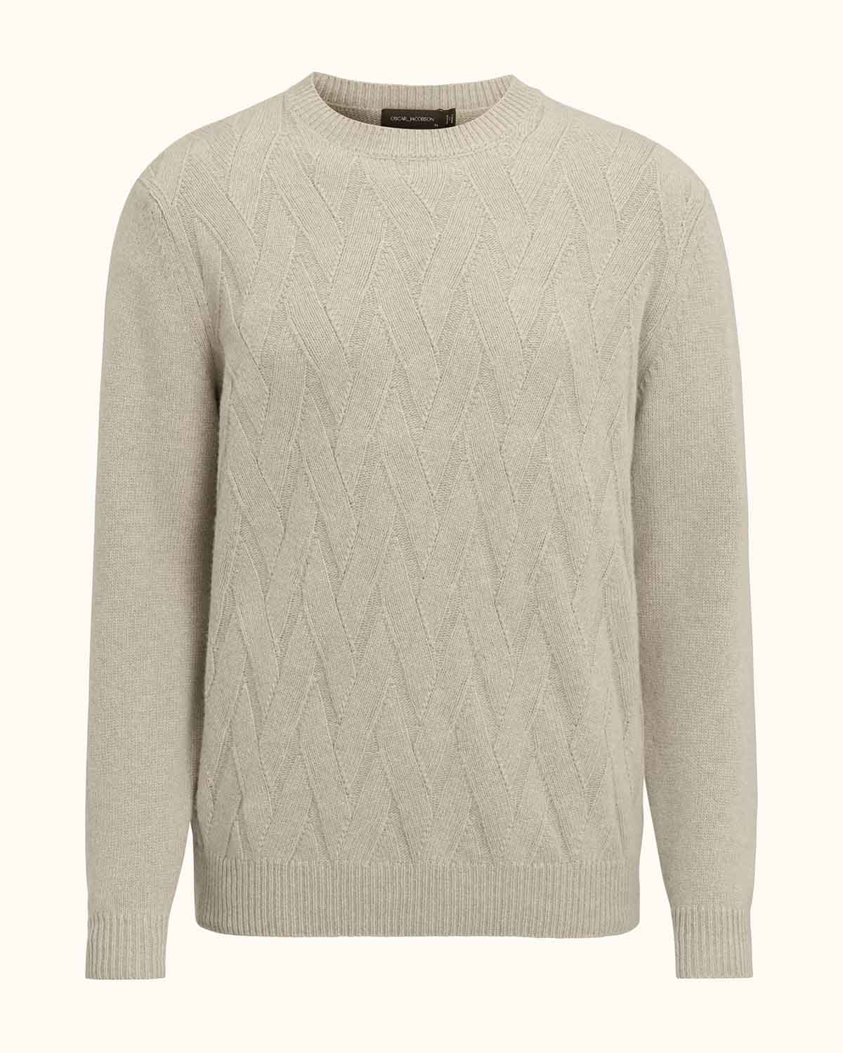 Genser med rund hals med unik struktur foran. Laget i en myk blanding av ull, kasjmir og viskose. Strikket i 7gg med 3-lags, som gir et sterkere plagg som er ideelt for kjølige høstdager.