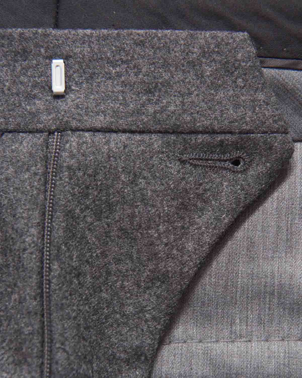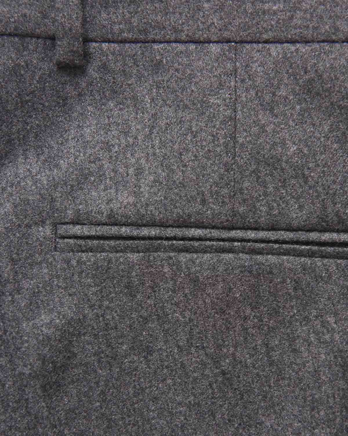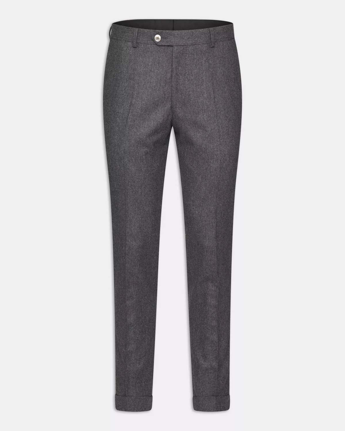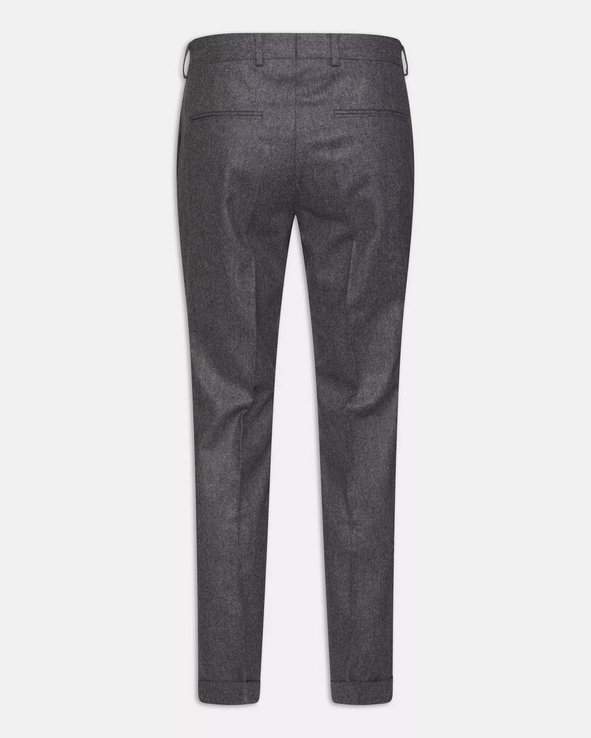 Grå bukse til herre fra Oscar Jacobson. Denz Flannel Trousers Dark Grey er en formell bukse som enkel kan pyntes opp og ned. Buksen har normal høyde i livet og avsmalende ben.