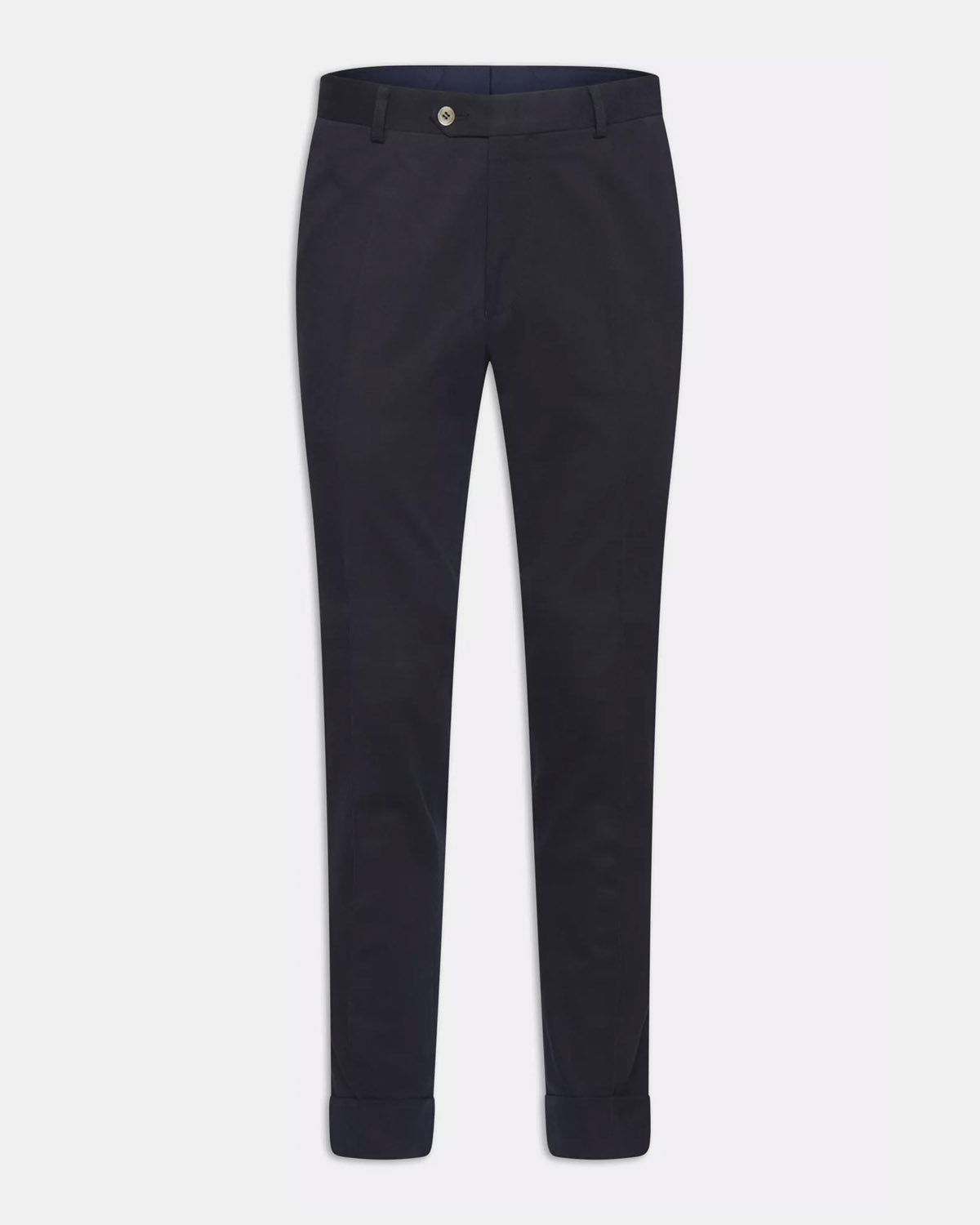 Favoritten fra Oscar Jacobson – Denz Chinos. Denz Chinos Turn Up Trousers i Navy er en mørkeblå bomullsbukse i smal fasong og tidløst design. Buksa har middels høyt liv, beltehemper i linning, passepoilerte lommer bak, lommer i sidene og lukkes med glidelås og knapp. Denz Chinos passer like fint til hverdags som fest og kan enkelt dresses opp og ned etter anledning.