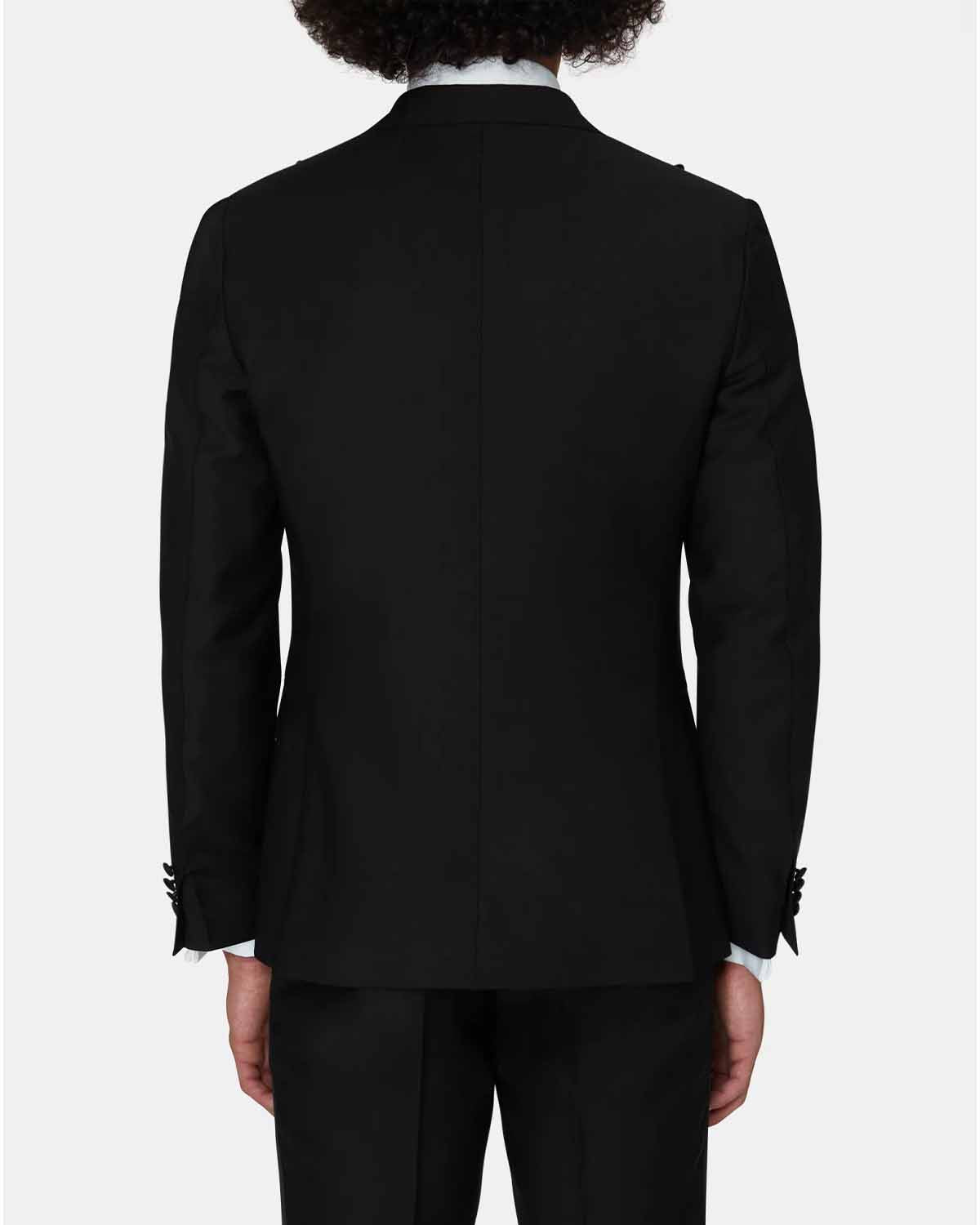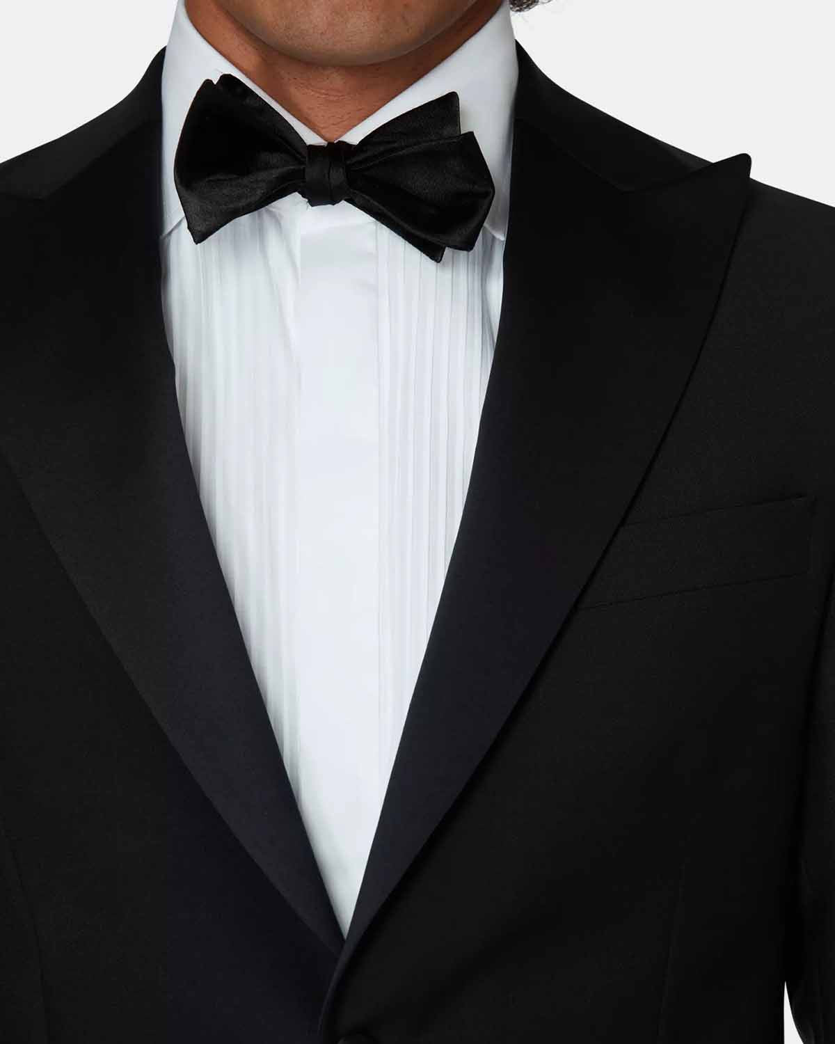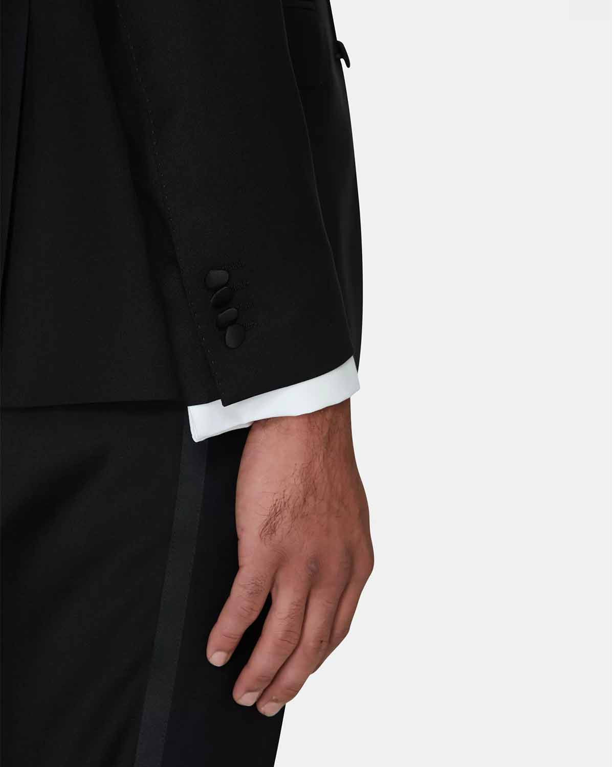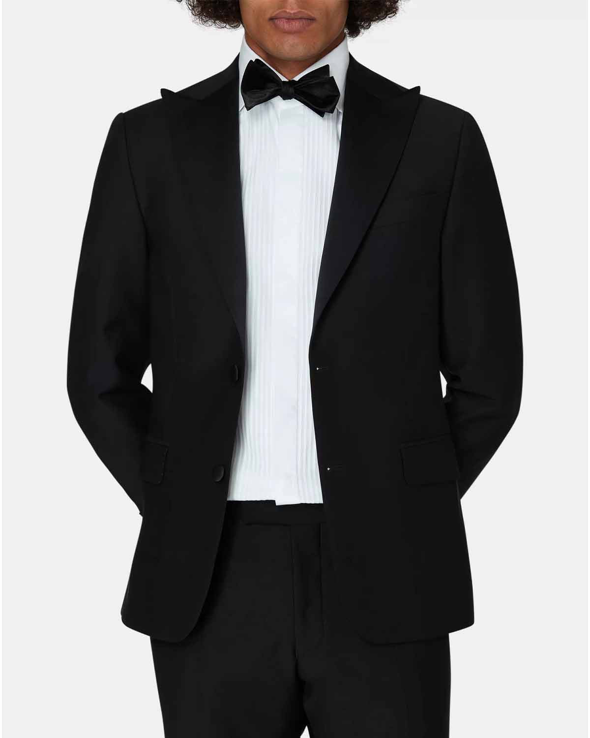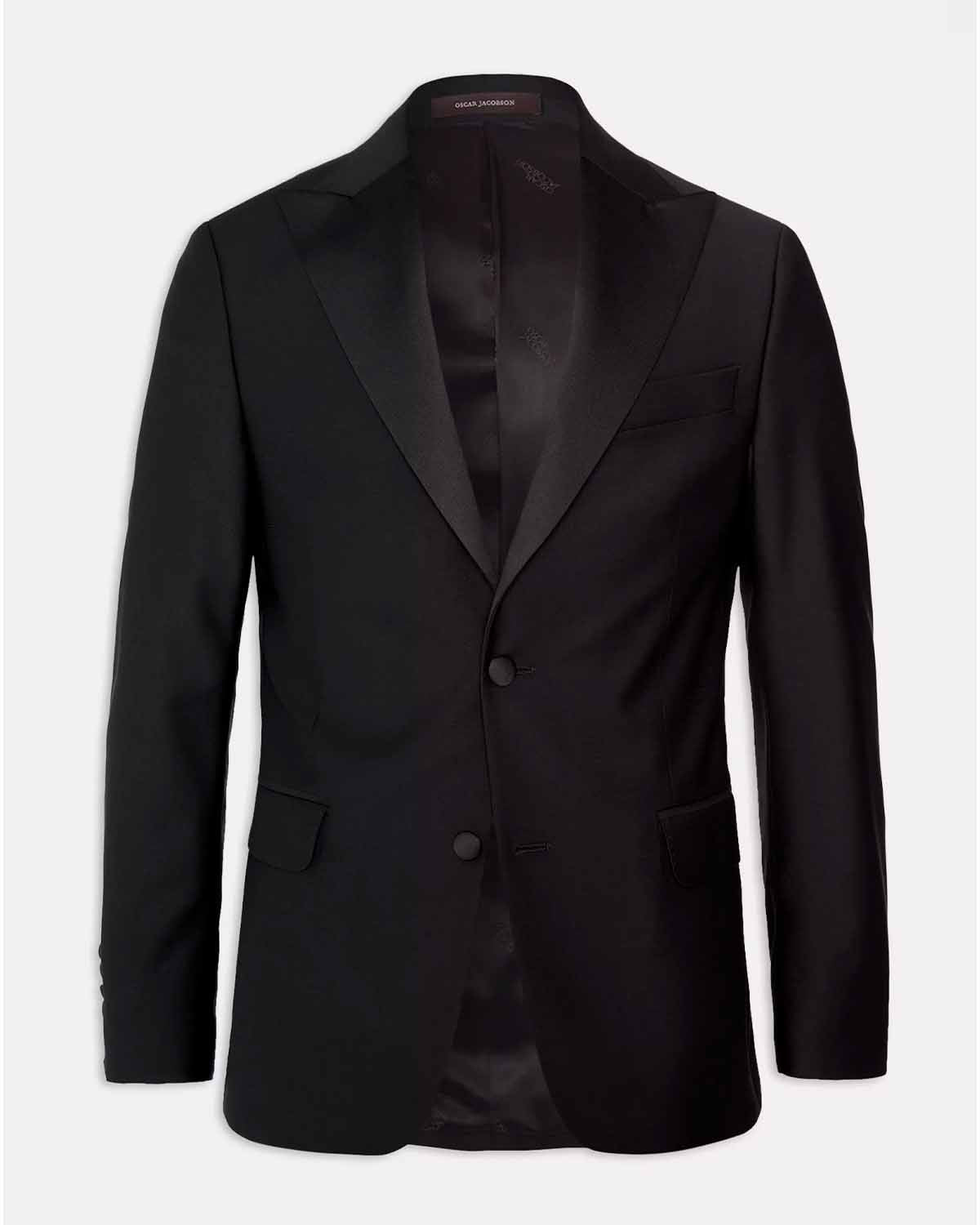 Denne smoking blazeren har et klassisk utseende og har en moderne slim passform. Slagene er som de skal være: Spisse, elegant brede og laget av silke. Materialet i jakken er et fint vevd smokingstoff av 100% ull.