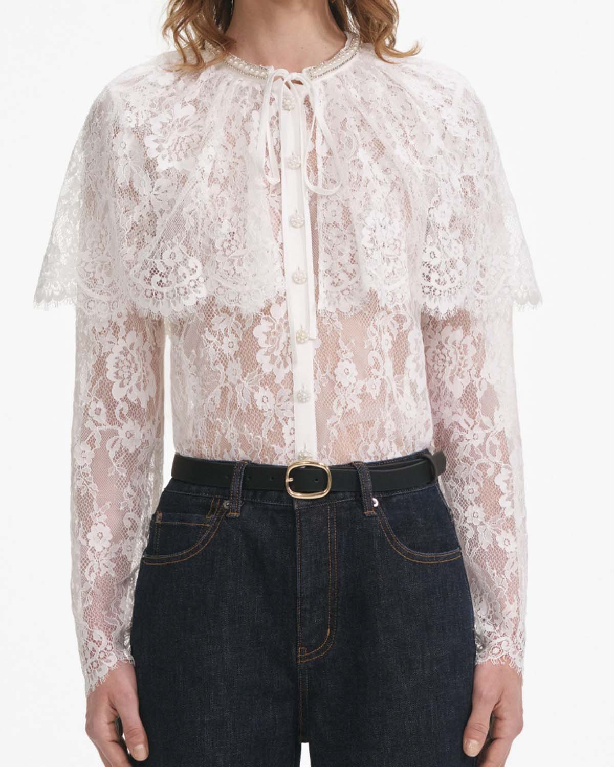 Romantikk møter glamour i denne blondeskjorten med kappedetaljer for en dramatisk effekt. Kombiner den med denim for en date eller bruk den med et miniskjørt i skinn for en jentekveld.
