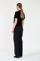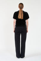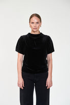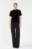 Elegant topp laget i en delikat stretchfløyel. Modellen er designet med en høyt skåret hals, skjult glidelås bak, korte ermer med et avrundet skulderparti og legg foran for å skape en lett drapert e?ekt. Rett til noe ettersittende i fasongen.