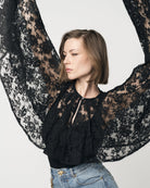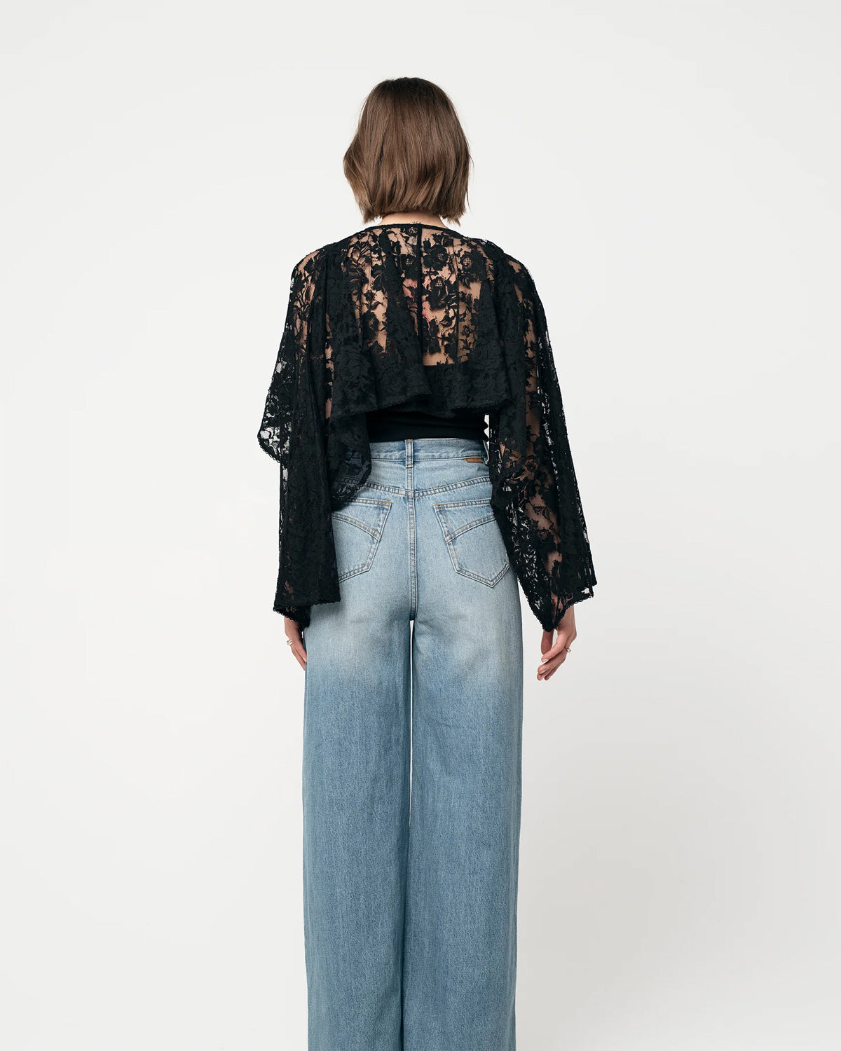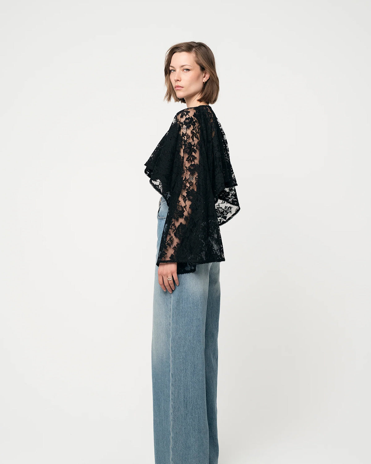 En blondekappe med et hint av drama. Diwali-laken faller uanstrengt over skuldrene og ryggen, og de lange ermene flyter inn i en delikat silhuett som lukkes med en enkelt knapp i halsen. Kort, gjennomsiktig og uendelig allsidig, legg den over kjoler for kveldens sjarm, eller kombiner den med denim for en dristig kontrast. Et statement-plagg som forvandler det enkleste antrekket til en scene.