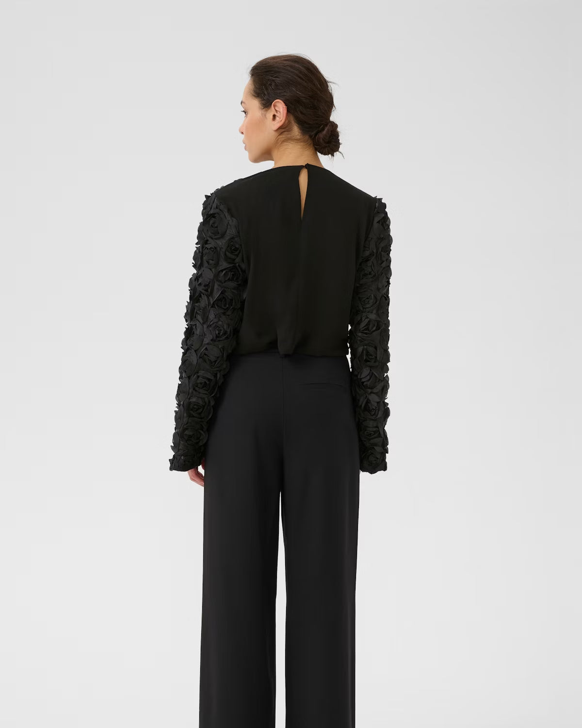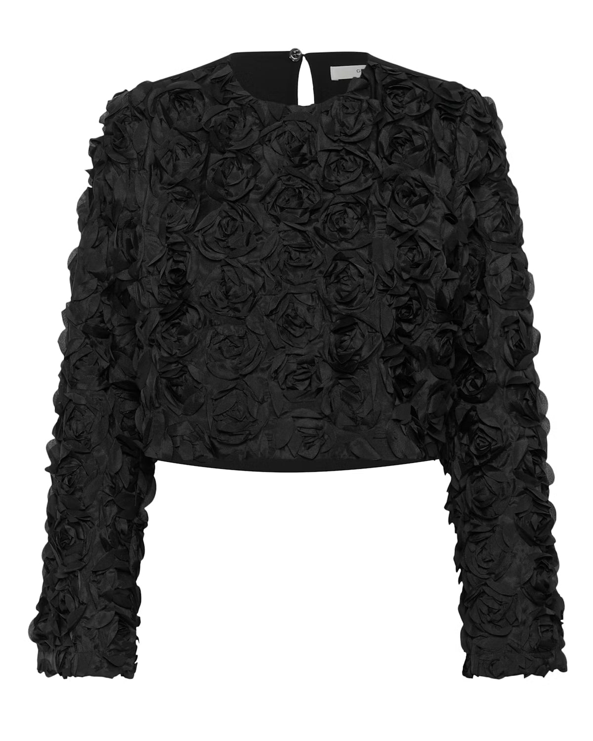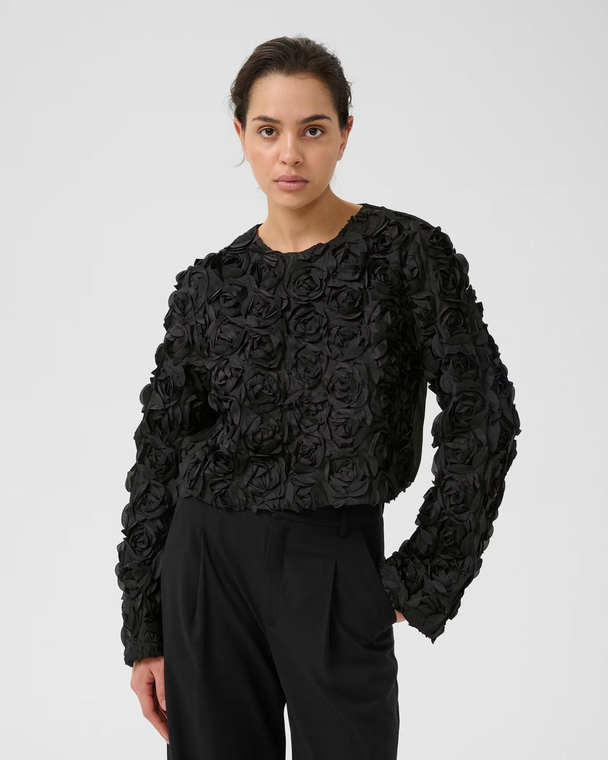 Bluse med lange ermer og 3D-blomsterapplikasjoner foran og på ermene. Rund hals, kort lengde og knappelukking i nakken gir en elegant finish.