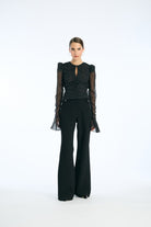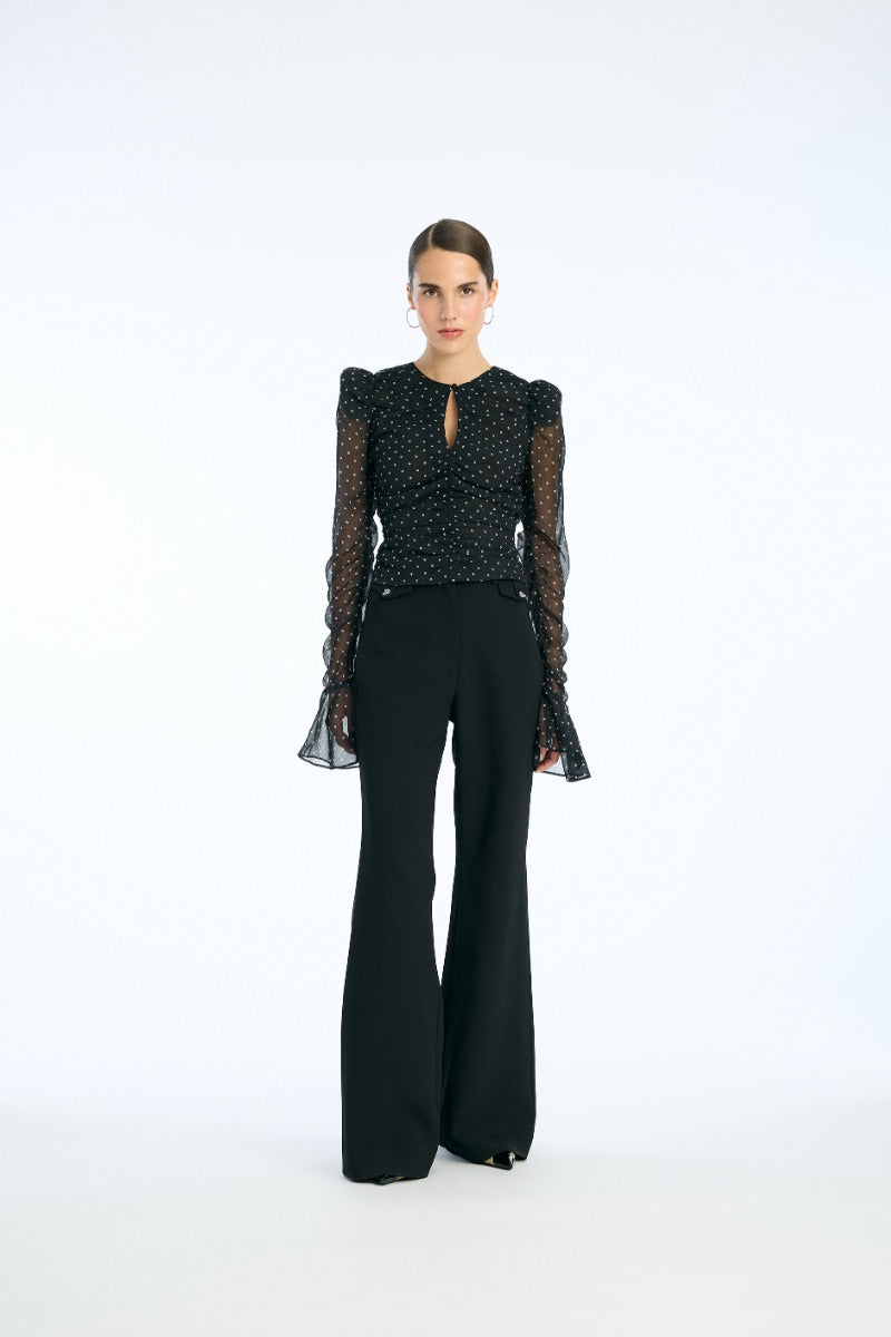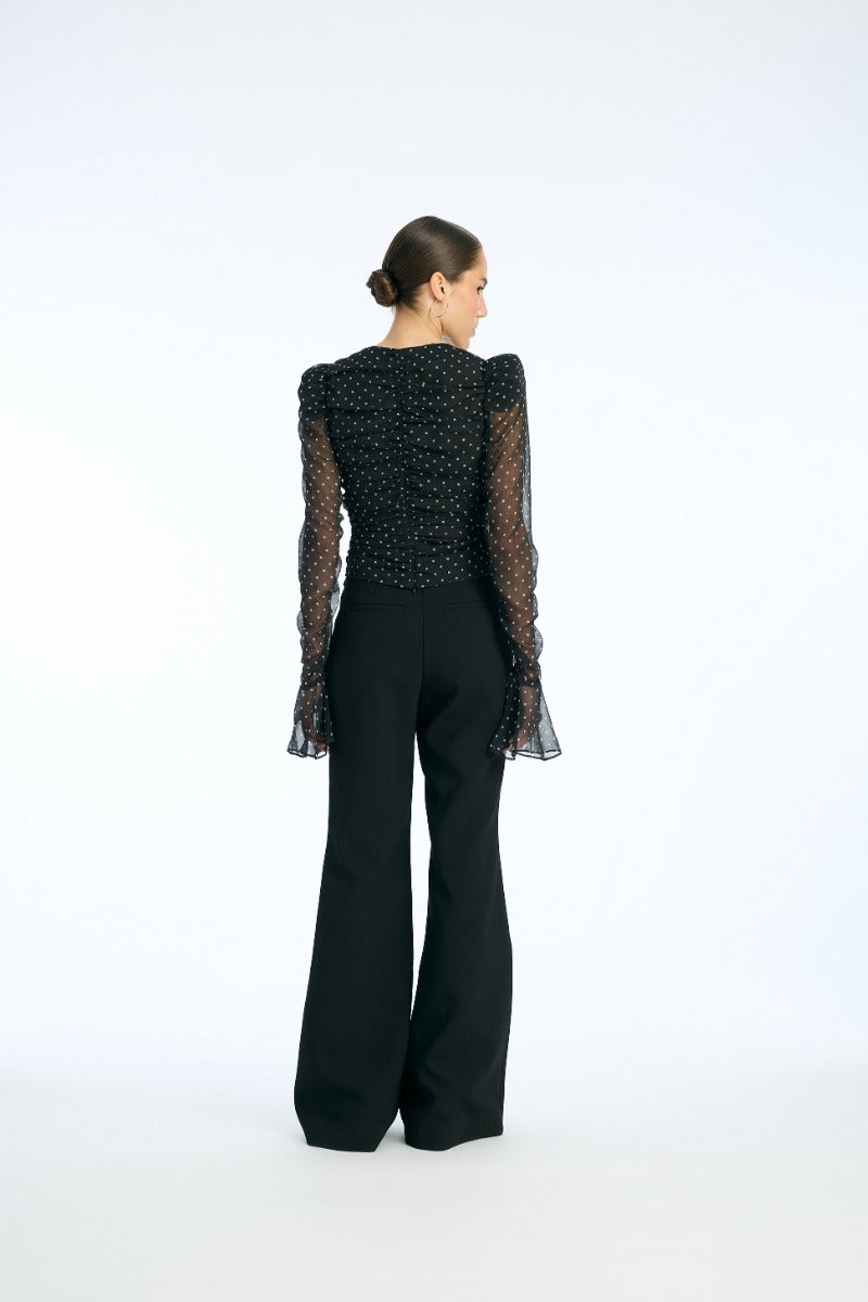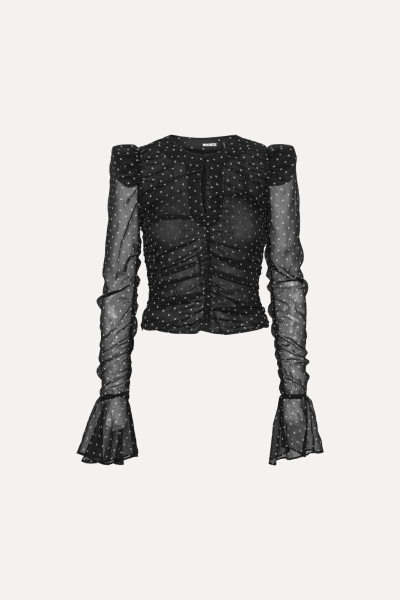 Chiffon Ruched Ls Top Black er designet i gjennomsiktig chiffon med et lite prikkete mønster. Toppen har lange gjennomsiktige ermer med rysjedetaljer og utsvingte mansjetter. Bodyen er rysjet langs foran og bak, noe som skaper en tettsittende silhuett, mens en liten nøkkelhullsåpning foran gir et raffinert preg. Toppen er fôret.