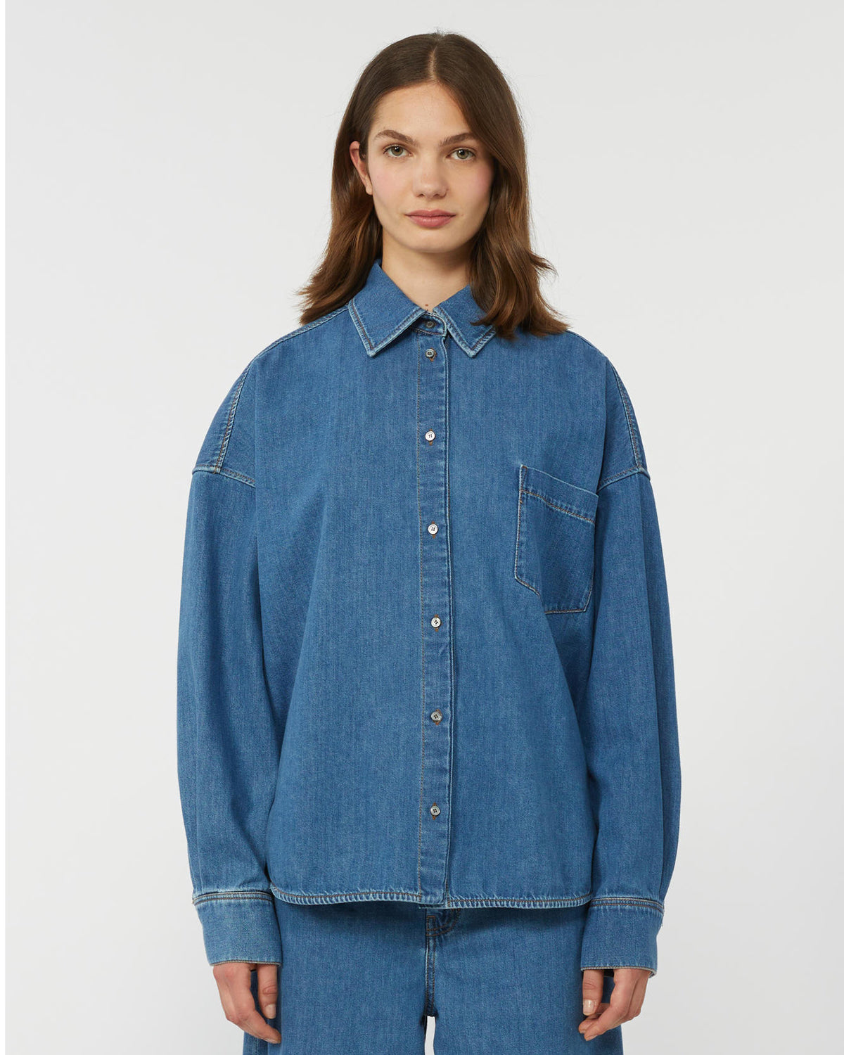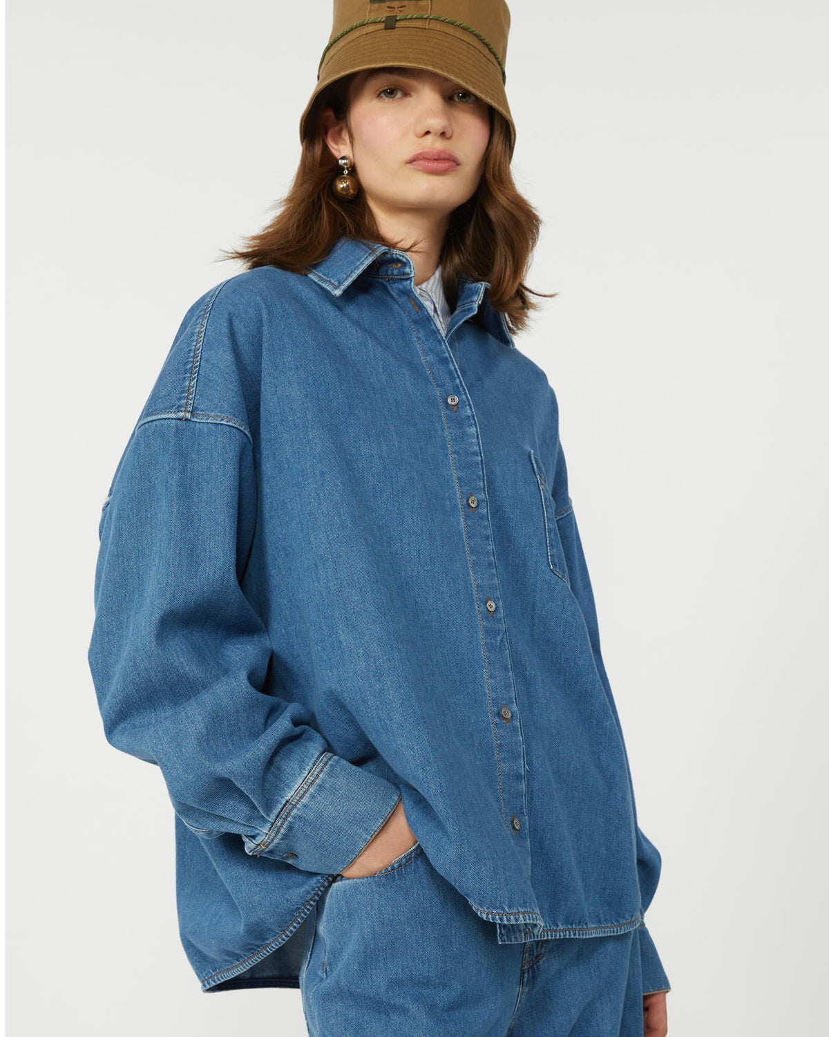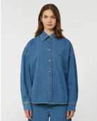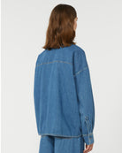 Overdimensjonert skjorte med klassisk tobakksfarget denim-søm og påsydd lomme på venstre bryst.