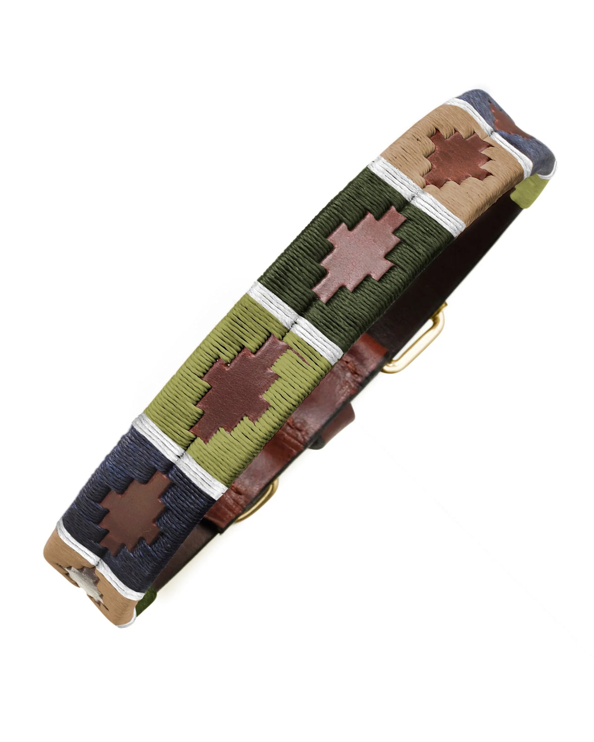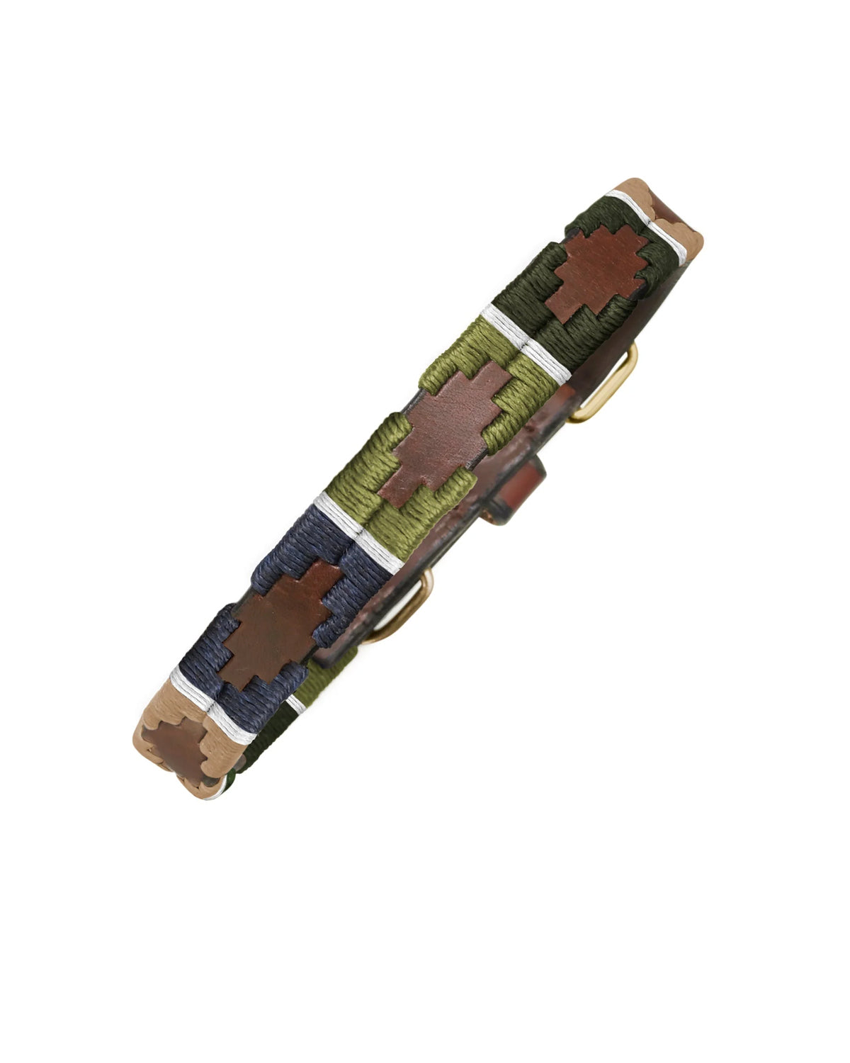 La hunden din skille seg ut fra mengden med Caza-hudeshalsbåndet i skinn fra pampeano. De olivengrønne, marineblå, fyldige karamellfargene og militærgrønne fargene, atskilt av tynne hvite striper, kuttet med våre signatur pampa-diamanter, gir et halsbånd som passer enhver hund.