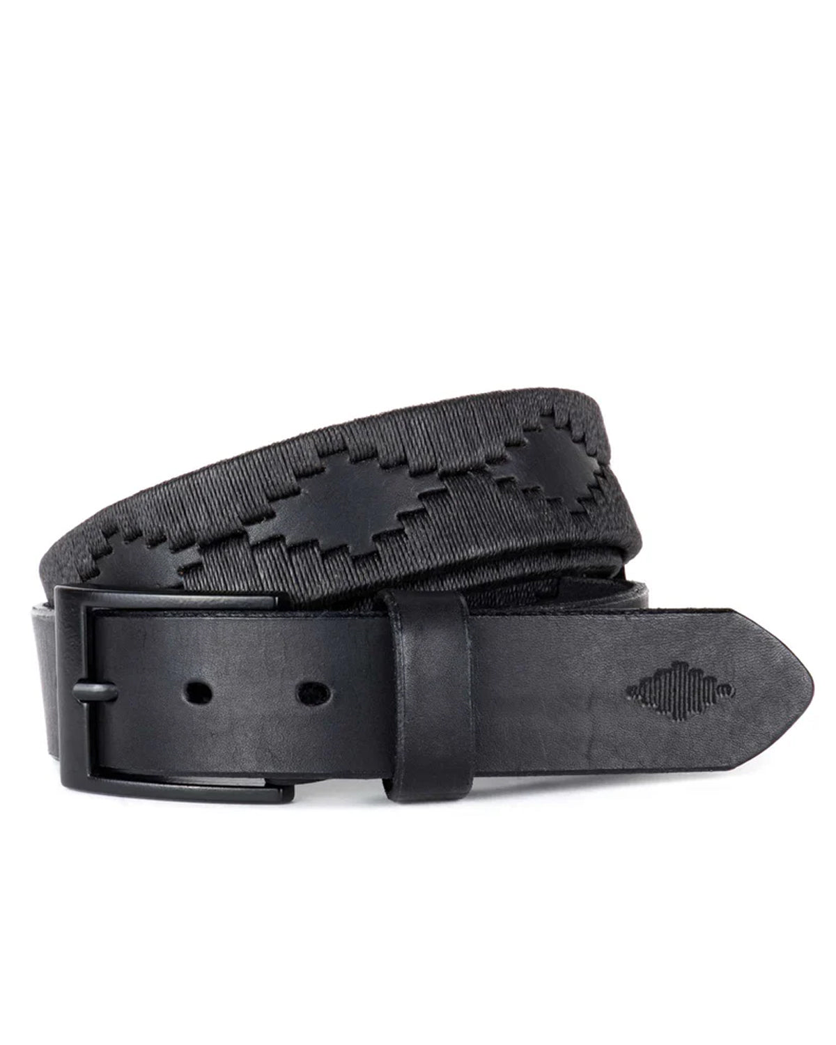 Et håndlaget svart skinnbelte for menn med delikate vevde detaljer og en klassisk silhuett. Utfyller både skreddersydde og avslappede antrekk.