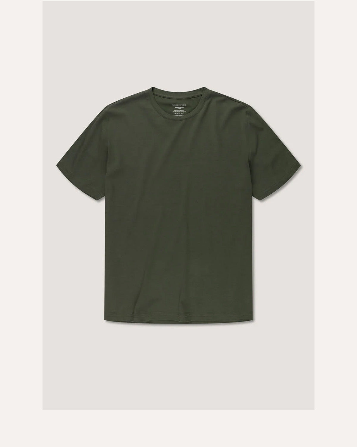 Bambus/bomulls-t-skjorten med rund hals er laget av en myk og pustende blanding av 65 % FSC®-sertifisert bambusviskose, 30 % GOTS økologisk bomull og 5 % elastan. Den er designet for å sitte tett rundt brystet med et mer avslappet snitt i midjen, og kombinerer struktur med komfort.