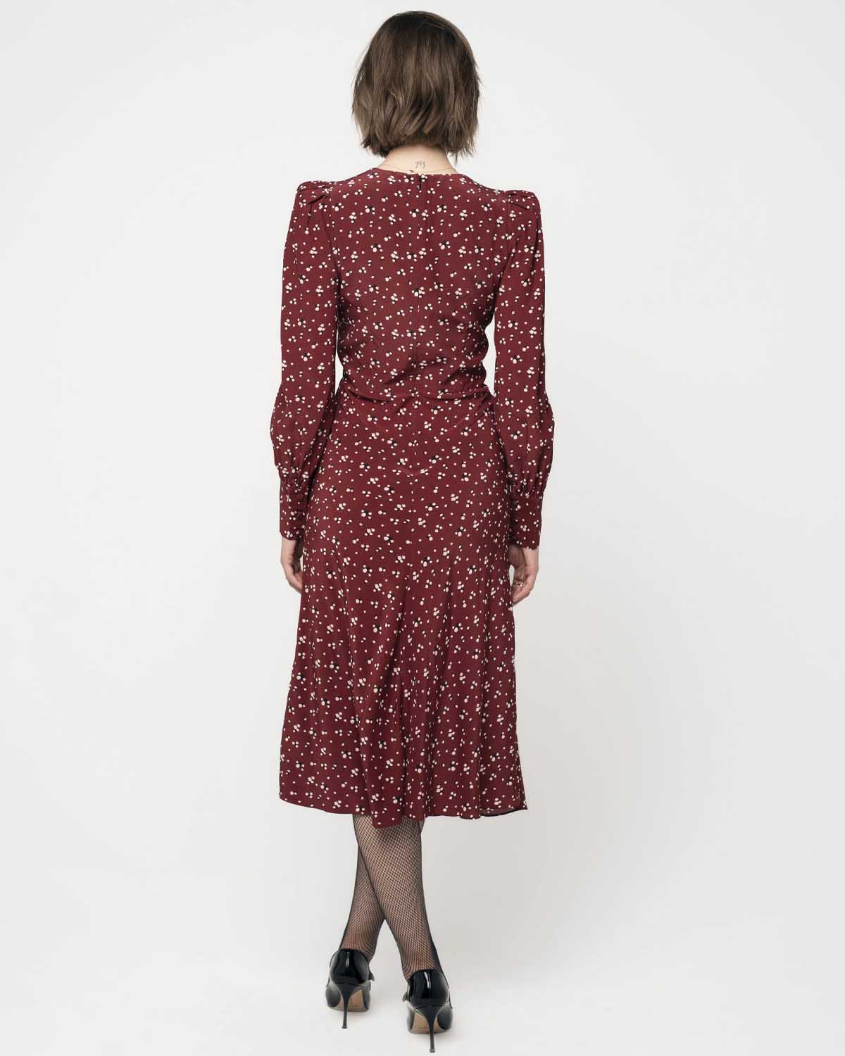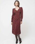 Midikjole fra Pia Tjelta i Tinkerbell-trykk. Hjerteformet halsutringning, folder under bysten og et skråstilt skjørt som fremhever enhver bevegelse. Lange ermer, avslappet eleganse.