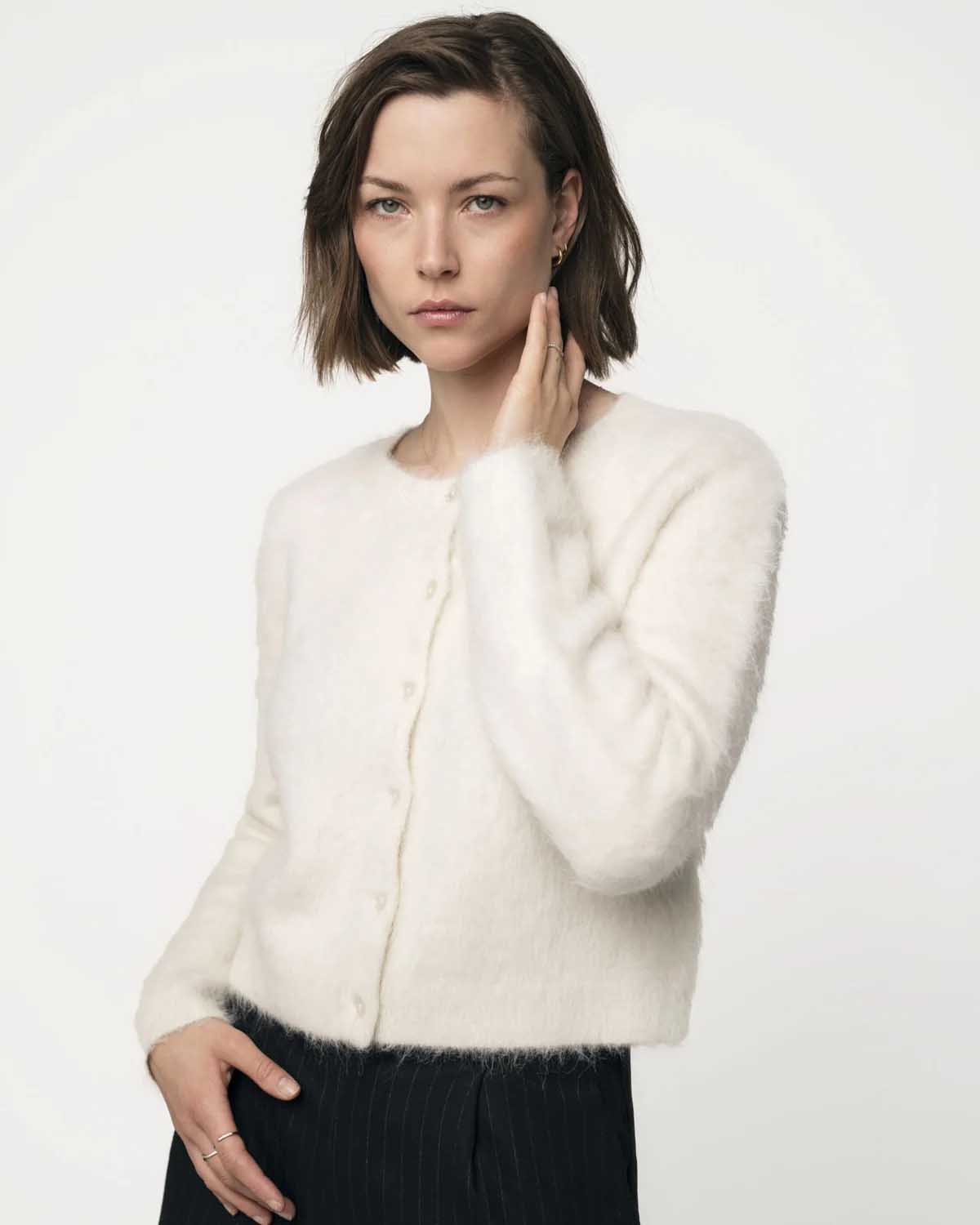 Astrid Brushed Cardigan fra Pia Tjelta. Myk og varm cardigan i en eksklusiv alpakkablanding. Astrid Brushed har en rett passform med rund hals og klassisk knappelukking foran. Den børstede teksturen gir et lunt og elegant uttrykk, perfekt både over kjoler og til hverdagsantrekk.
