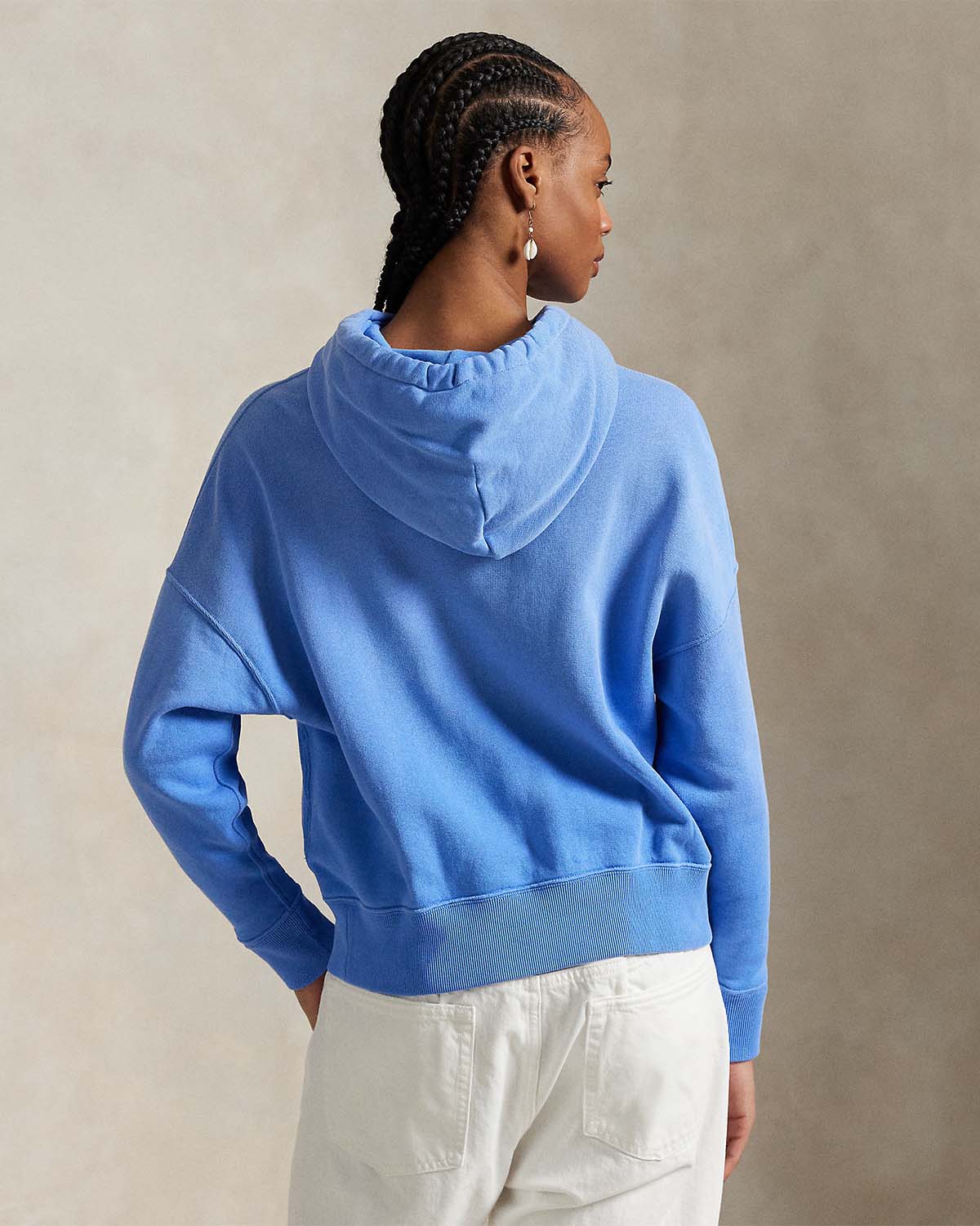 Ralph Laurens signaturlogo og maskot, Polo Bear, dekorerer fronten på denne myke fleece-hettegenseren.