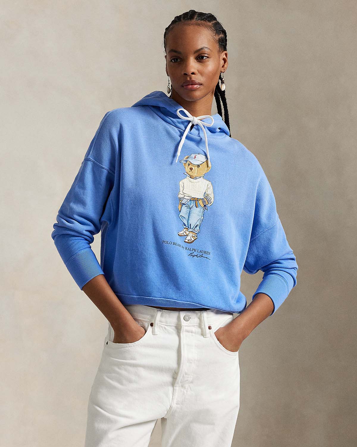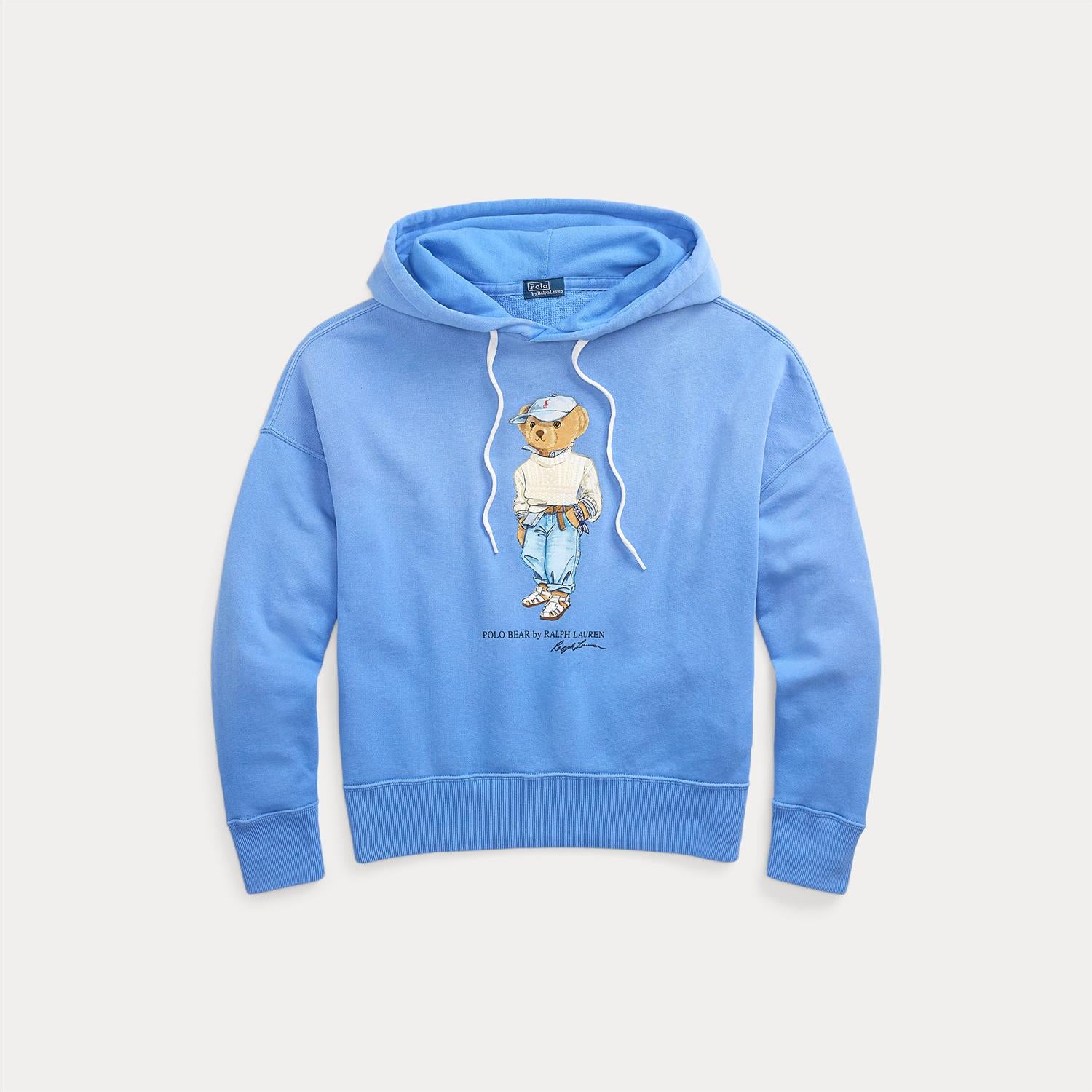 Ralph Laurens signaturlogo og maskot, Polo Bear, dekorerer fronten på denne myke fleece-hettegenseren.