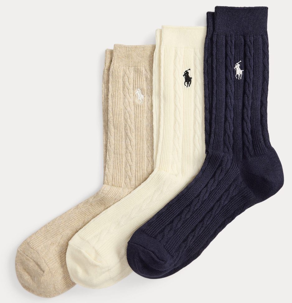 3 pakning med Polo Ralph Laurens klassiske kabelstrikkede sokker med broderte ponni.