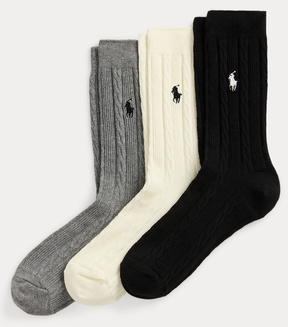 3 pakning med Polo Ralph Laurens klassiske kabelstrikkede sokker med broderte ponni.