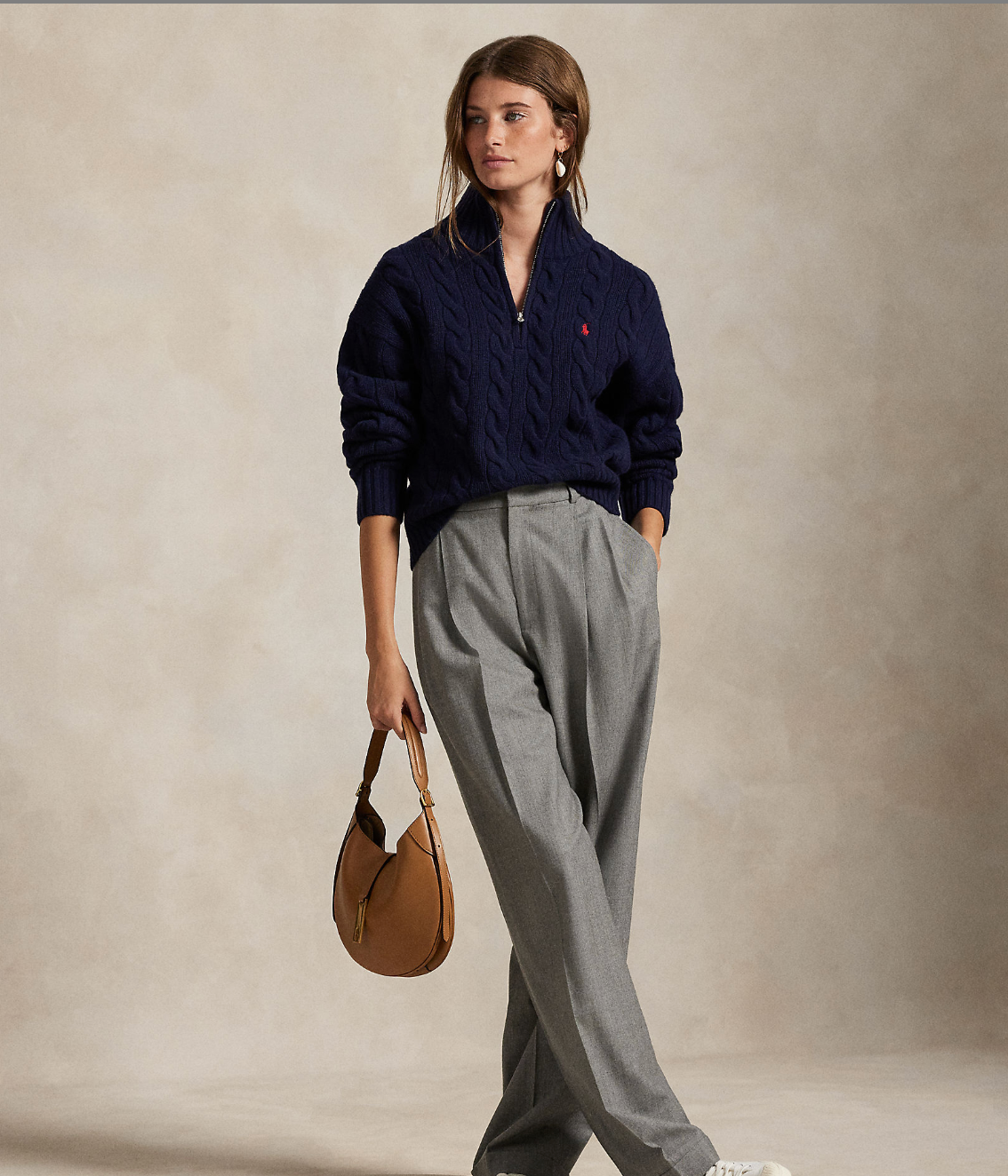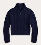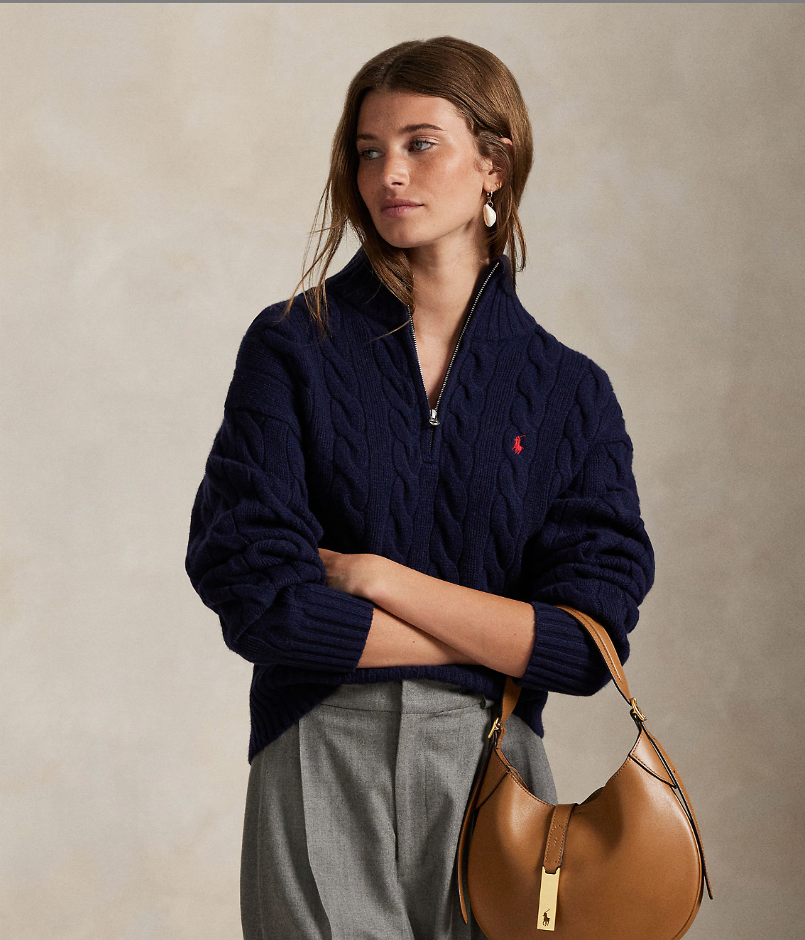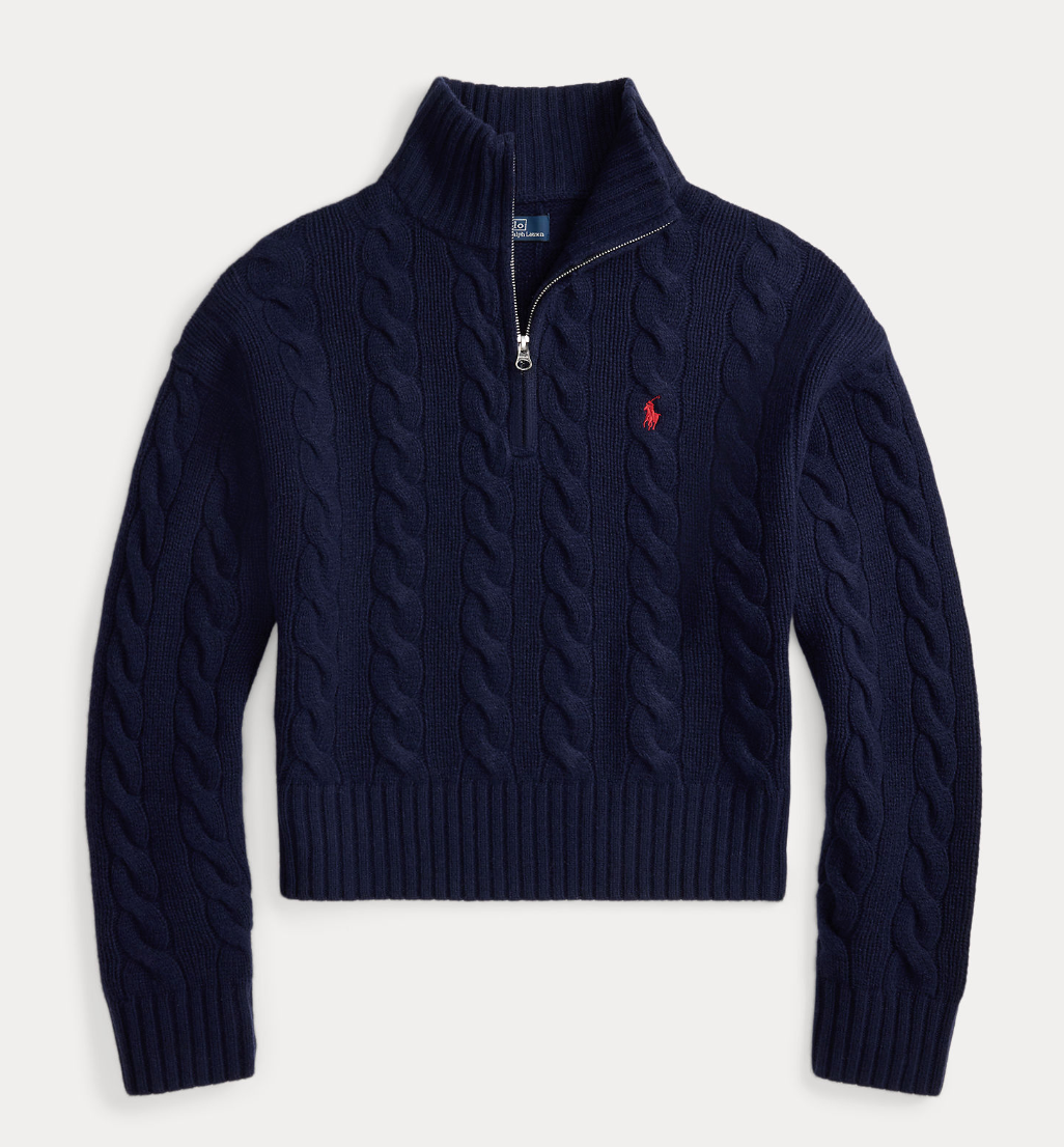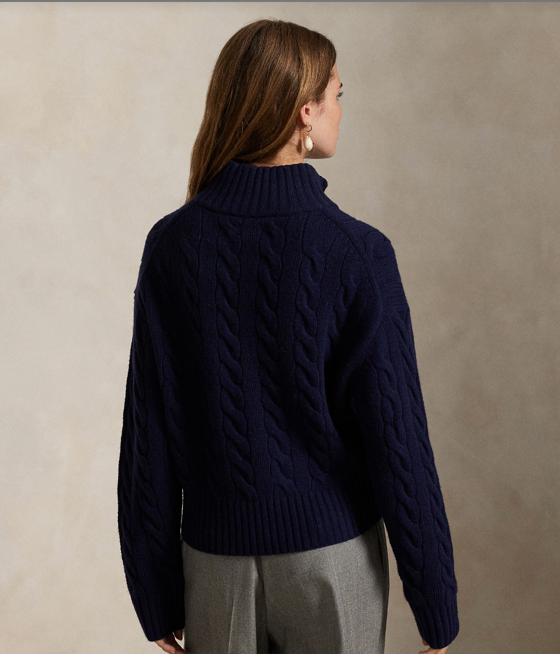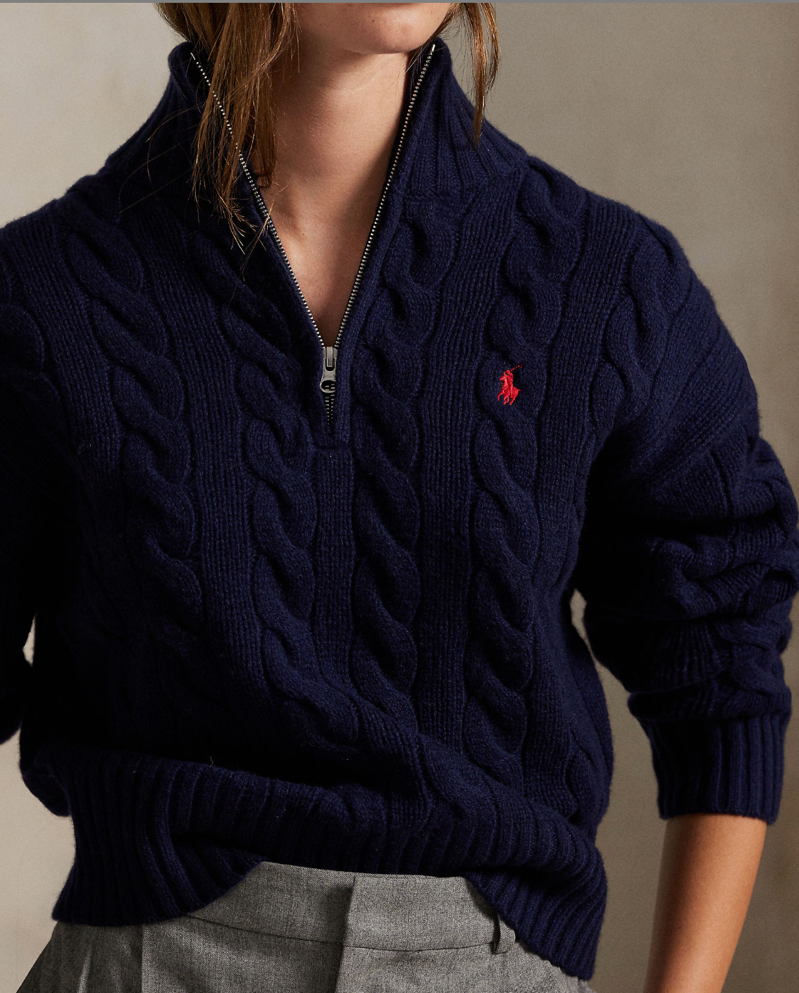 Polo kabelstrikket ullgenser i italiensk ull og kashmir. En deilig myk, tykk genser med en half zip lukking i halsen. På brystet signaturbrodert rød ponni.