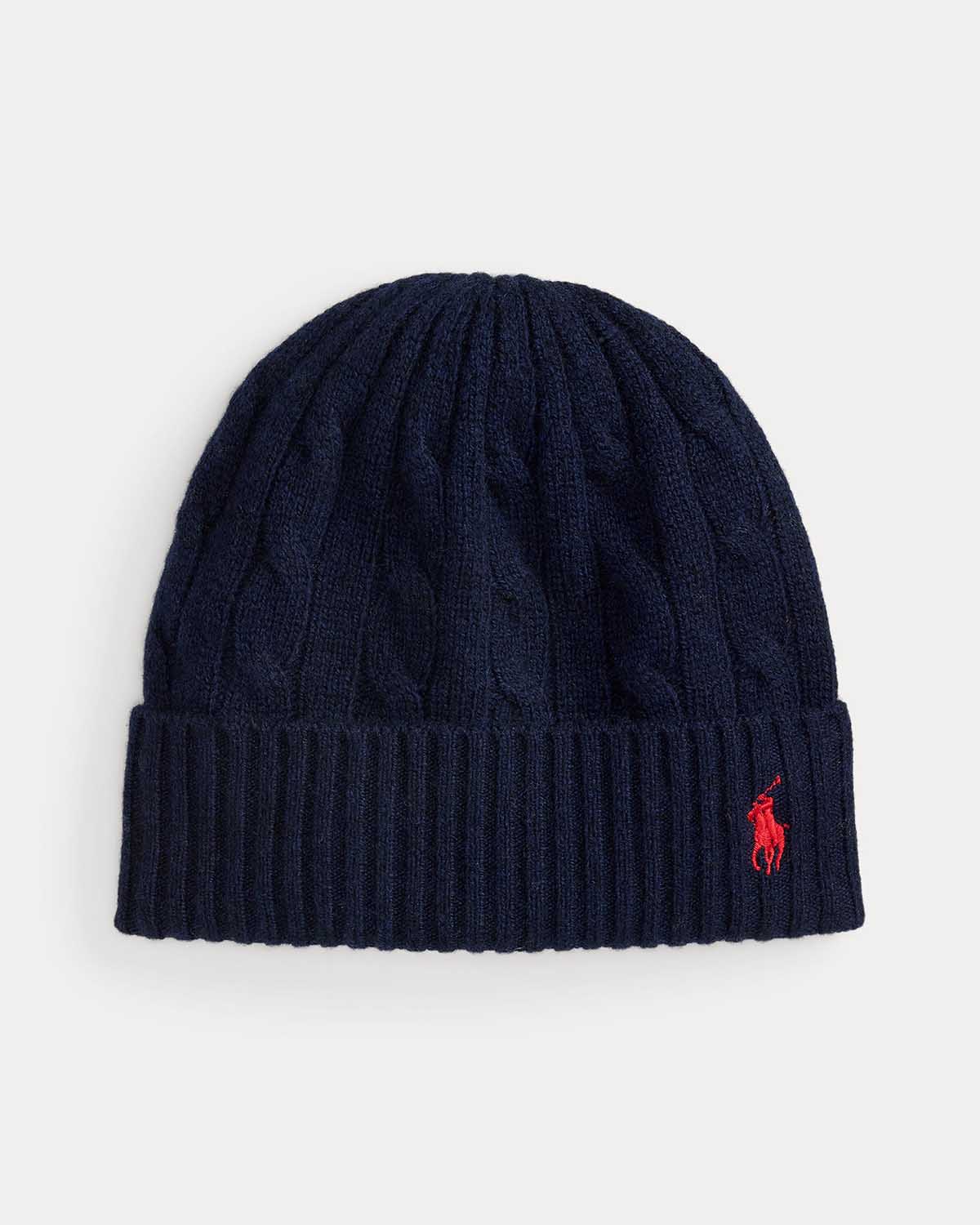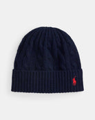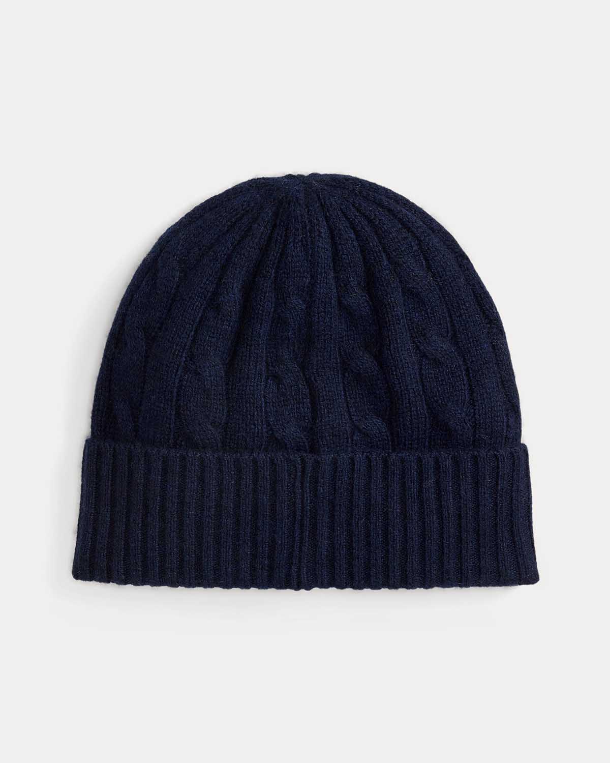 Denne luen i ull og kasjmir er definert av Ralph Laurens signatur-kabelstrikkede konstruksjon og den broderte Pony-logoen, som detaljerer den ribbestrikkede bremmen.