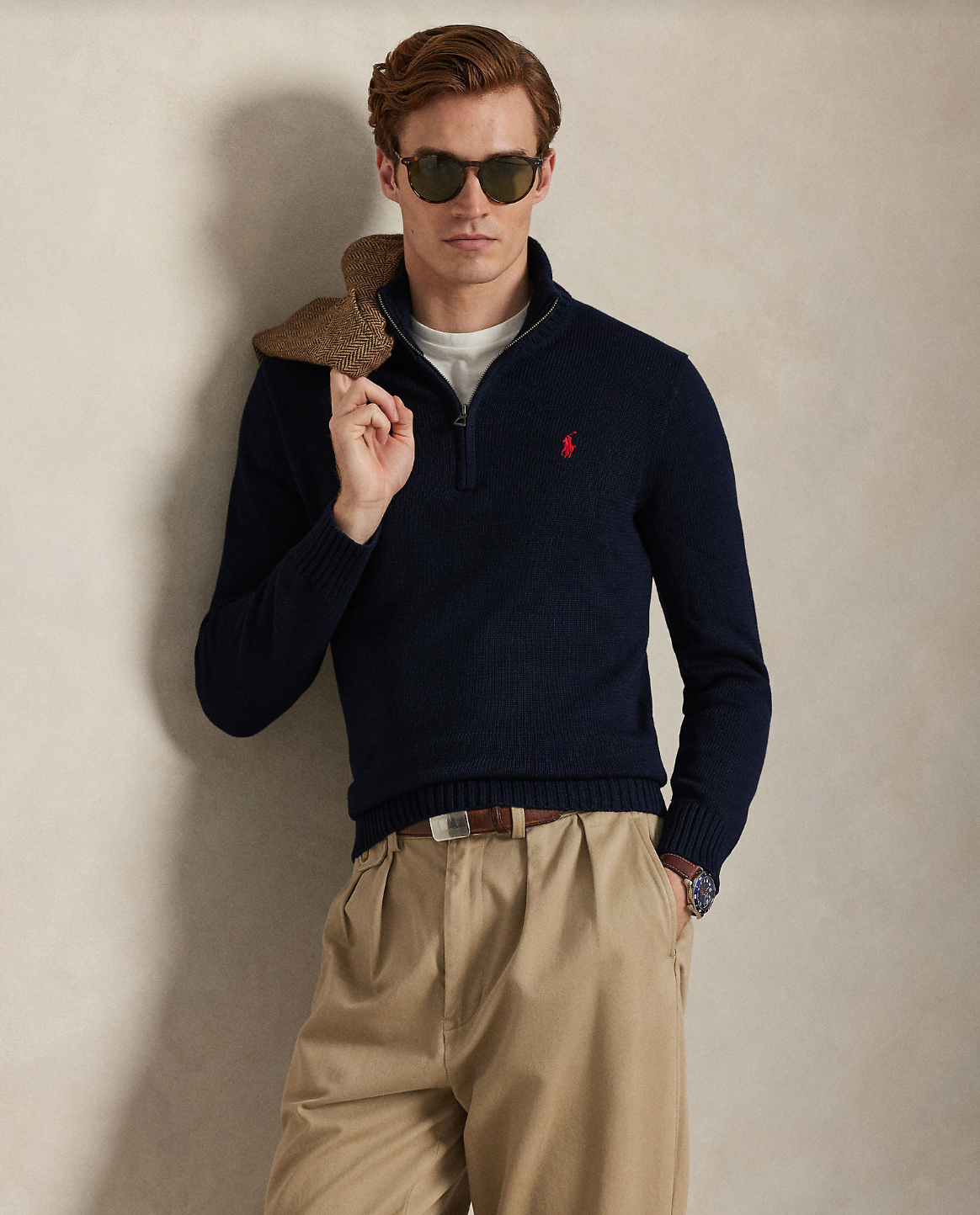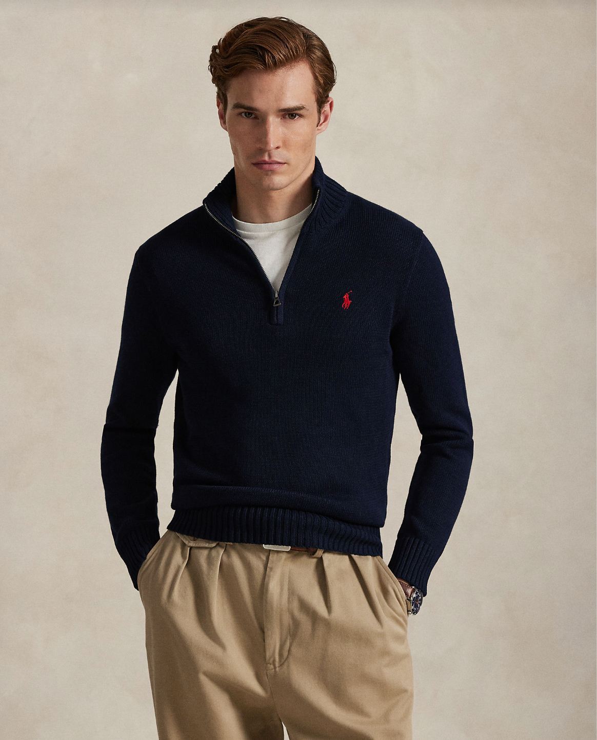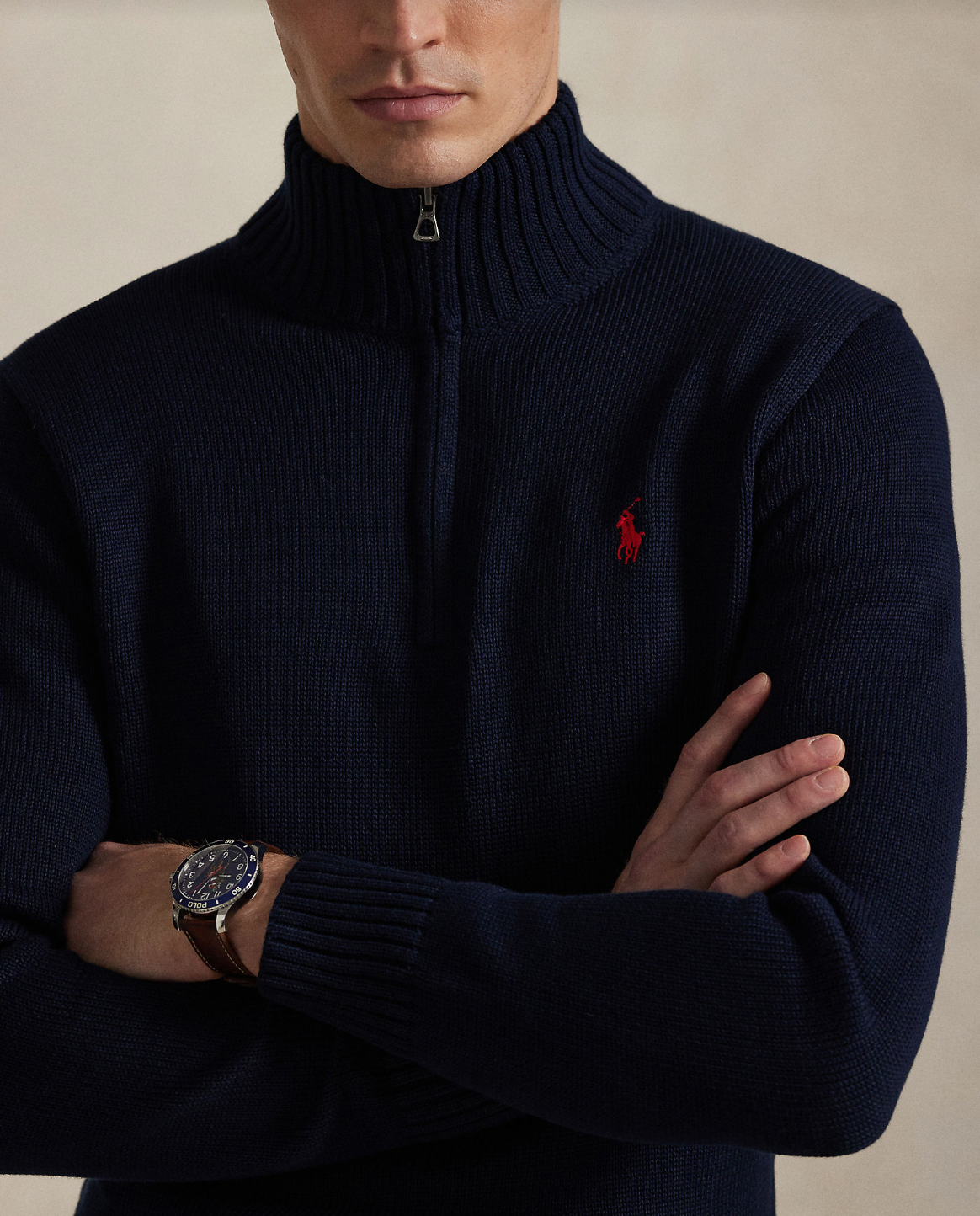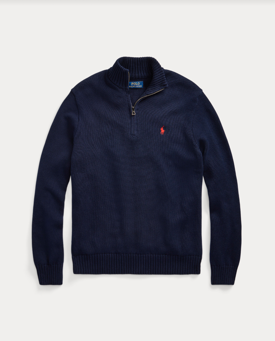 Polo sin klassiske mockneck-genseren med half zip er strikket i en myk kjemmet bomull og har den ikoniske Polo Pony.