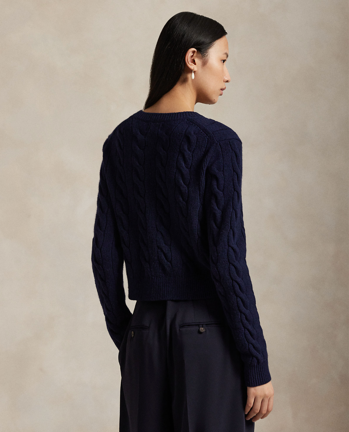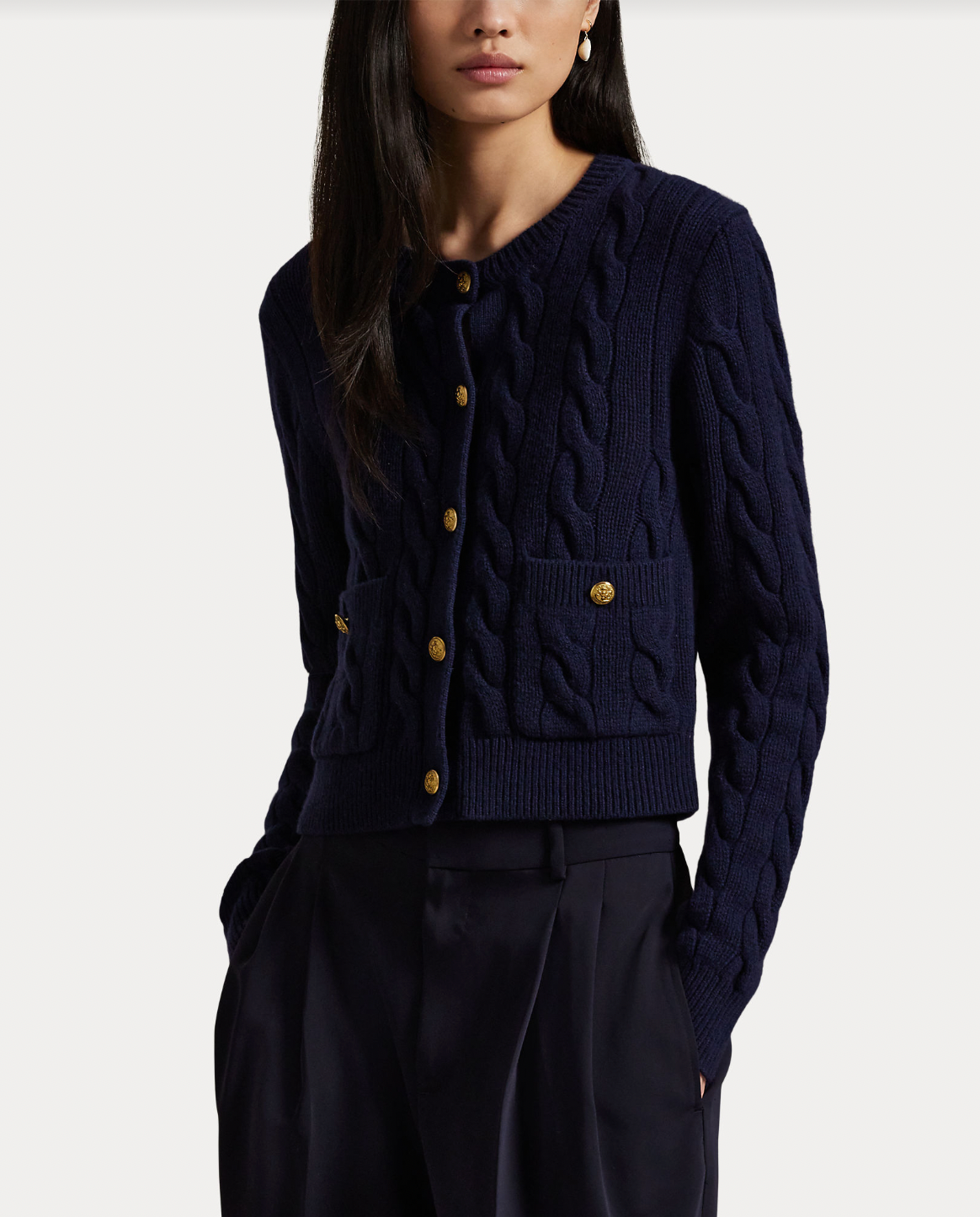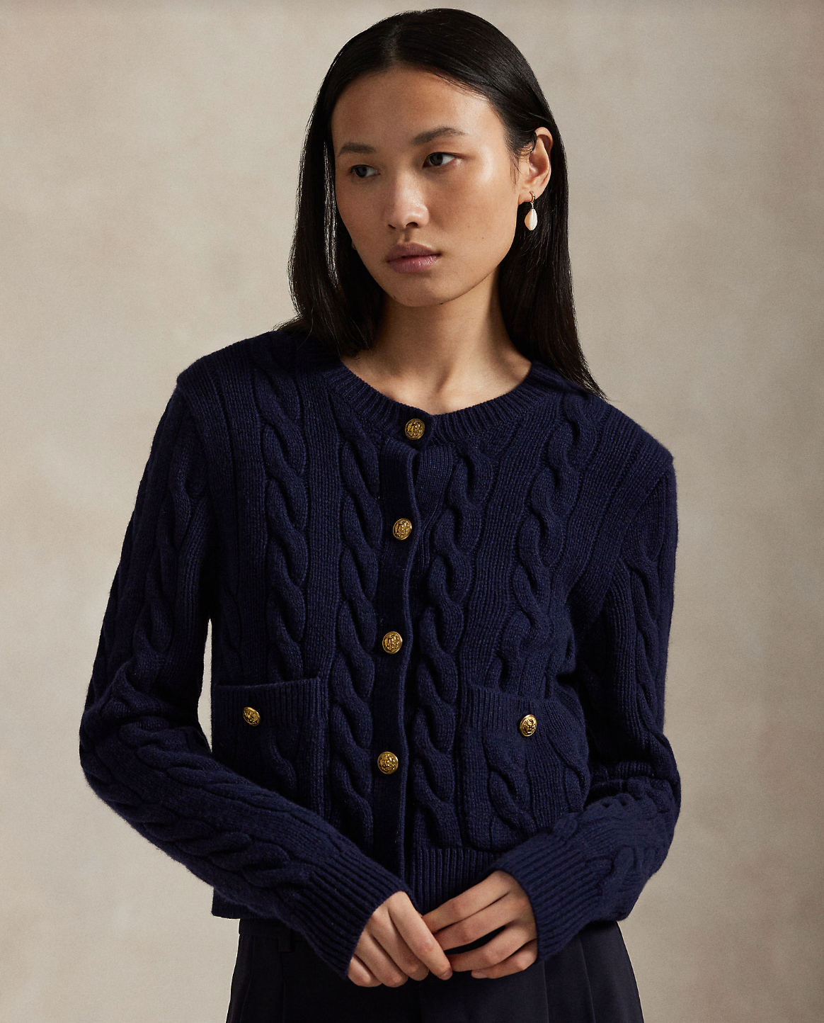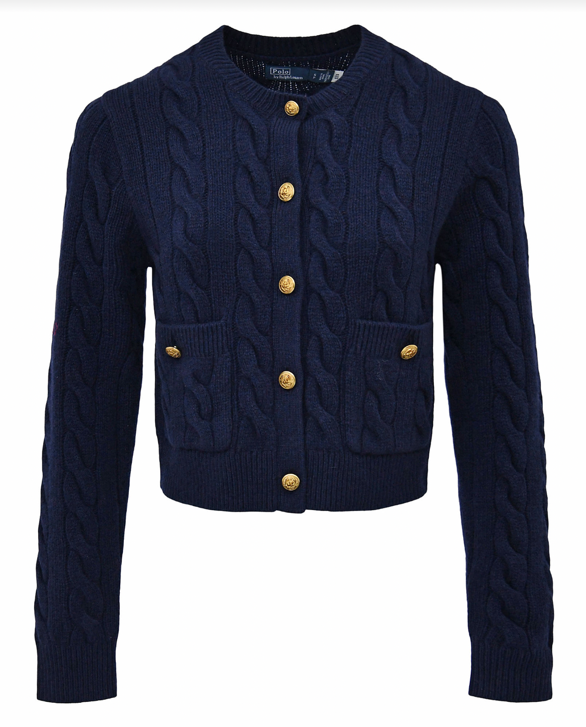 Nydelig mørkeblå cardigan fra Polo strikket i en blanding av ull og kashmir. Jakken er kabelstrikket og har et klassisk snitt med graverte messingknapper –et signaturbilde av den klassiske cardiganen.