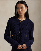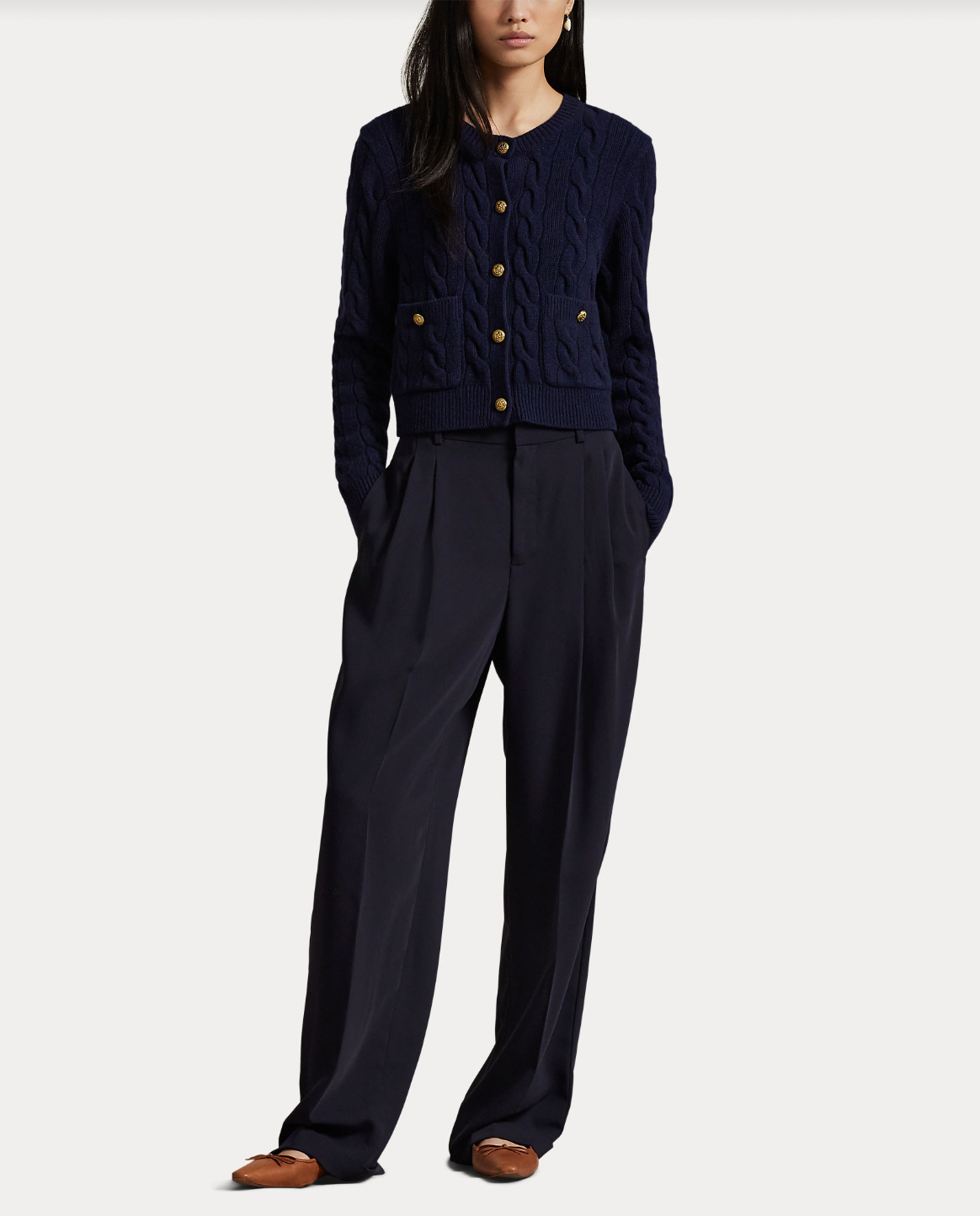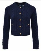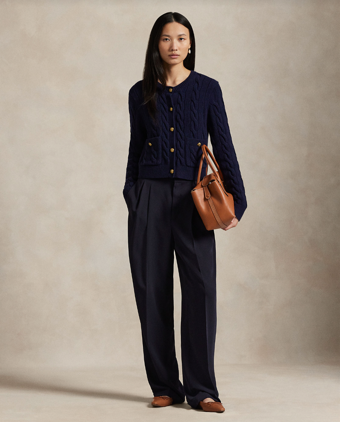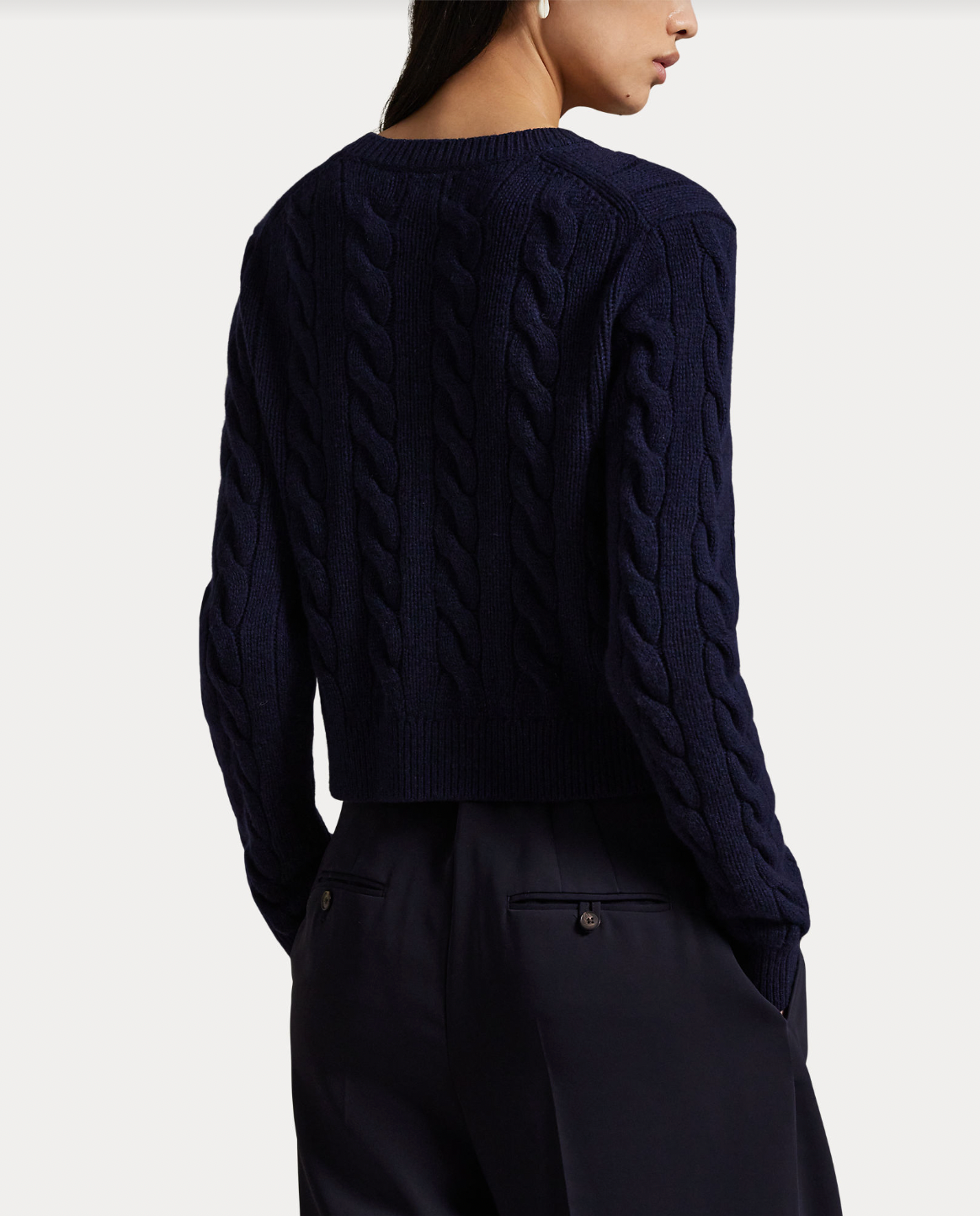 Nydelig mørkeblå cardigan fra Polo strikket i en blanding av ull og kashmir. Jakken er kabelstrikket og har et klassisk snitt med graverte messingknapper –et signaturbilde av den klassiske cardiganen.